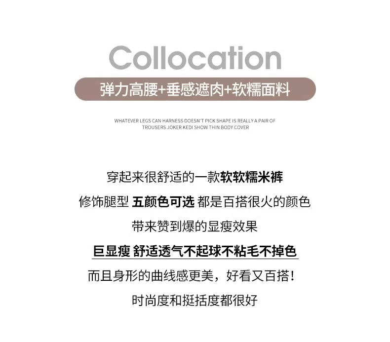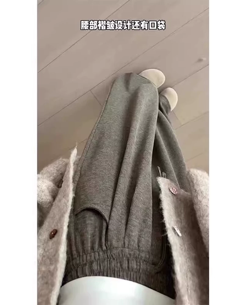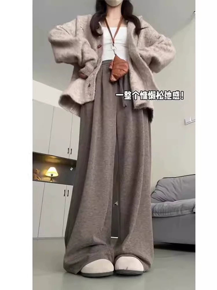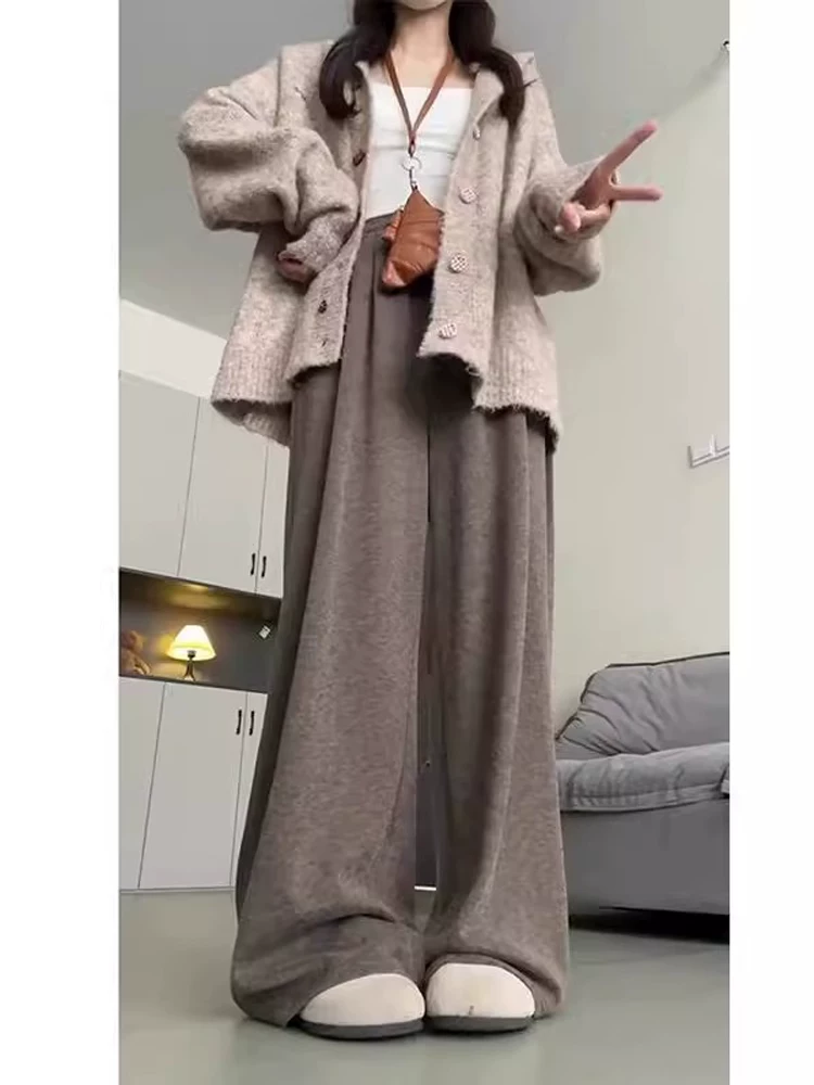 Quần gạo nếp màu nâu dành cho nữ, mùa thu đông, cỡ lớn, lót lông cừu, dày dặn, kiểu dáng lười biếng, lưng cao, dáng rộng, dáng rộng, quần ống rộng thông thường.