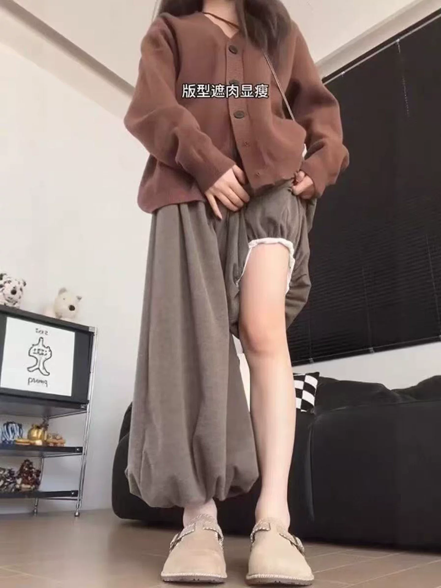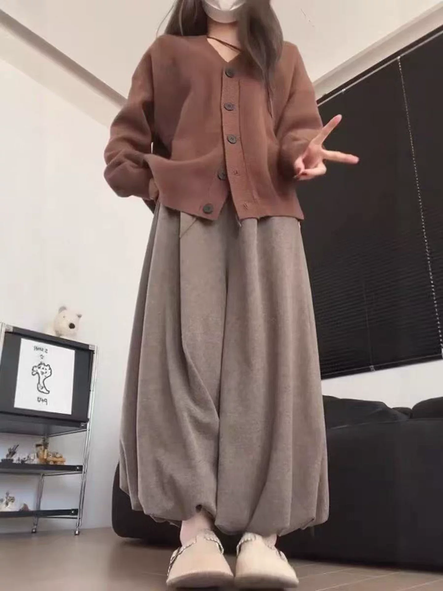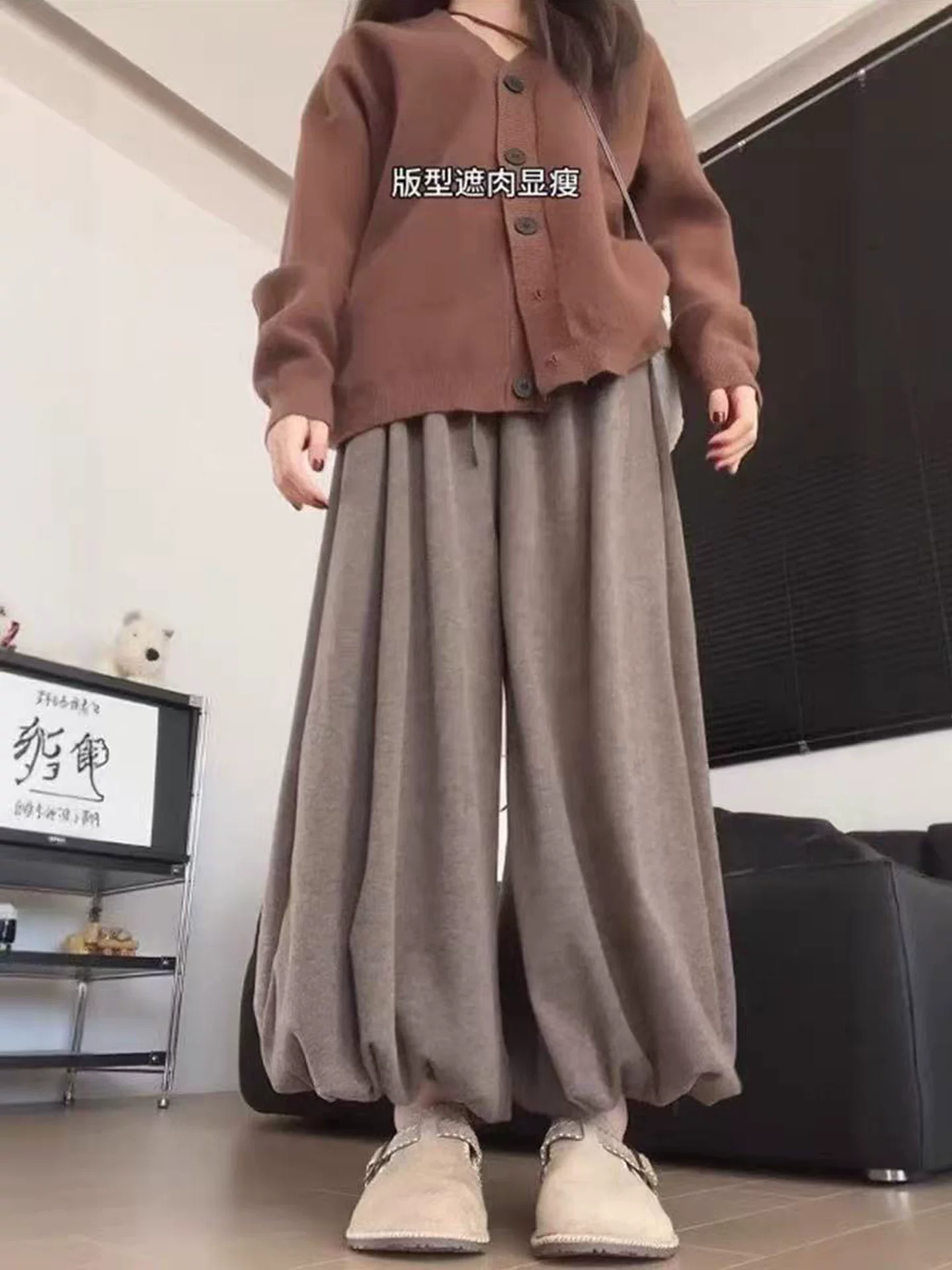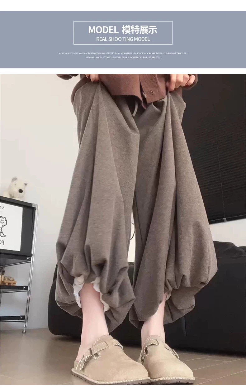 Quần hoa nâu cho nữ, mùa thu 2025, cỡ lớn, cạp cao, tôn dáng, quần đèn lồng, dáng nhỏ nhắn, ống rộng, quần chất liệu mềm mại.