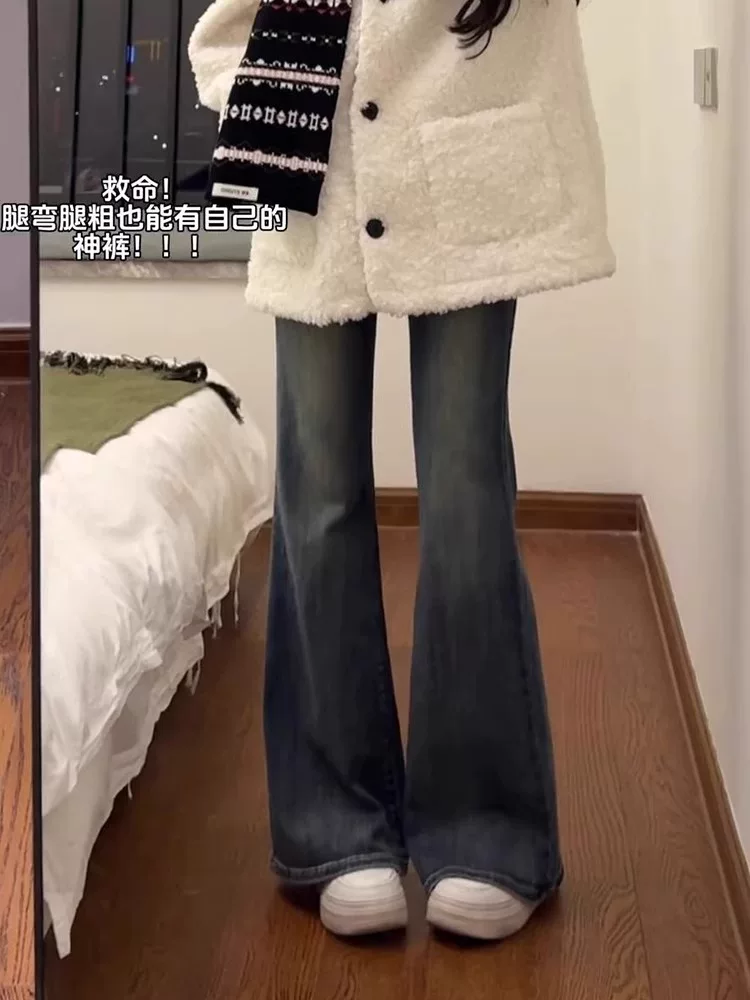 Quần jean bootcut màu xanh retro dành cho nữ mùa thu đông, lót lông cừu, size lớn, giúp thon gọn dáng người, cạp cao, co giãn, kiểu dáng chuông, phù hợp với dáng người quả lê