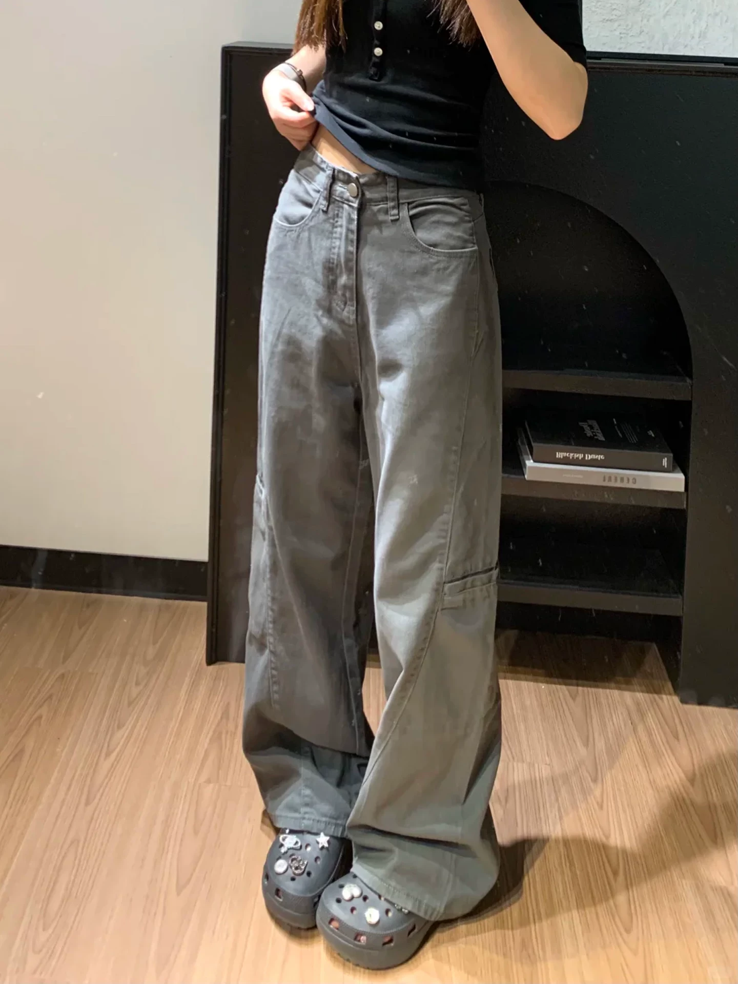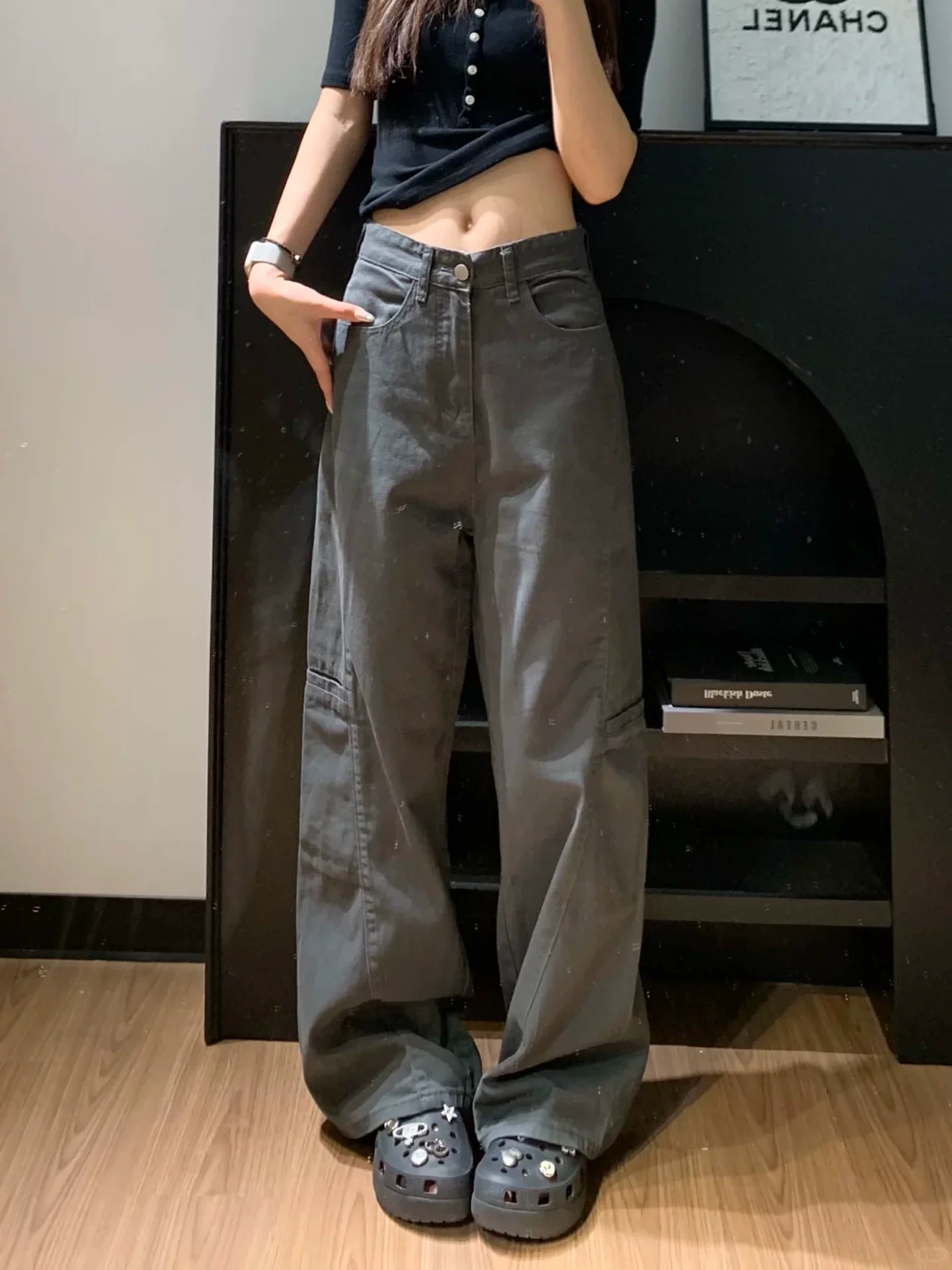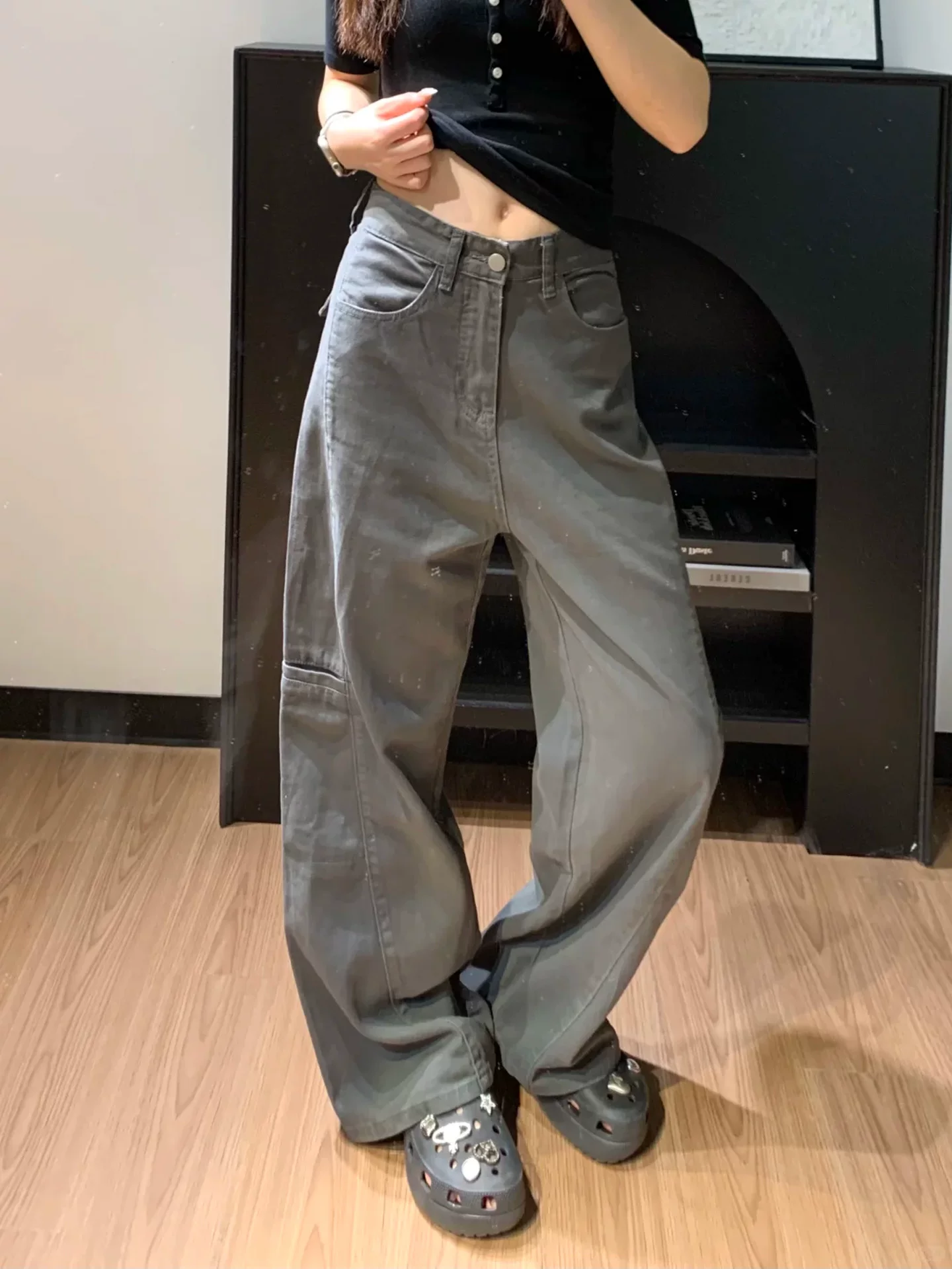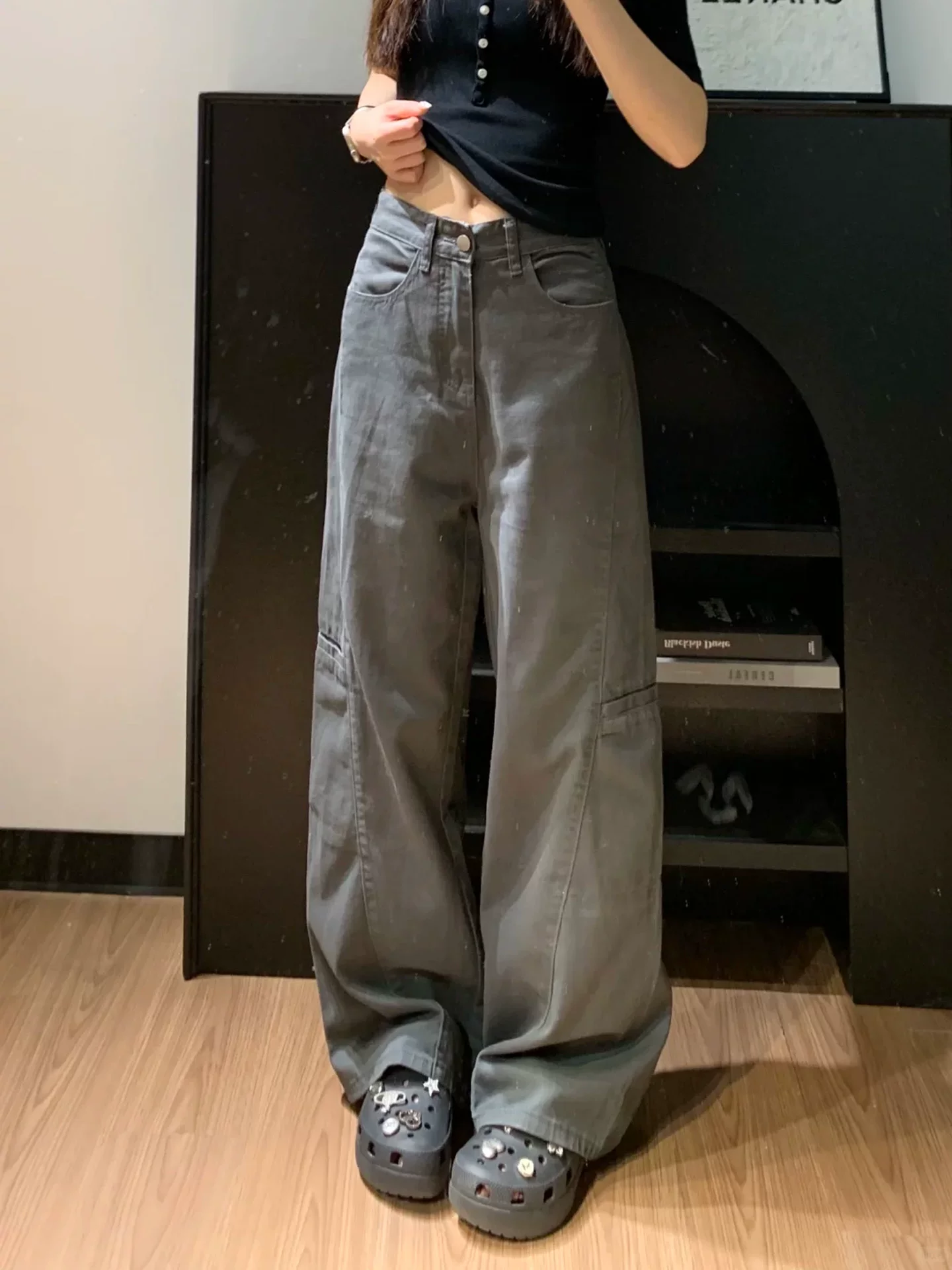Quần jean công sở màu xám dành cho nữ có thân hình hình quả lê, quần ống rộng cạp cao che hông dáng rộng, cỡ lớn mùa thu
