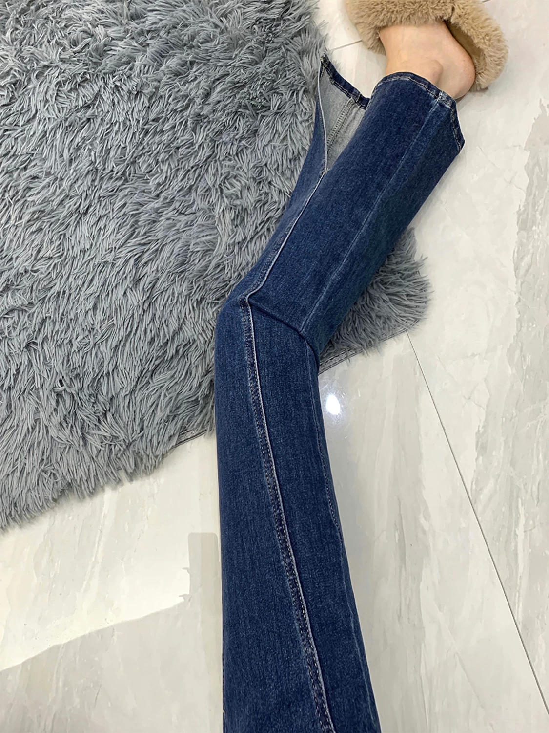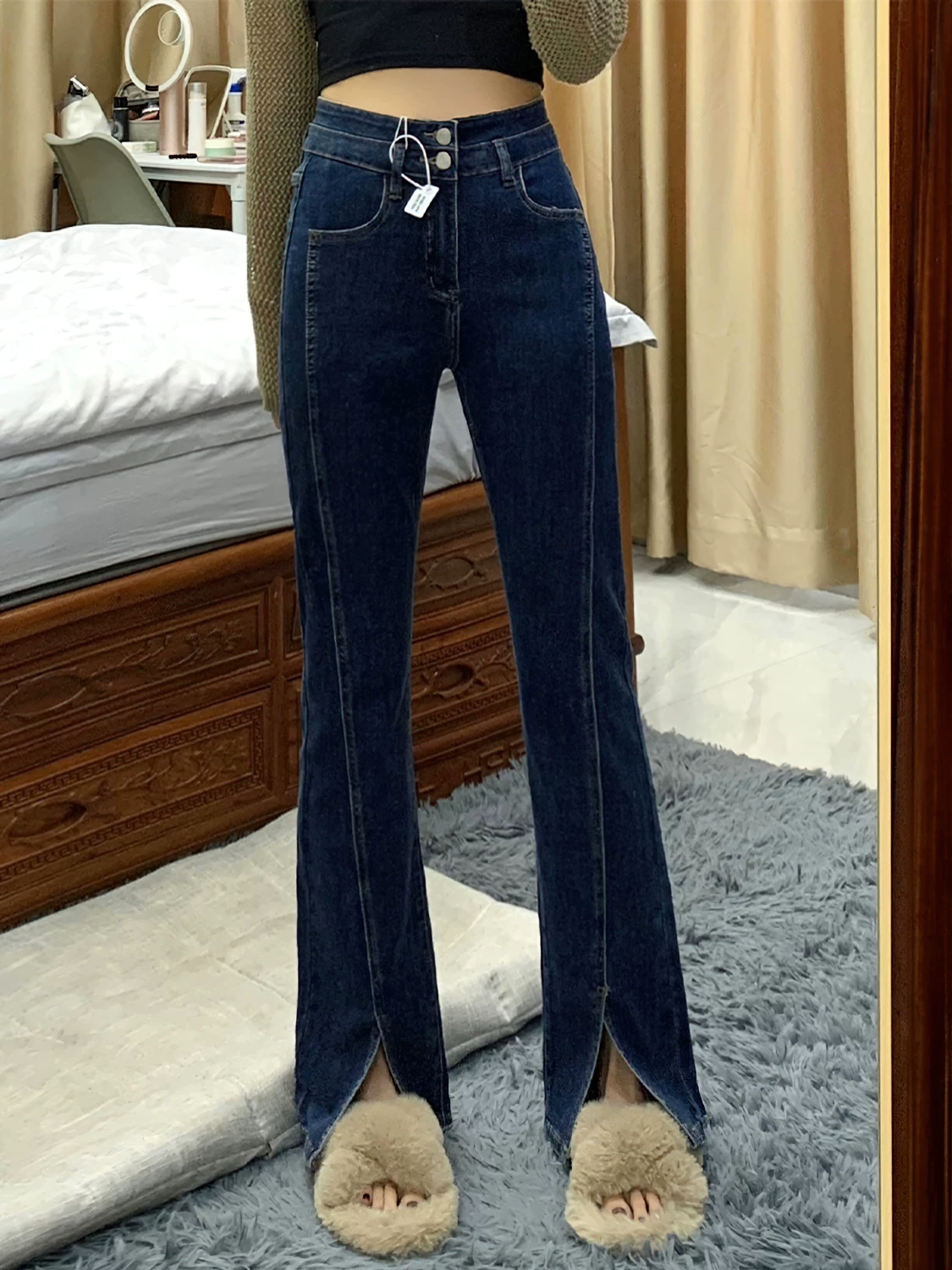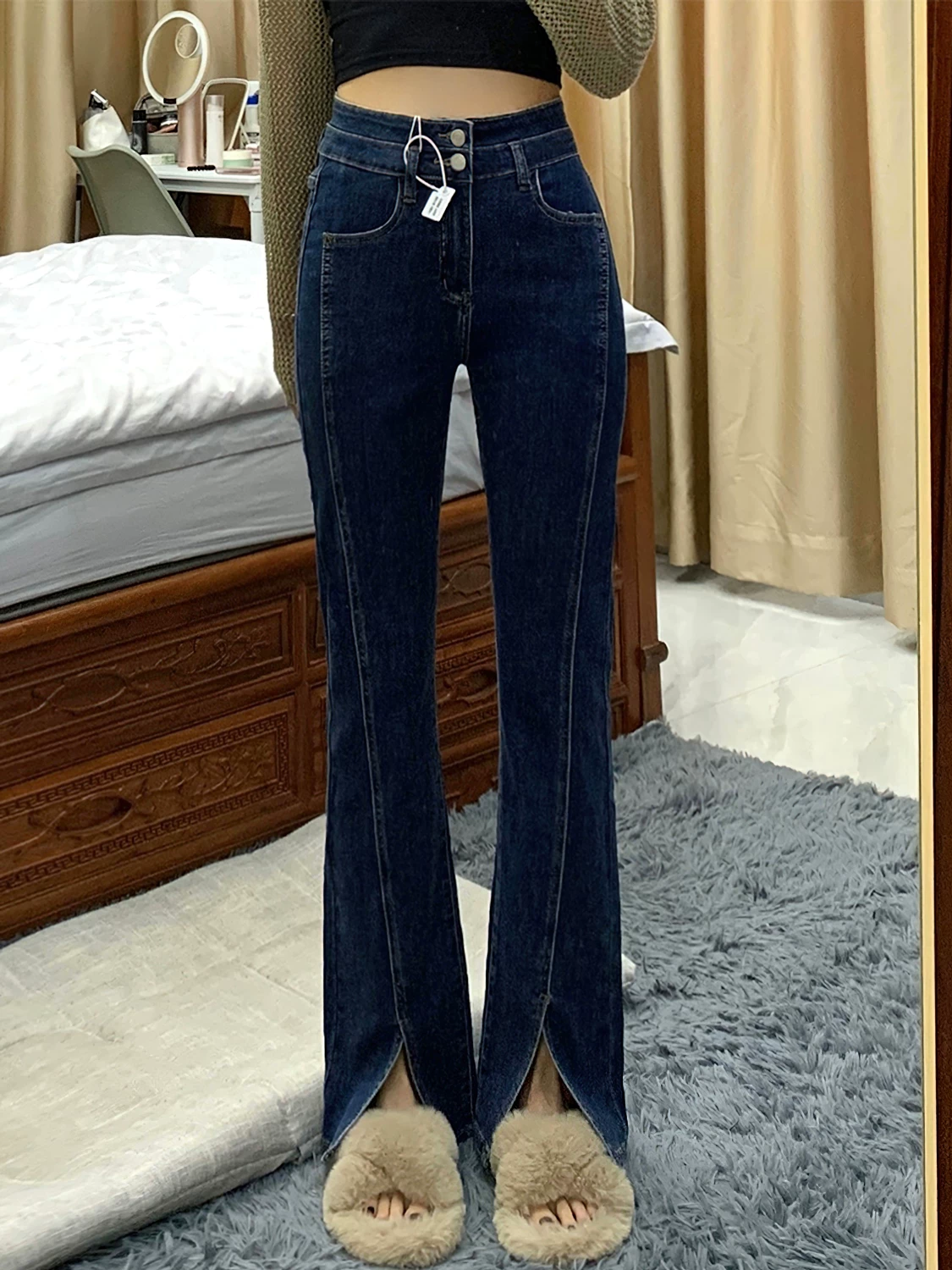 - Quần jean dáng chữ lê, xẻ tà hơi rộng dành cho nữ, cỡ lớn, đầu thu, lưng cao, co giãn, che hông, giảm béo, quần ống thẳng