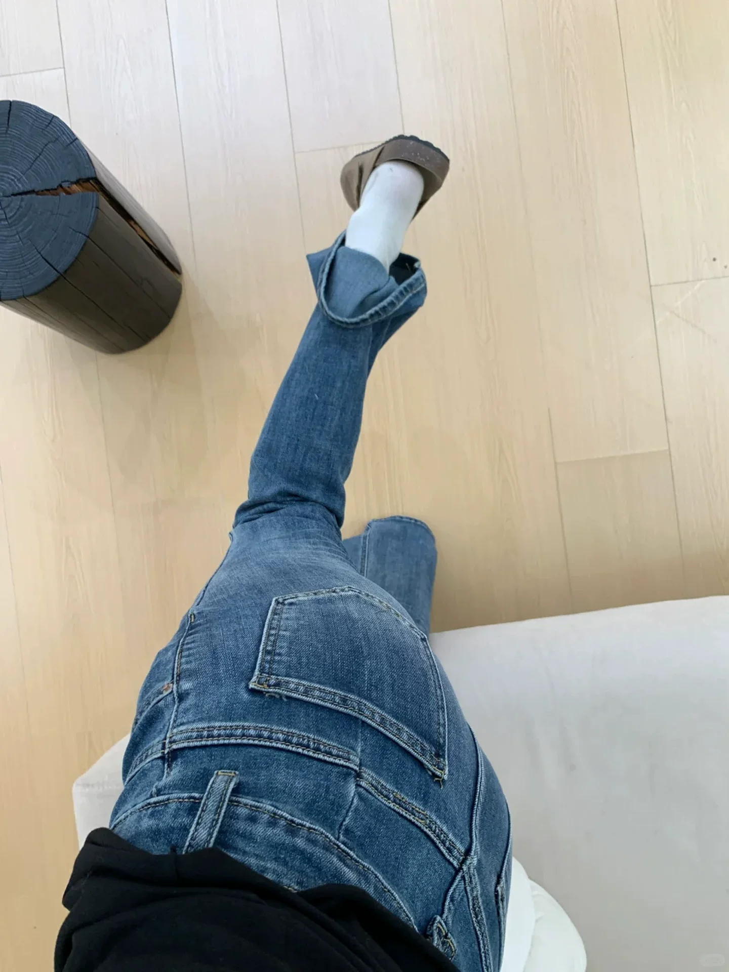 Quần jean dáng chuông màu xanh đậm dành cho nữ, size lớn mùa thu, cạp cao, co giãn, che hông, quần bootcut tôn dáng.
