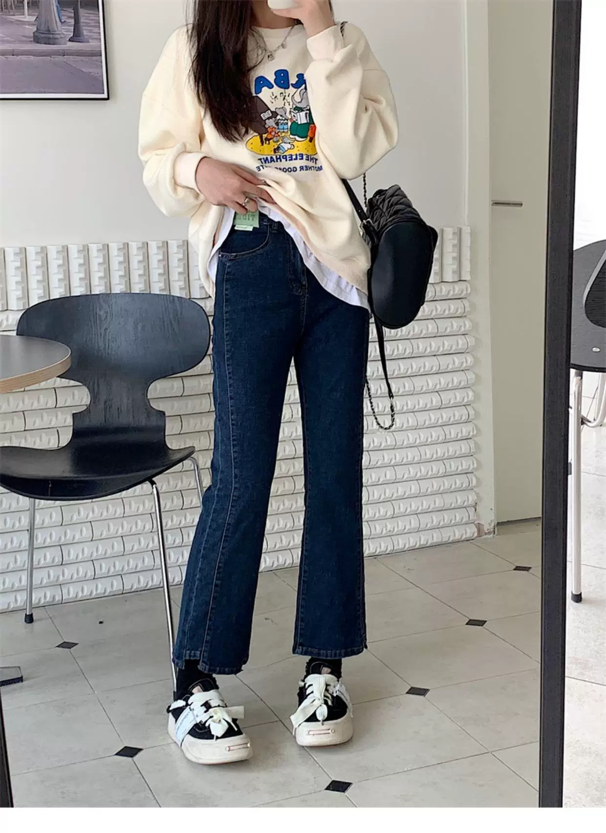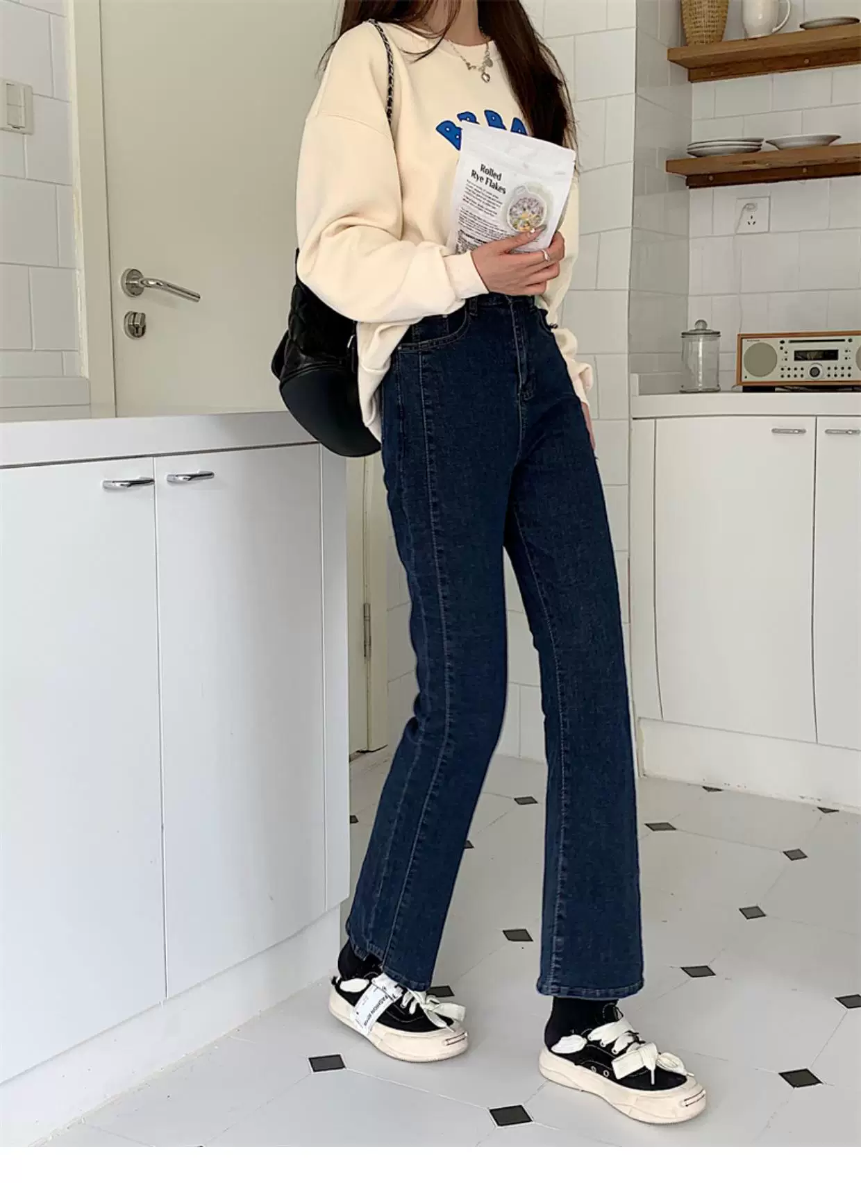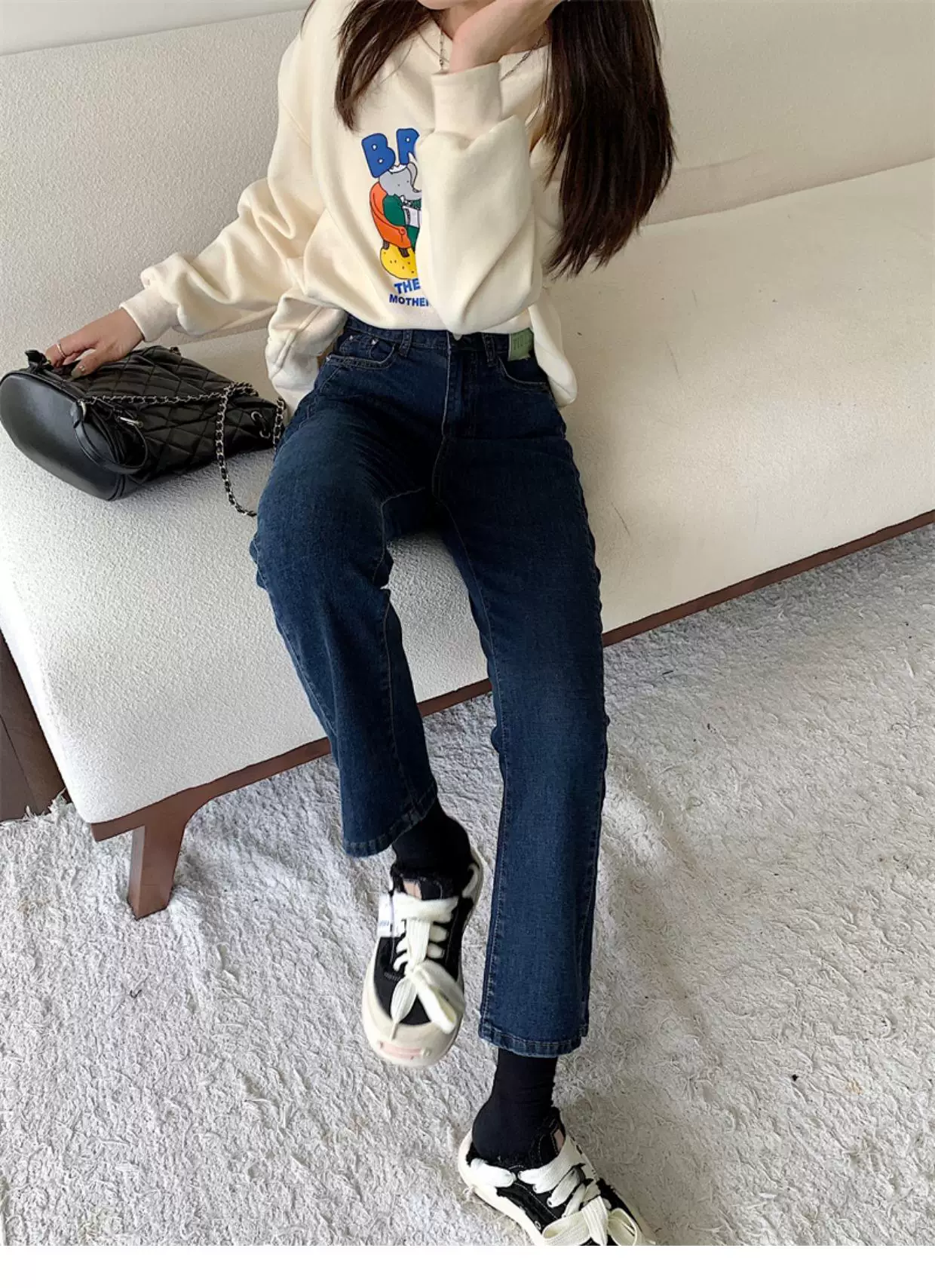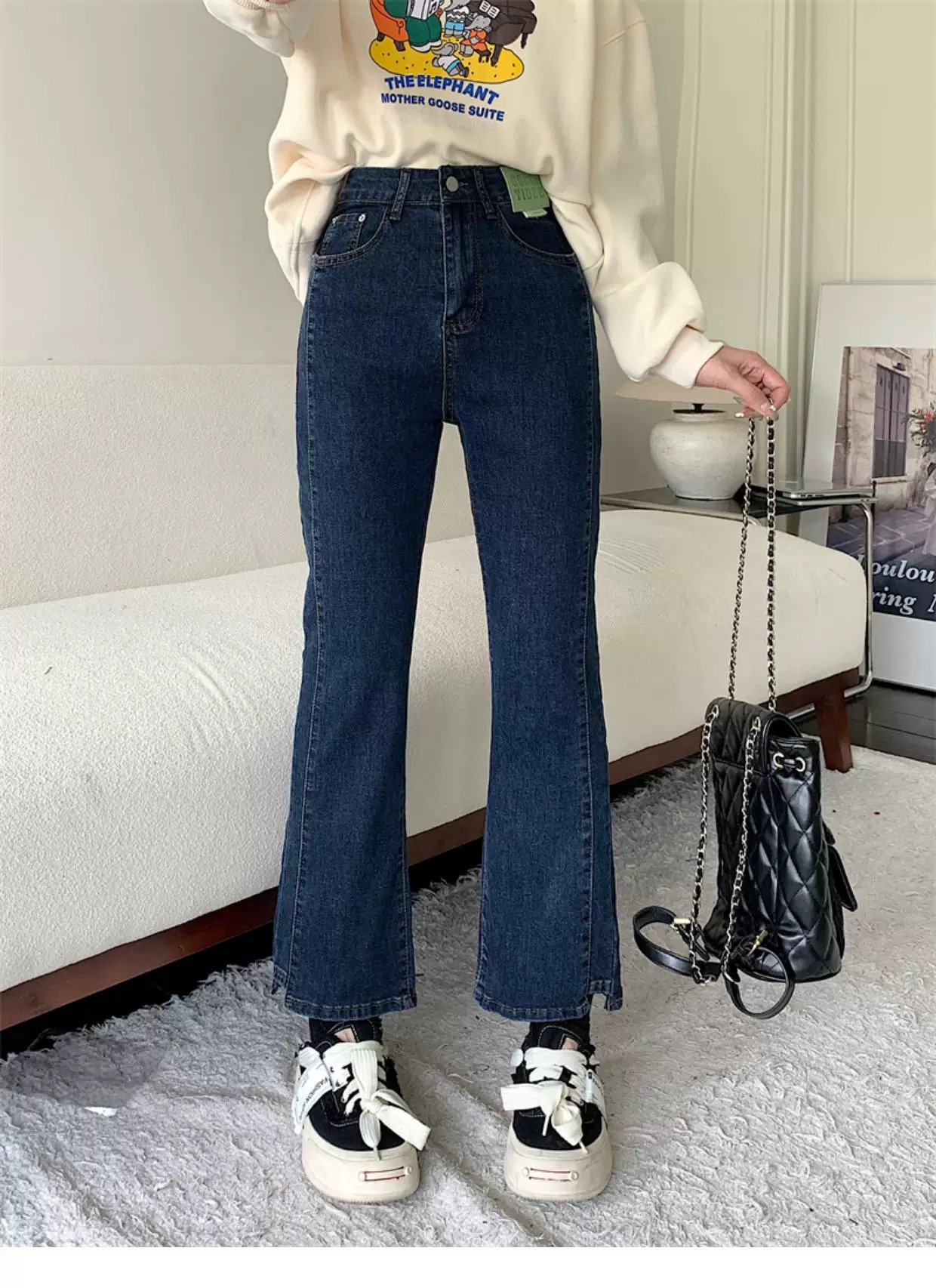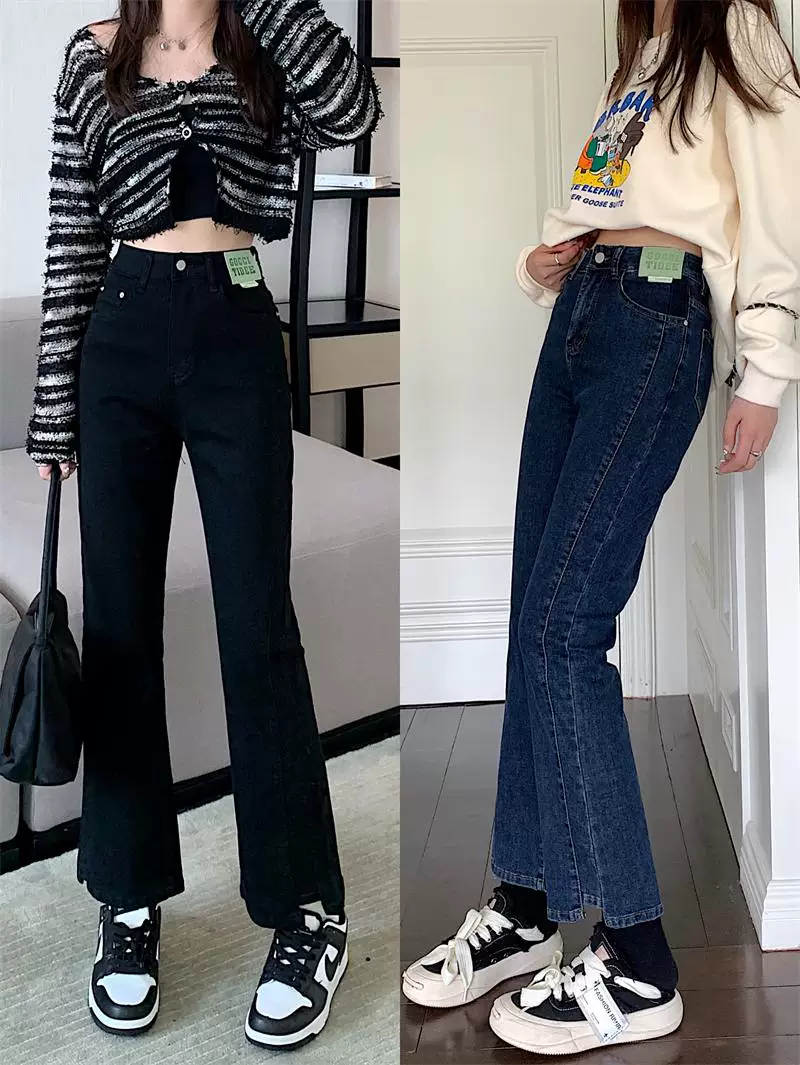 - Quần jean dáng chuông nhỏ nhắn dành cho mùa thu đông, lót lông cừu, hơi mũm mĩm, cạp cao, che hông, quần ống đứng tôn dáng