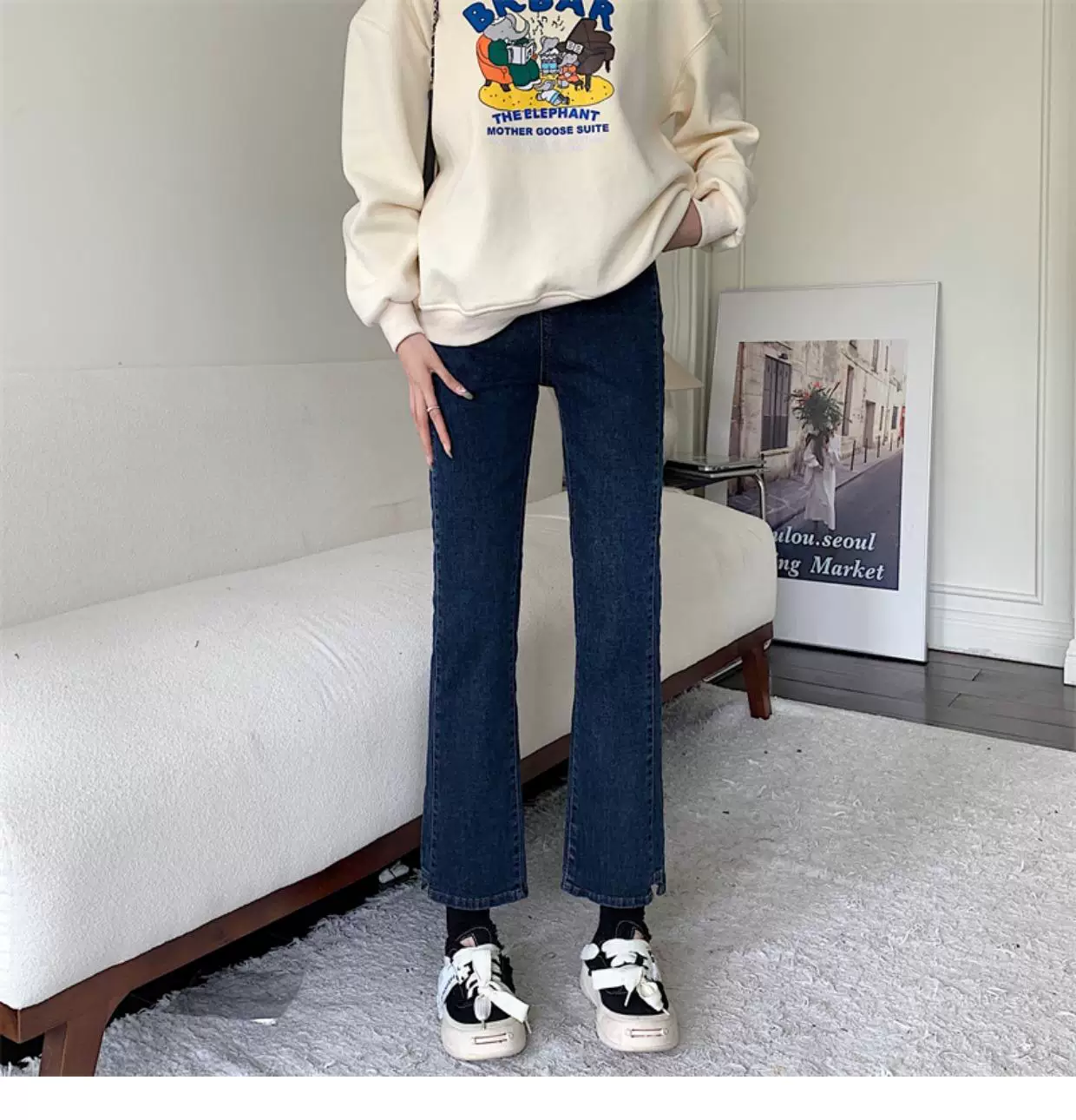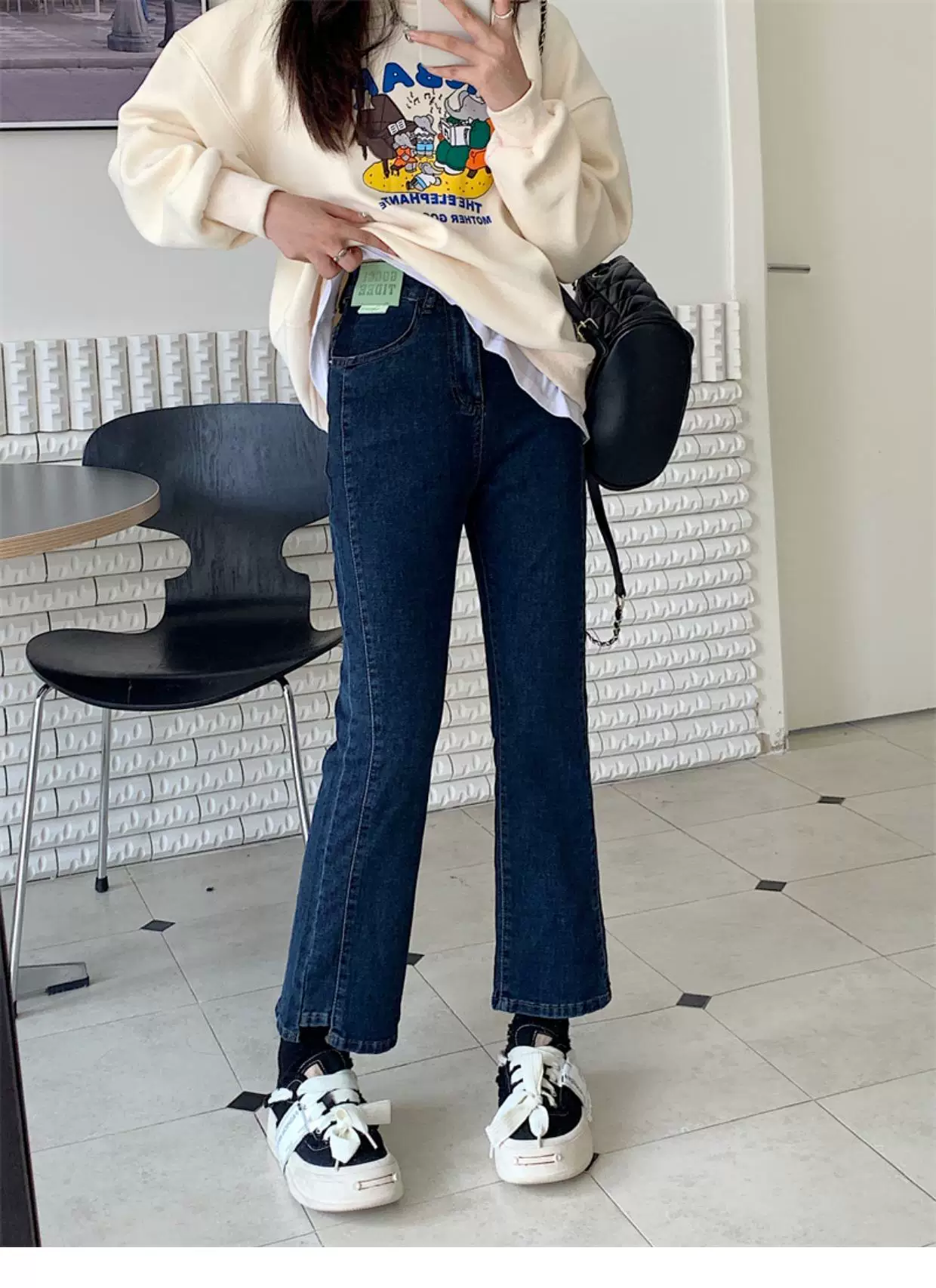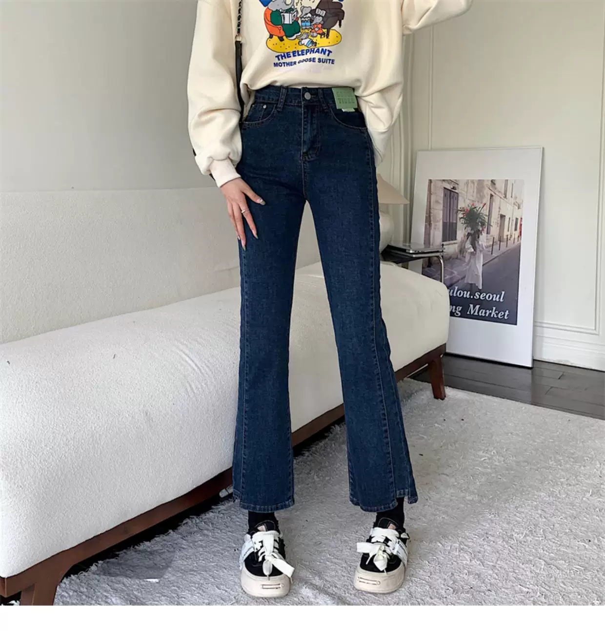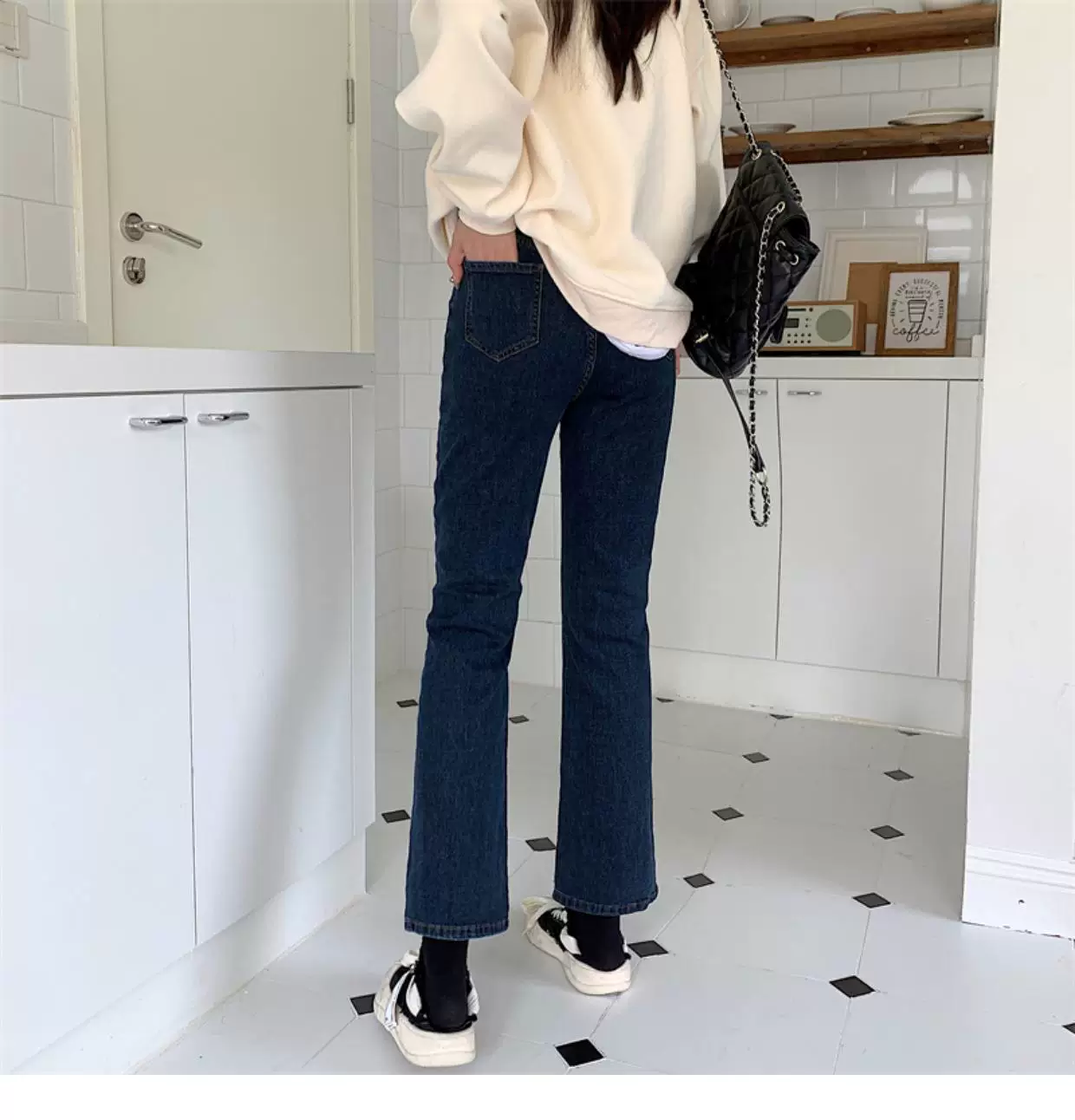 - Quần jean dáng chuông nhỏ nhắn dành cho mùa thu đông, lót lông cừu, hơi mũm mĩm, cạp cao, che hông, quần ống đứng tôn dáng