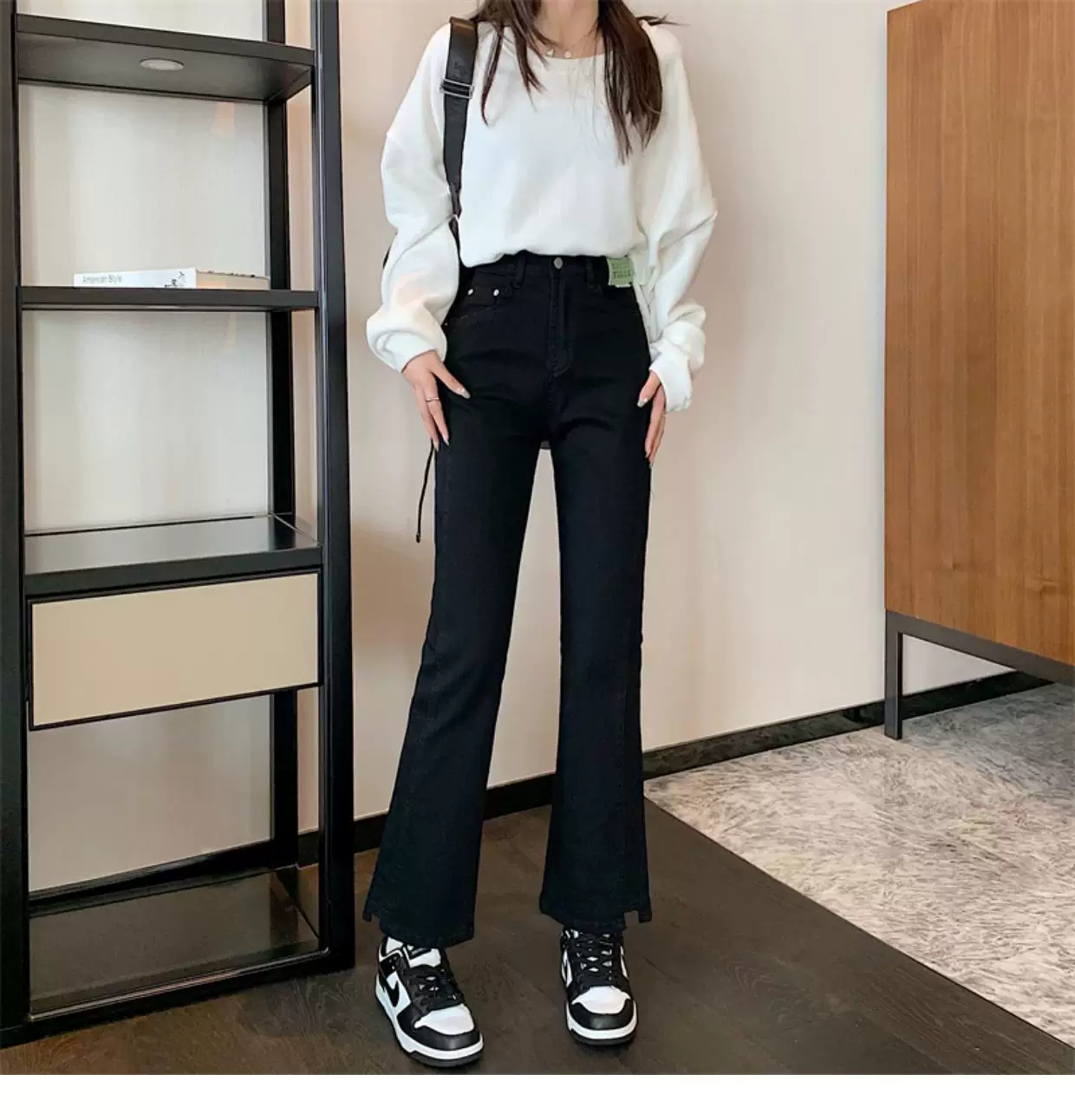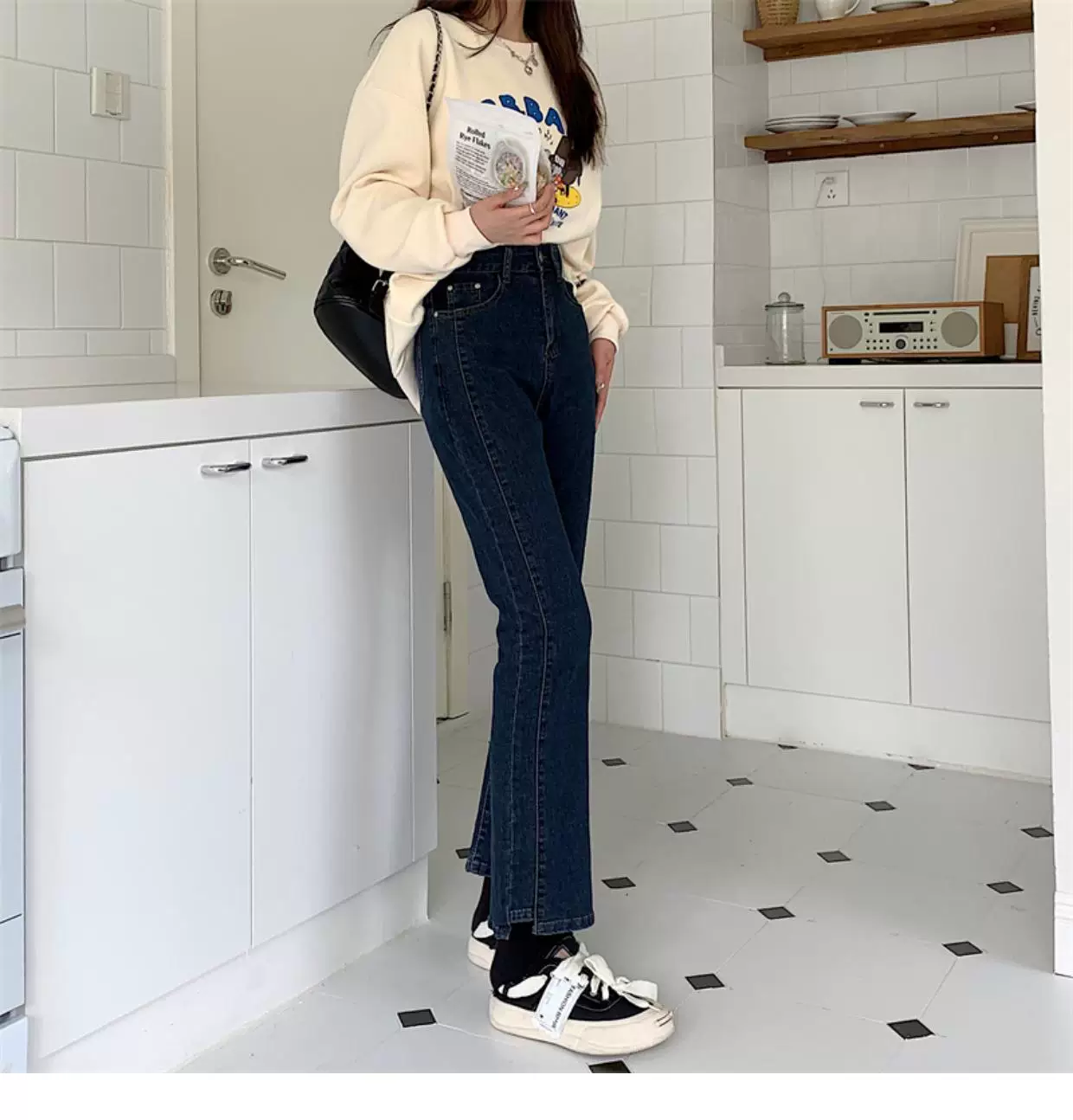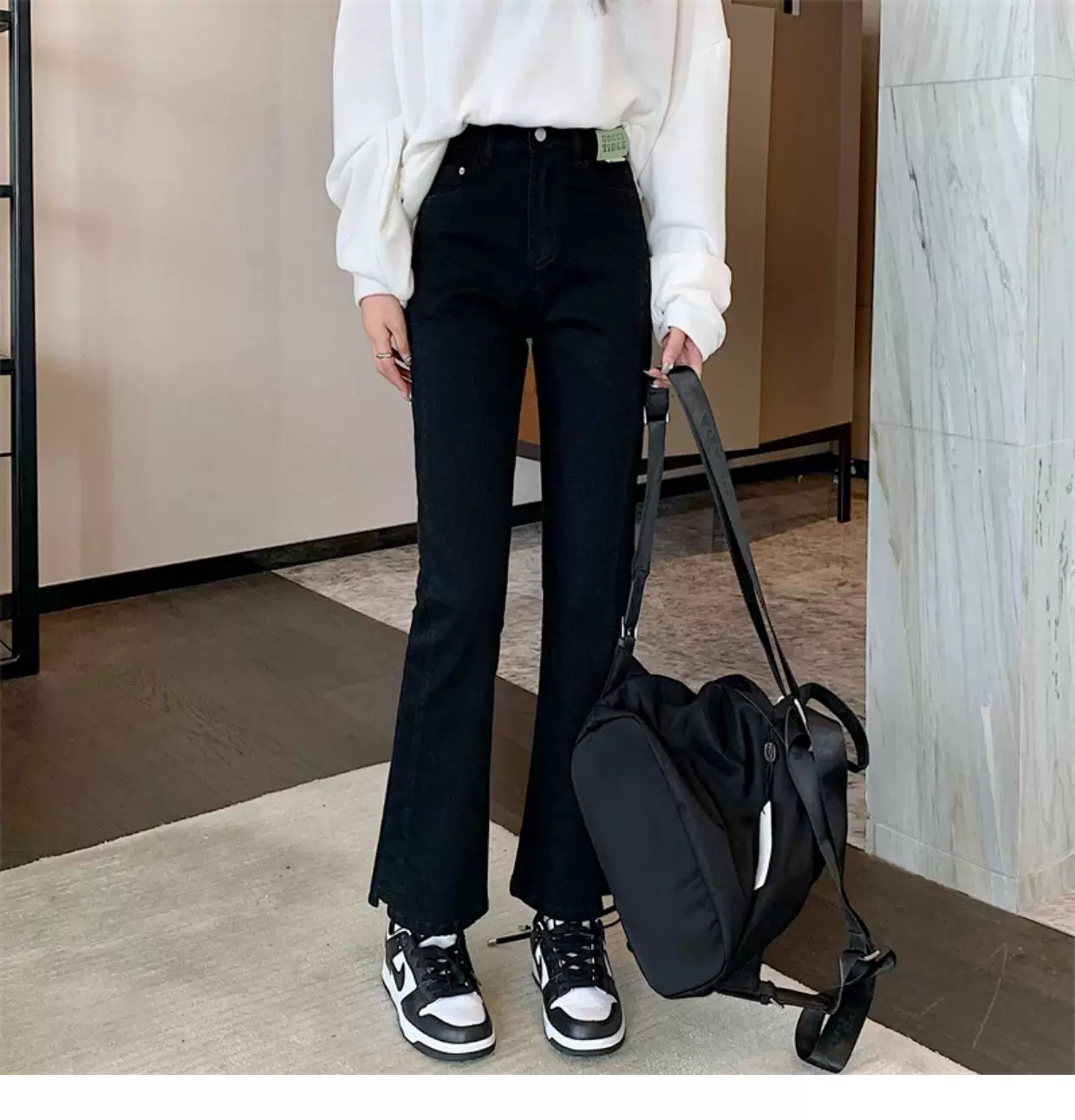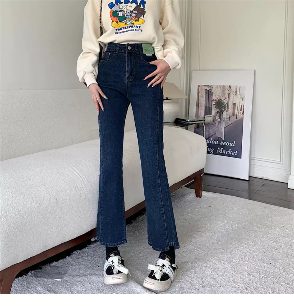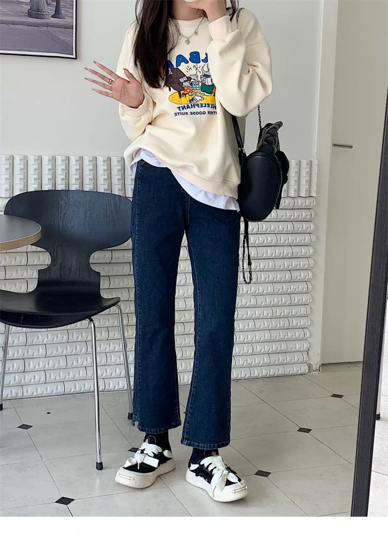 - Quần jean dáng chuông nhỏ nhắn dành cho mùa thu đông, lót lông cừu, hơi mũm mĩm, cạp cao, che hông, quần ống đứng tôn dáng