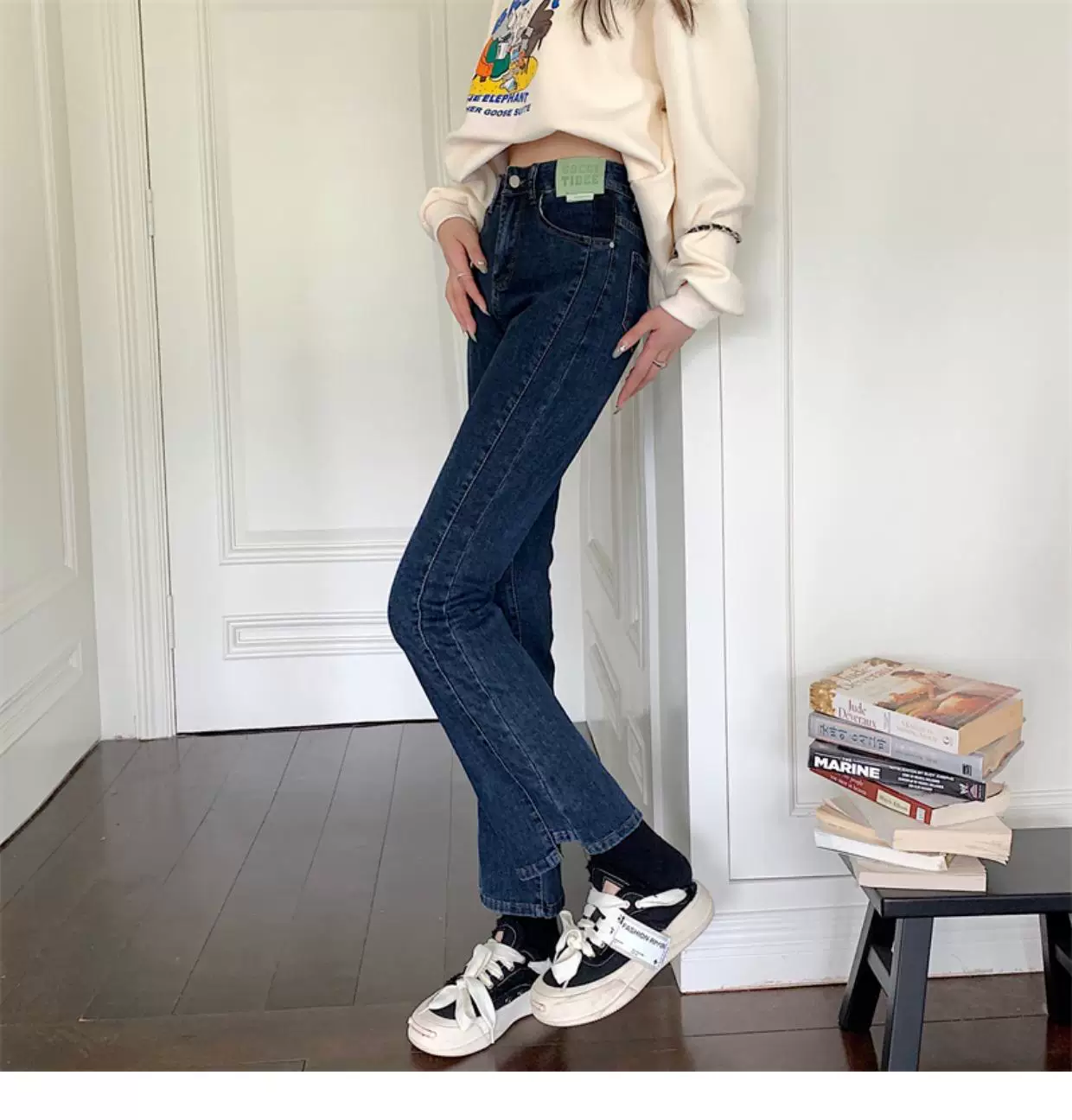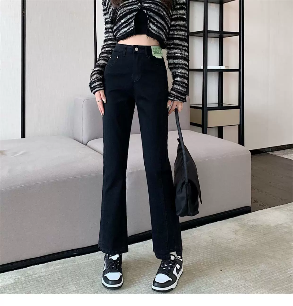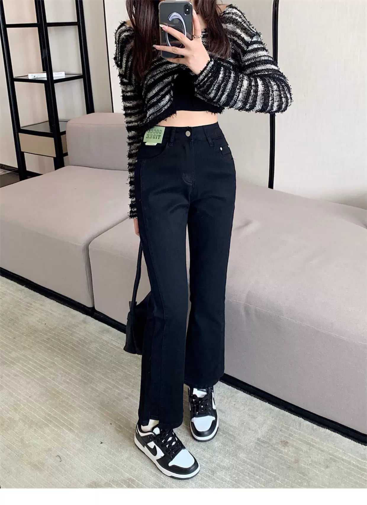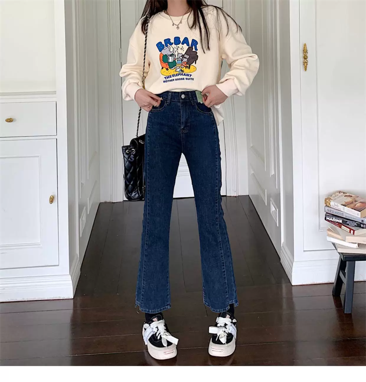 - Quần jean dáng chuông nhỏ nhắn dành cho mùa thu đông, lót lông cừu, hơi mũm mĩm, cạp cao, che hông, quần ống đứng tôn dáng