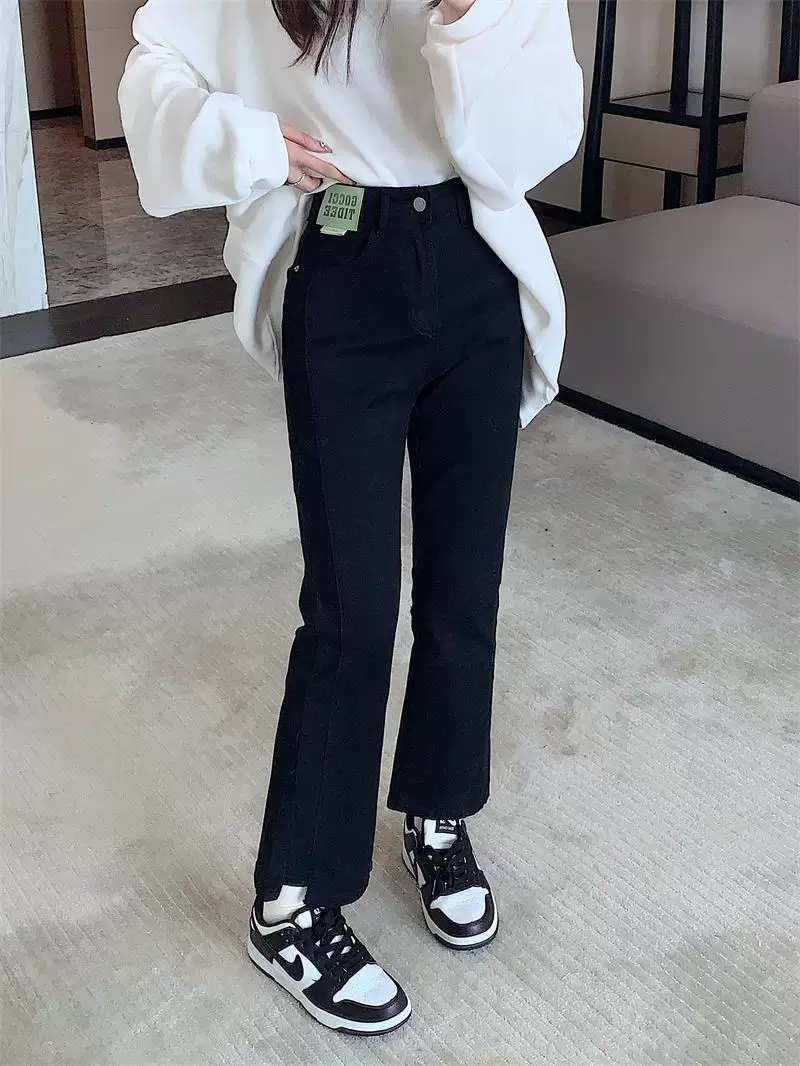 Quần jean dáng chuông nhỏ nhắn dành cho mùa thu đông, lót lông cừu, hơi mũm mĩm, cạp cao, che hông, quần ống đứng tôn dáng