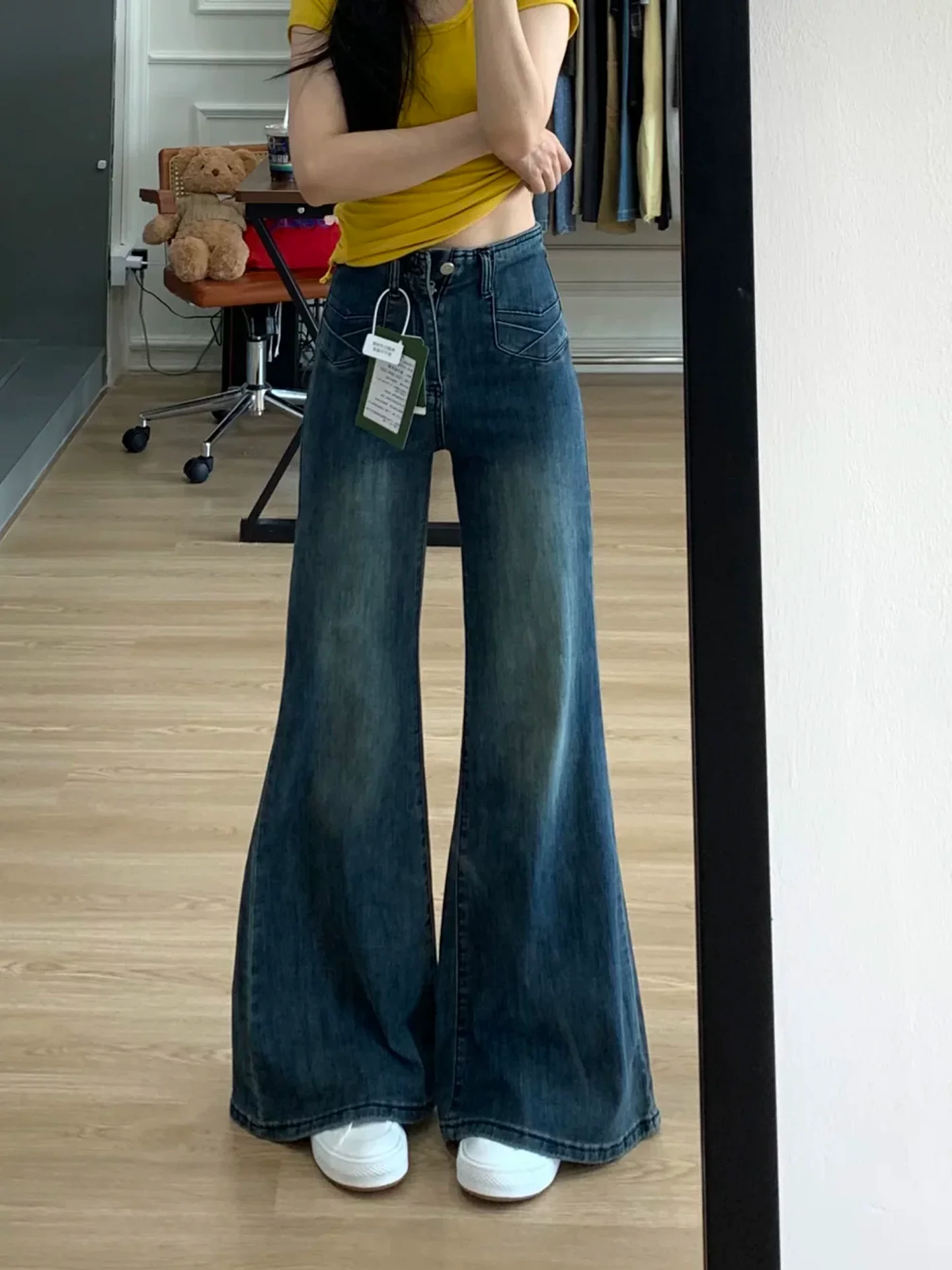 - Quần jean dáng loe cổ điển dành cho nữ, mùa thu, size lớn, cạp cao, co giãn, mềm mại, che hông, quần ống chuông tôn dáng