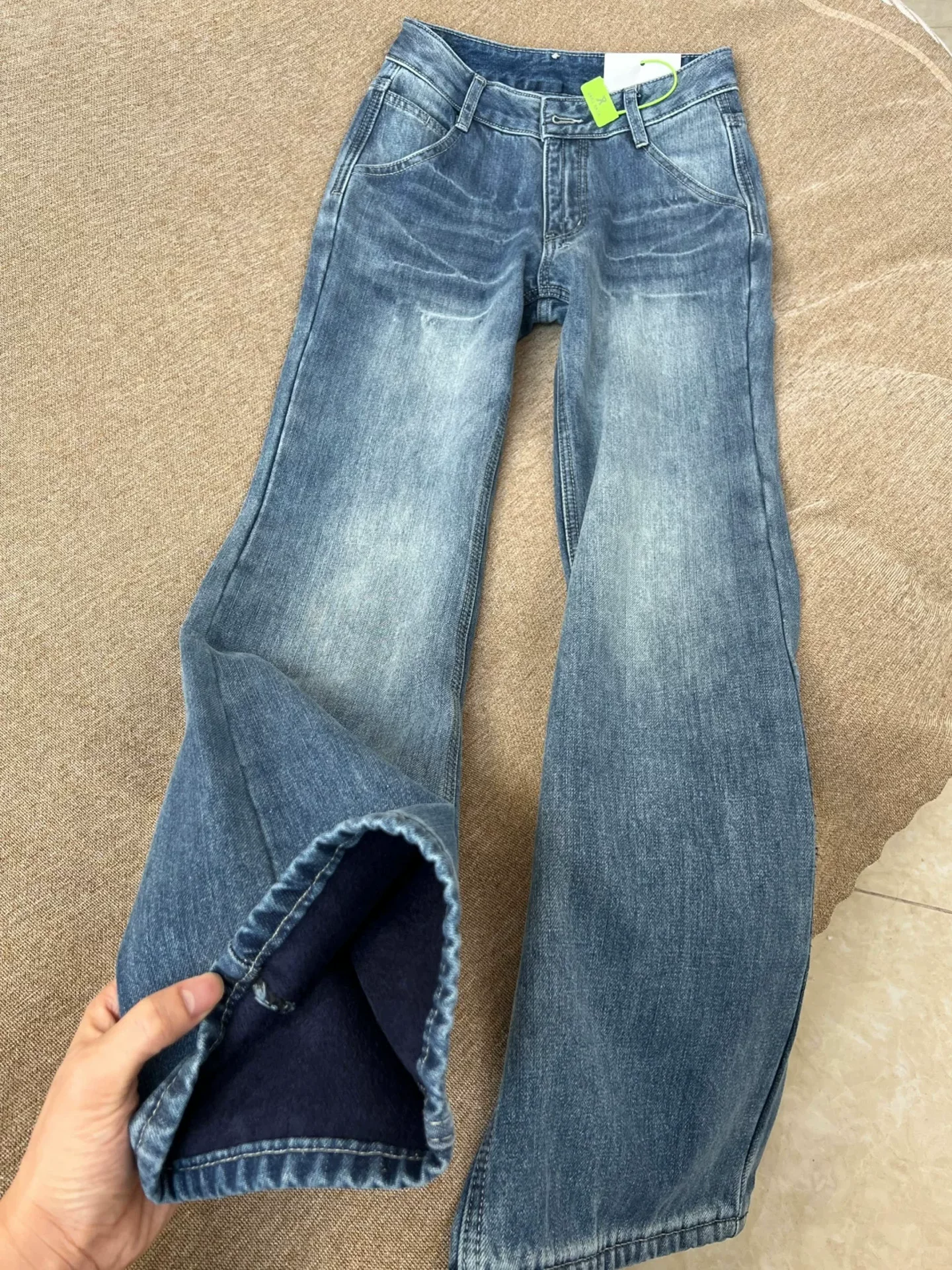- Quần jean dáng loe kiểu Mỹ cổ điển dành cho nữ, lót lông cừu mùa đông, dày dặn, cỡ lớn, cạp cao, tôn dáng, không bó sát, quần ống chuông