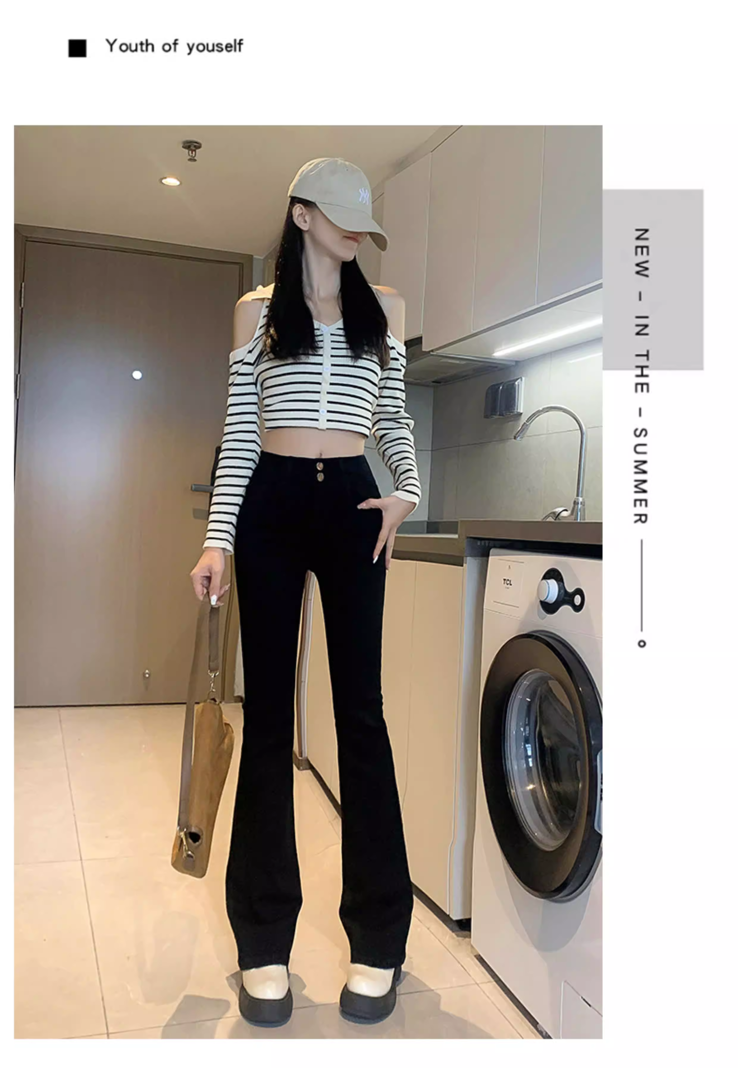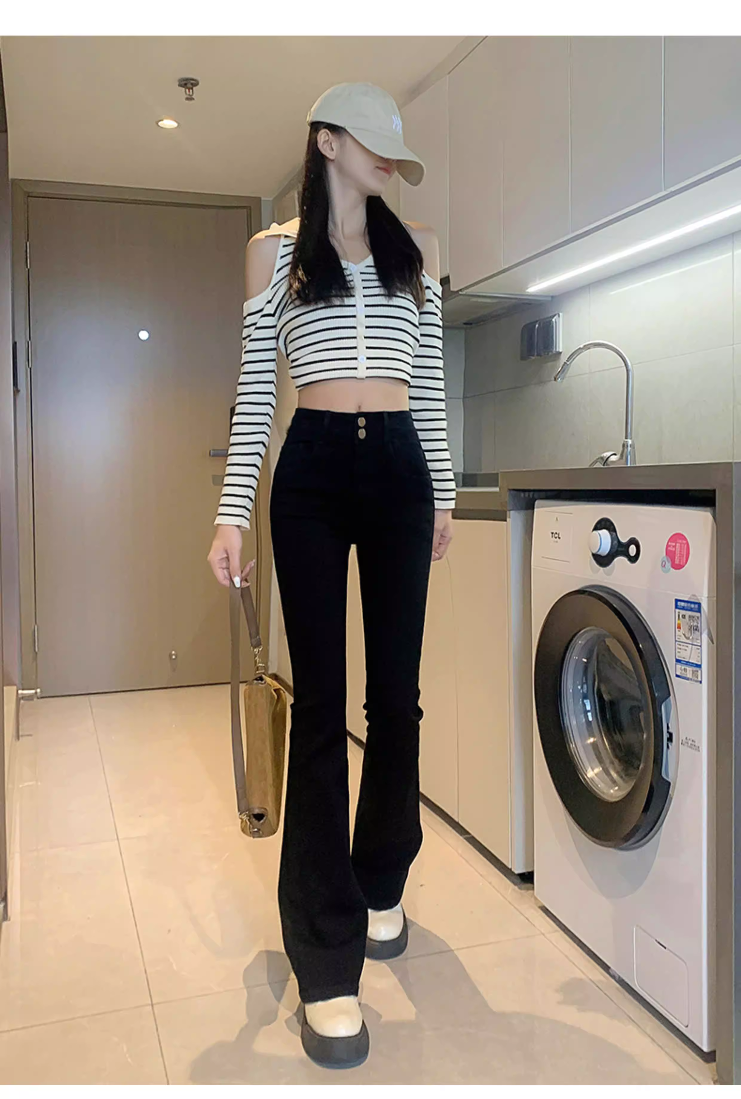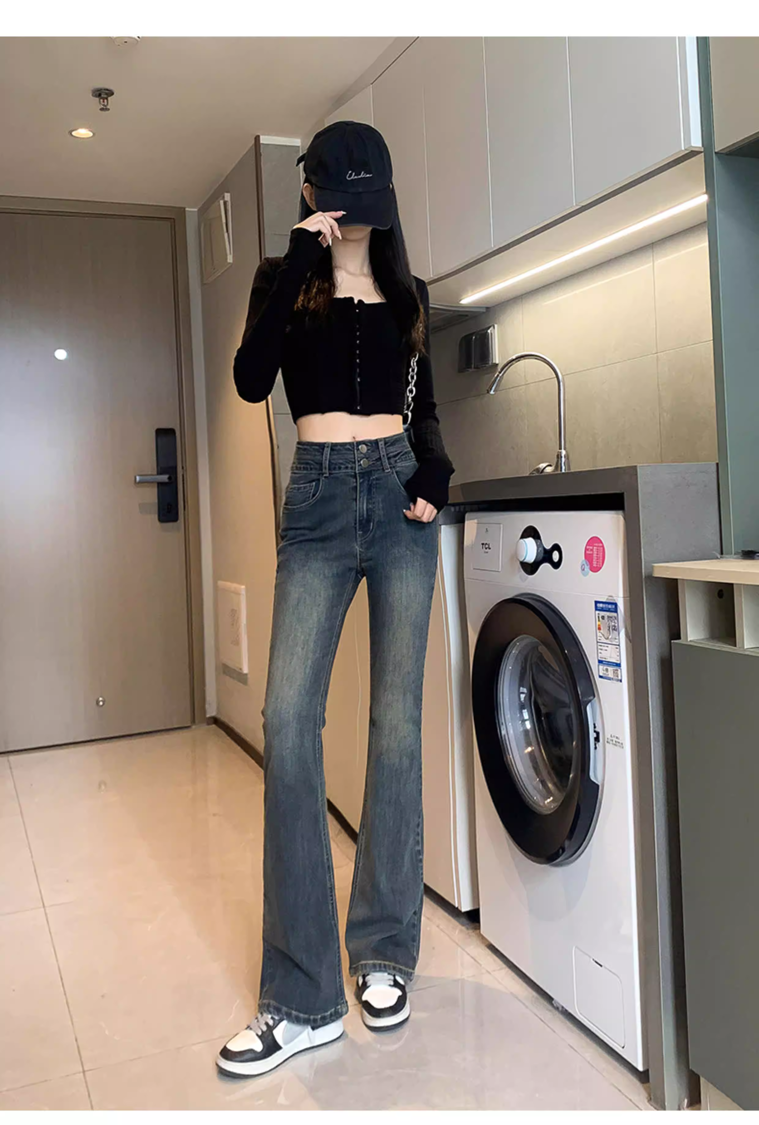 - Quần jean dáng loe kiểu Mỹ La Chapelle dành cho phụ nữ nhỏ nhắn, quần ống loe cạp cao lót lông mùa thu đông 2025 mới
