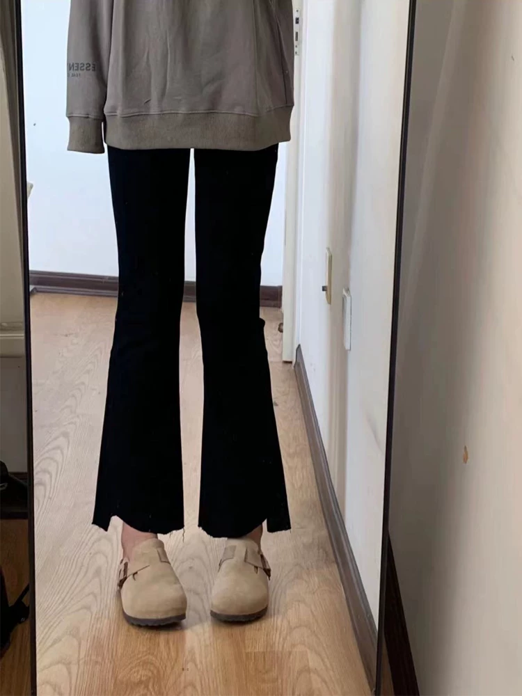 Quần jean dáng quả lê không đều cho phụ nữ cỡ lớn, phong cách đầu thu, lưng cao, co giãn, che hông, giảm béo, quần ống loe nhỏ nhắn