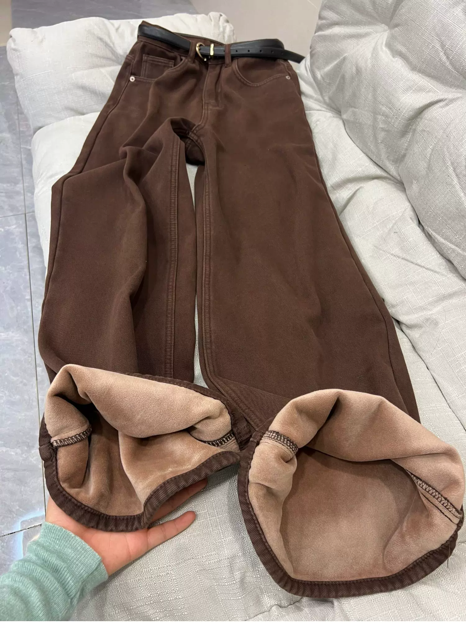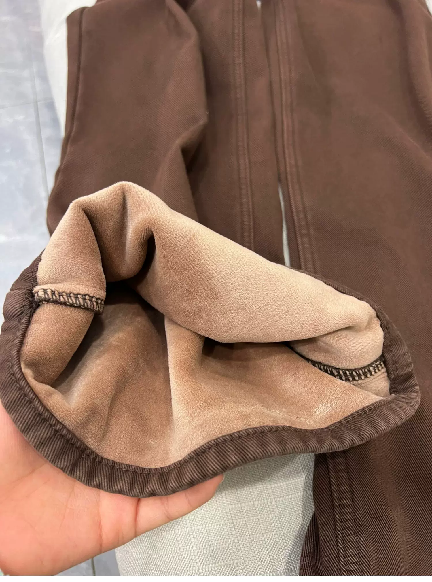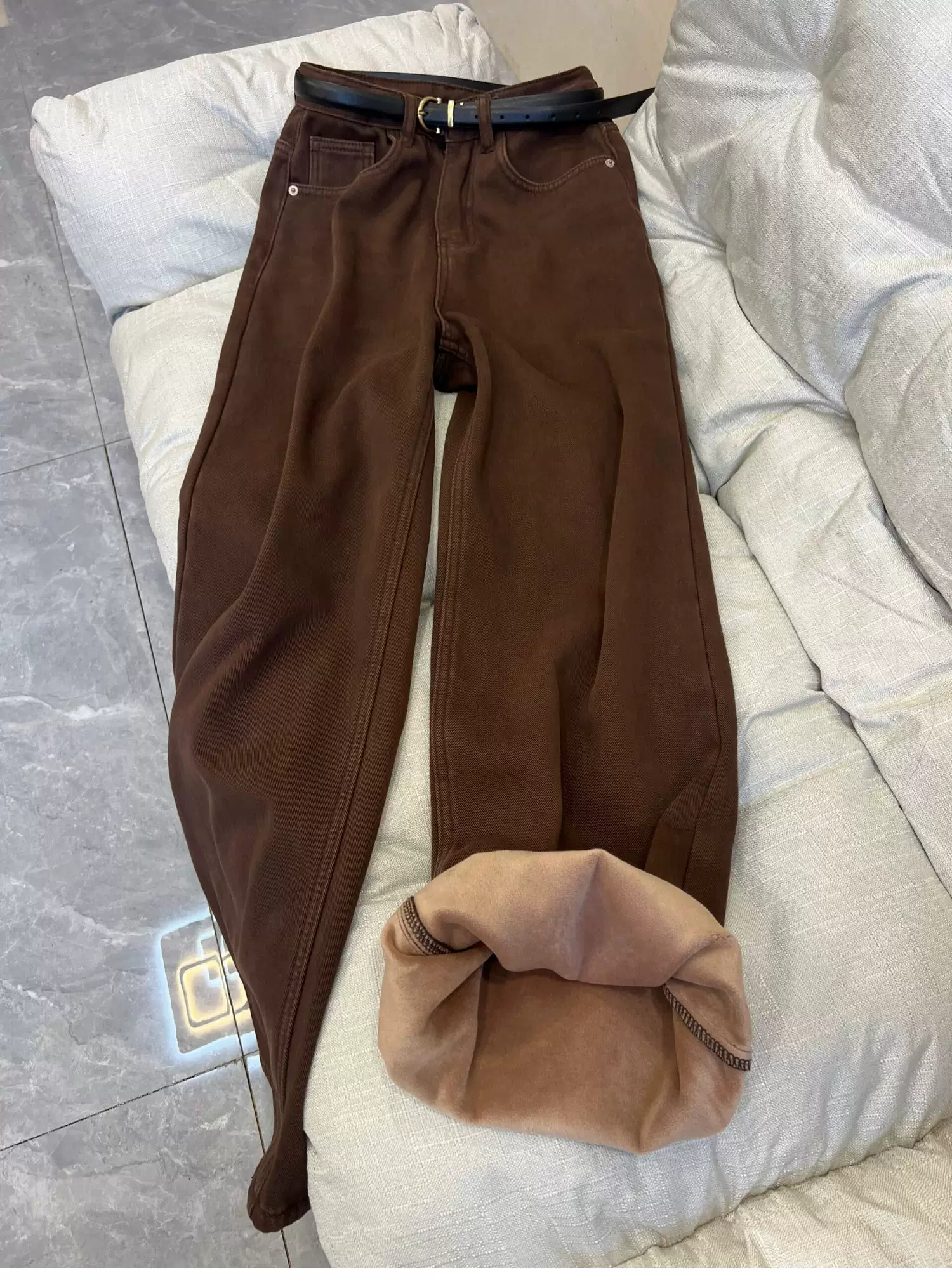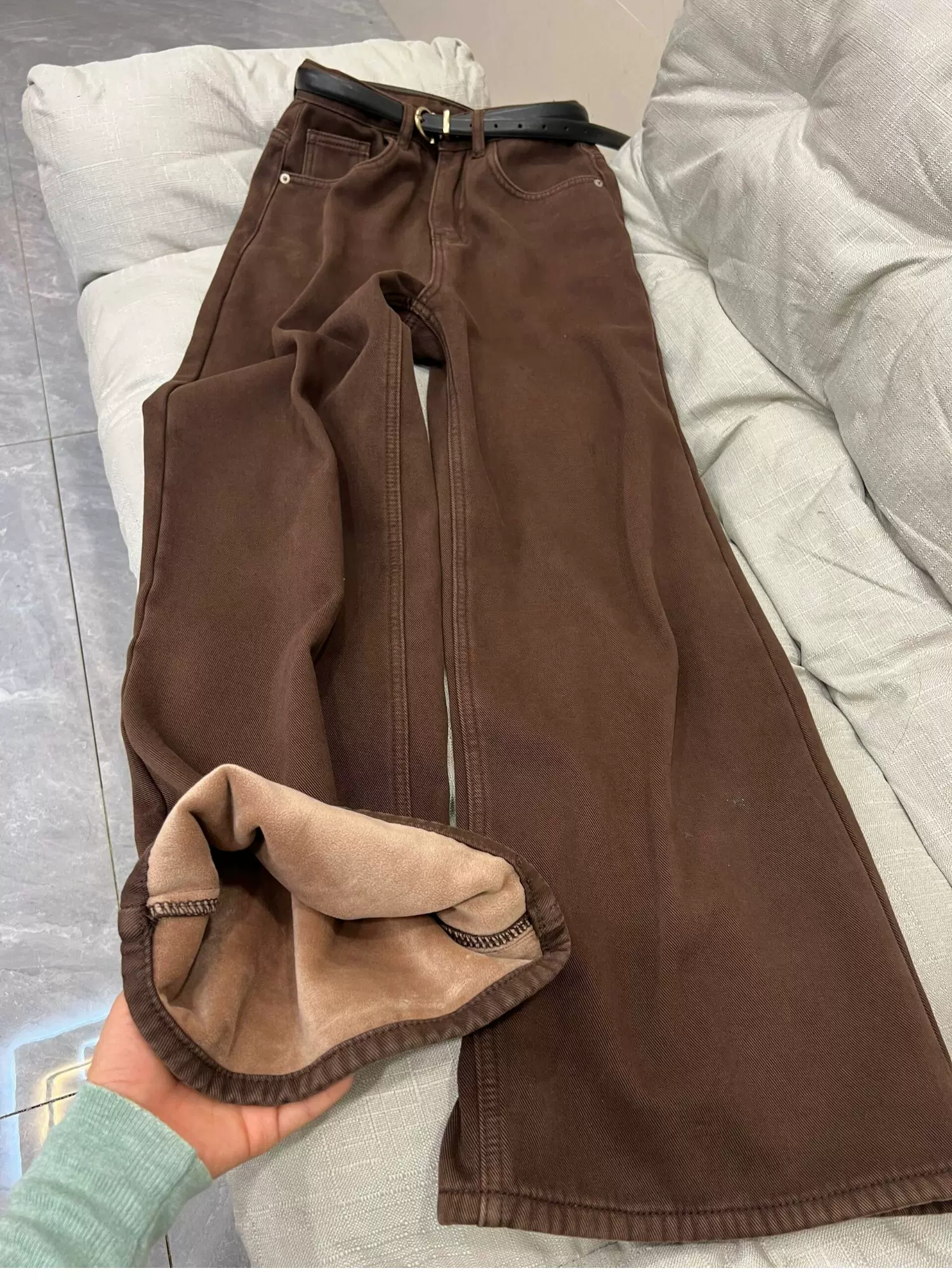 - Quần jean dày lót lông màu nâu cà phê cổ điển dành cho nữ, mùa thu đông, cỡ lớn, lưng cao, dáng rộng, giảm béo, quần ống rộng ống thẳng.