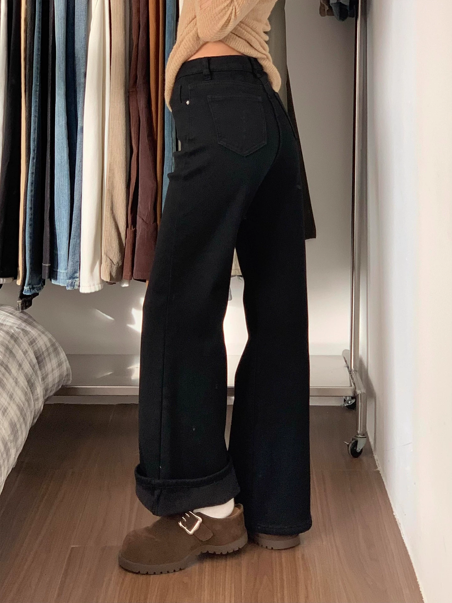 - Quần jean đen cạp cao dáng loe dành cho nữ, mùa đông, size lớn, lót lông cừu, dày dặn, dáng quả lê, co giãn, quần ống chuông tôn dáng