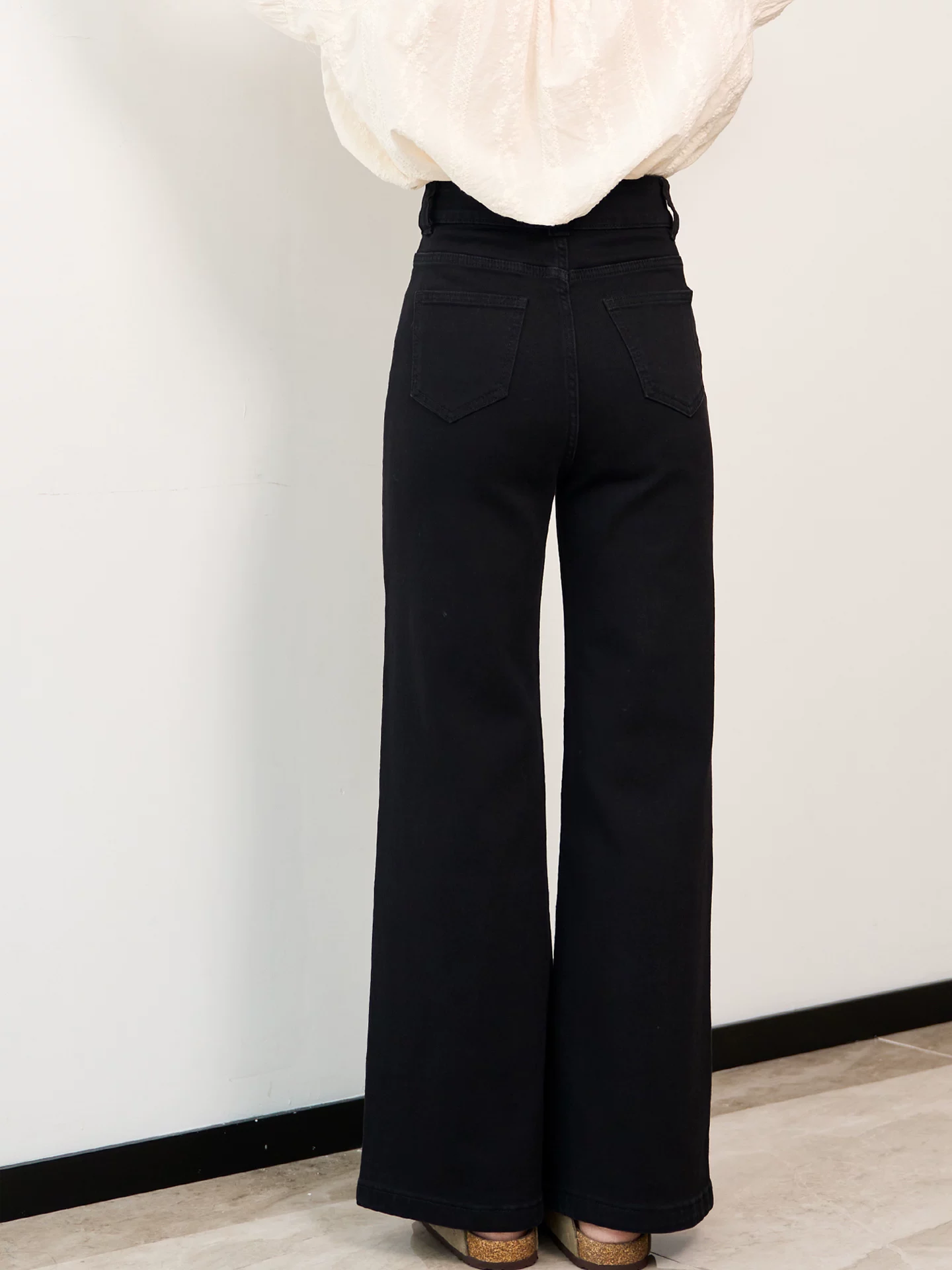 Quần jean đen cạp cao ống loe cho nữ, mùa thu, cỡ lớn, co giãn, giảm béo, dáng quả lê, quần ống chuông