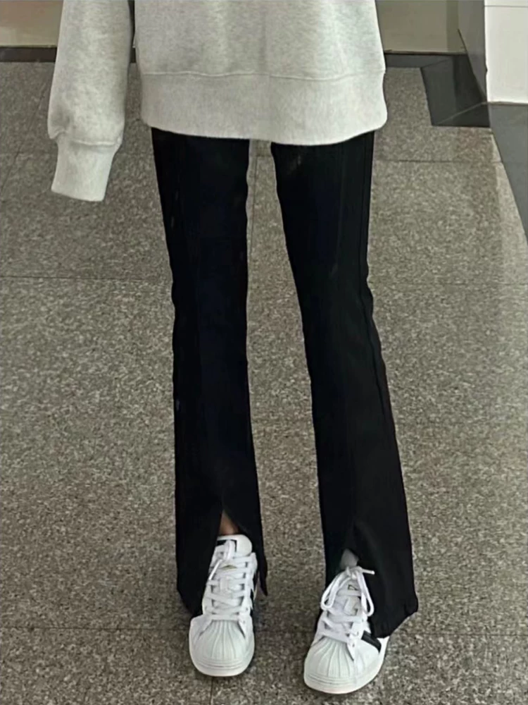 Quần jean đen dáng lê dành cho nữ cỡ lớn, kiểu mới đầu thu, cạp cao, co giãn, xẻ tà, tôn dáng, ống thẳng