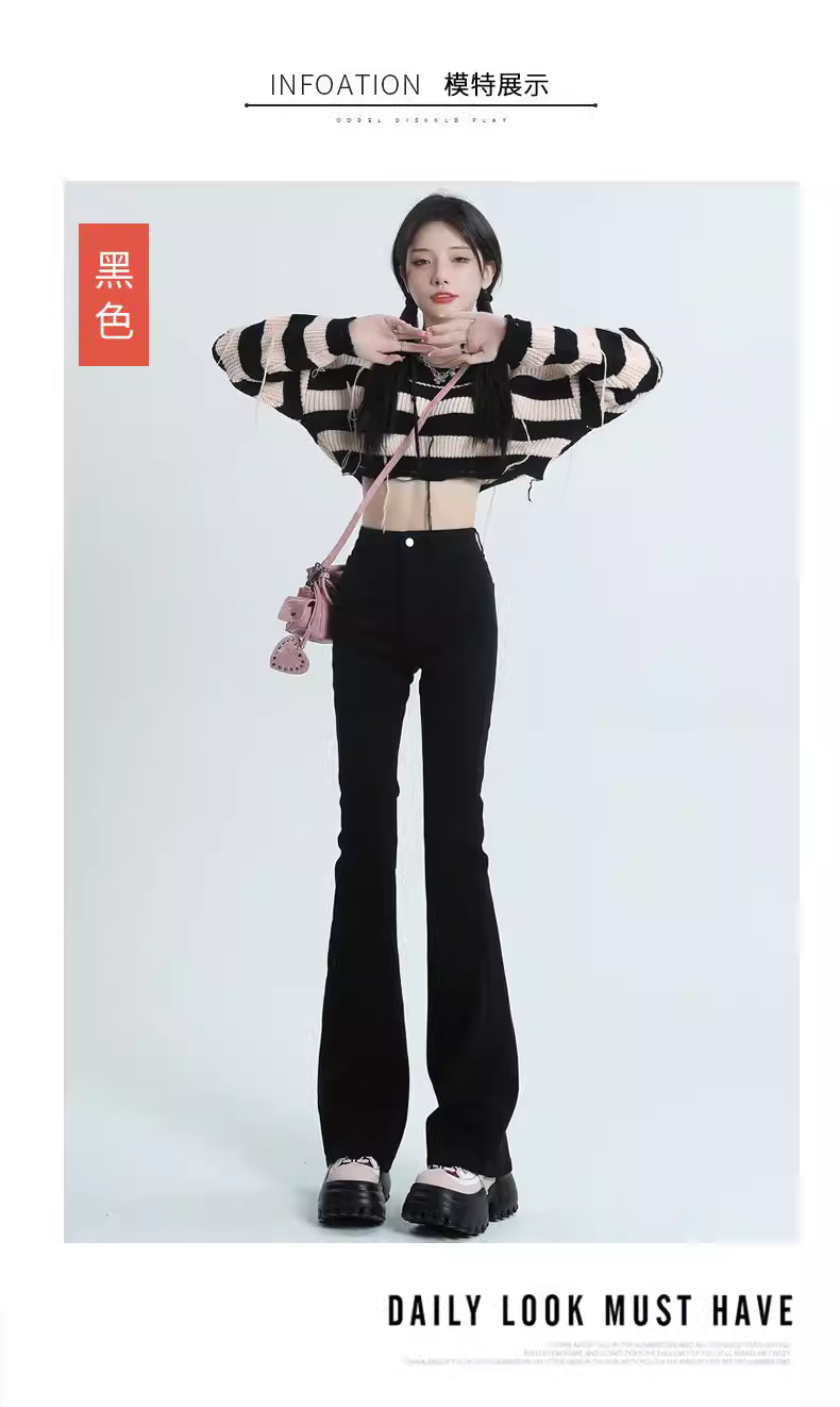 Quần jean đen dày lót lông cừu La Chapelle dáng loe dành cho nữ, mẫu mới thu đông 2025, cạp cao, tôn dáng, kiểu chuông