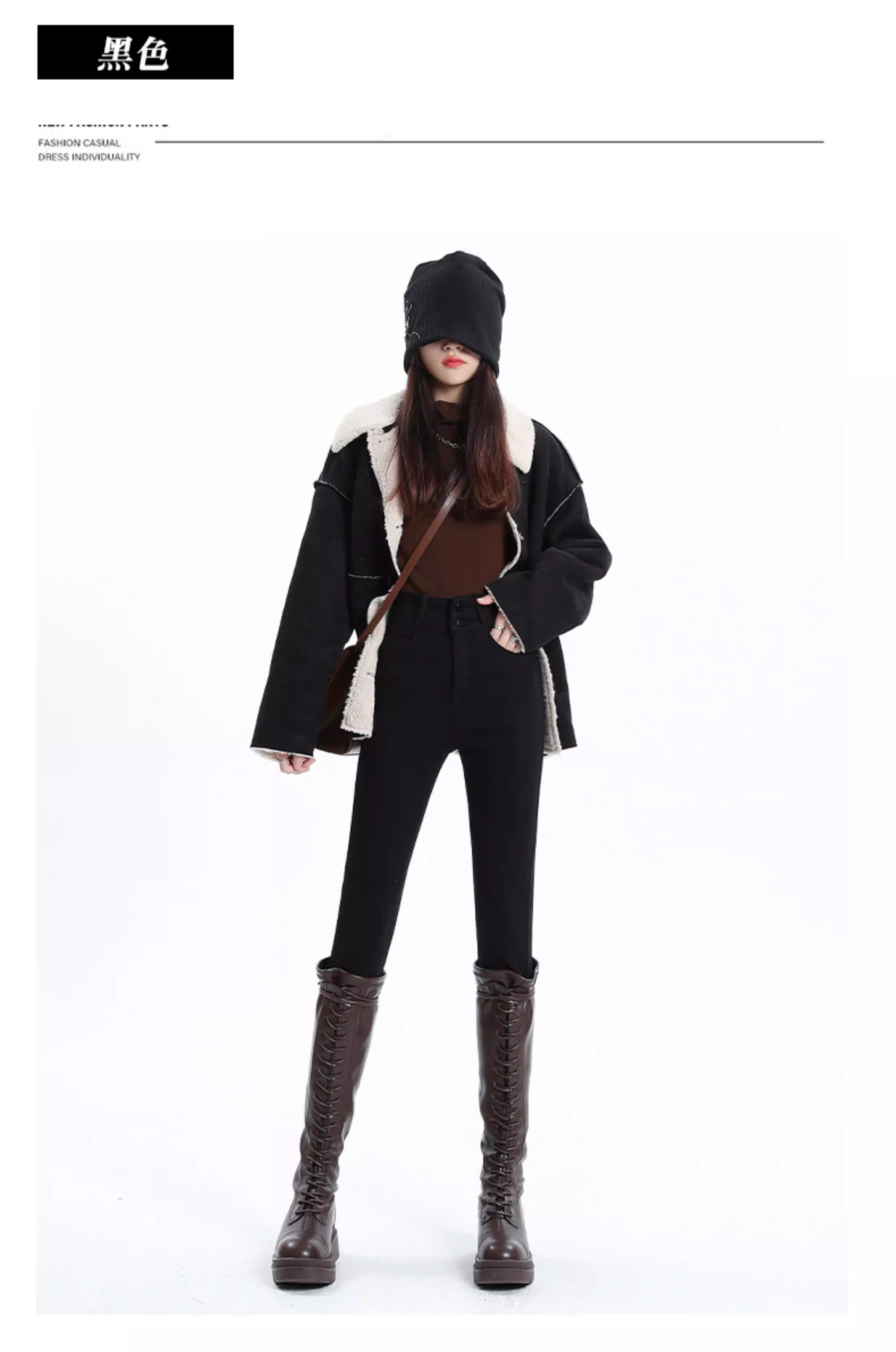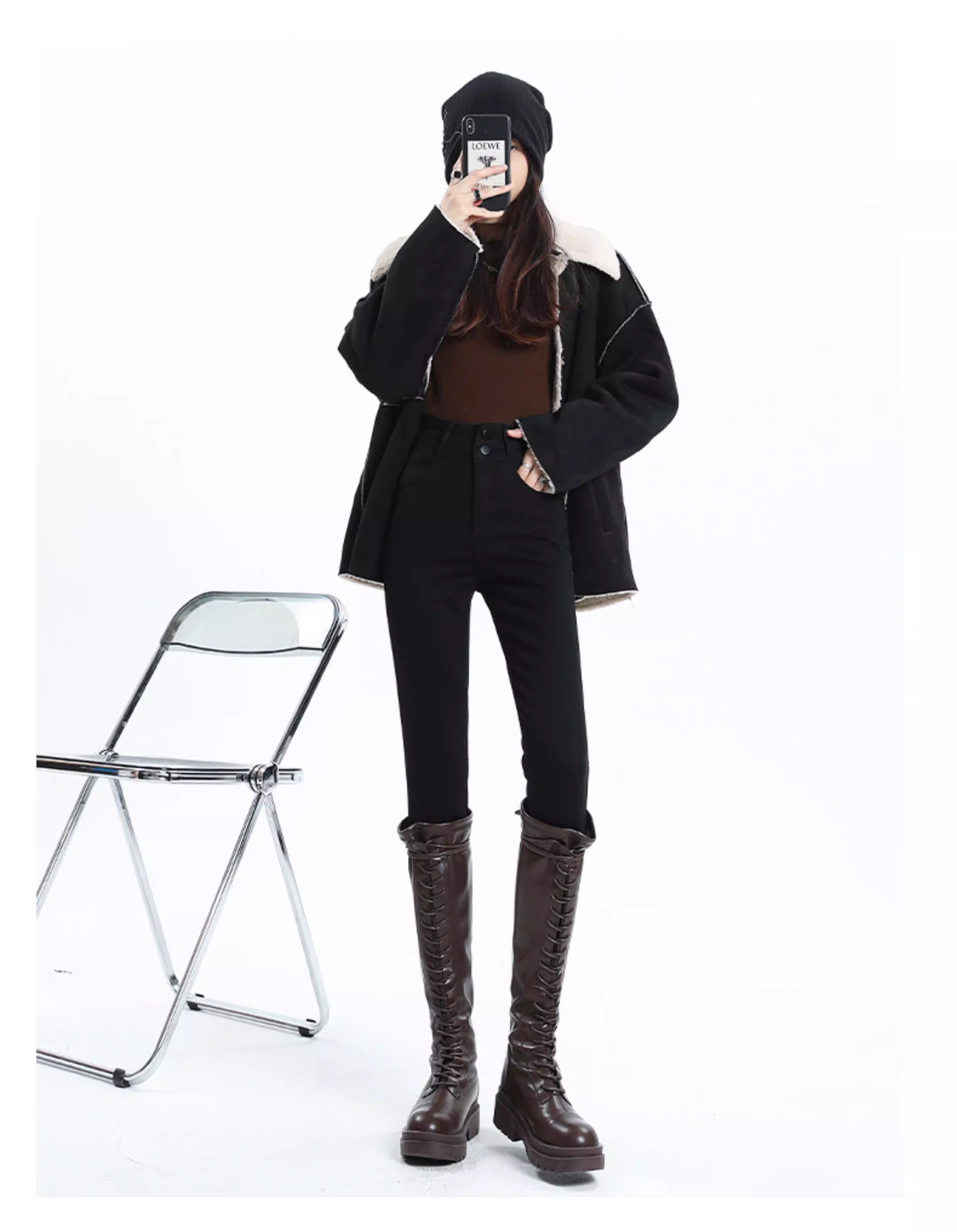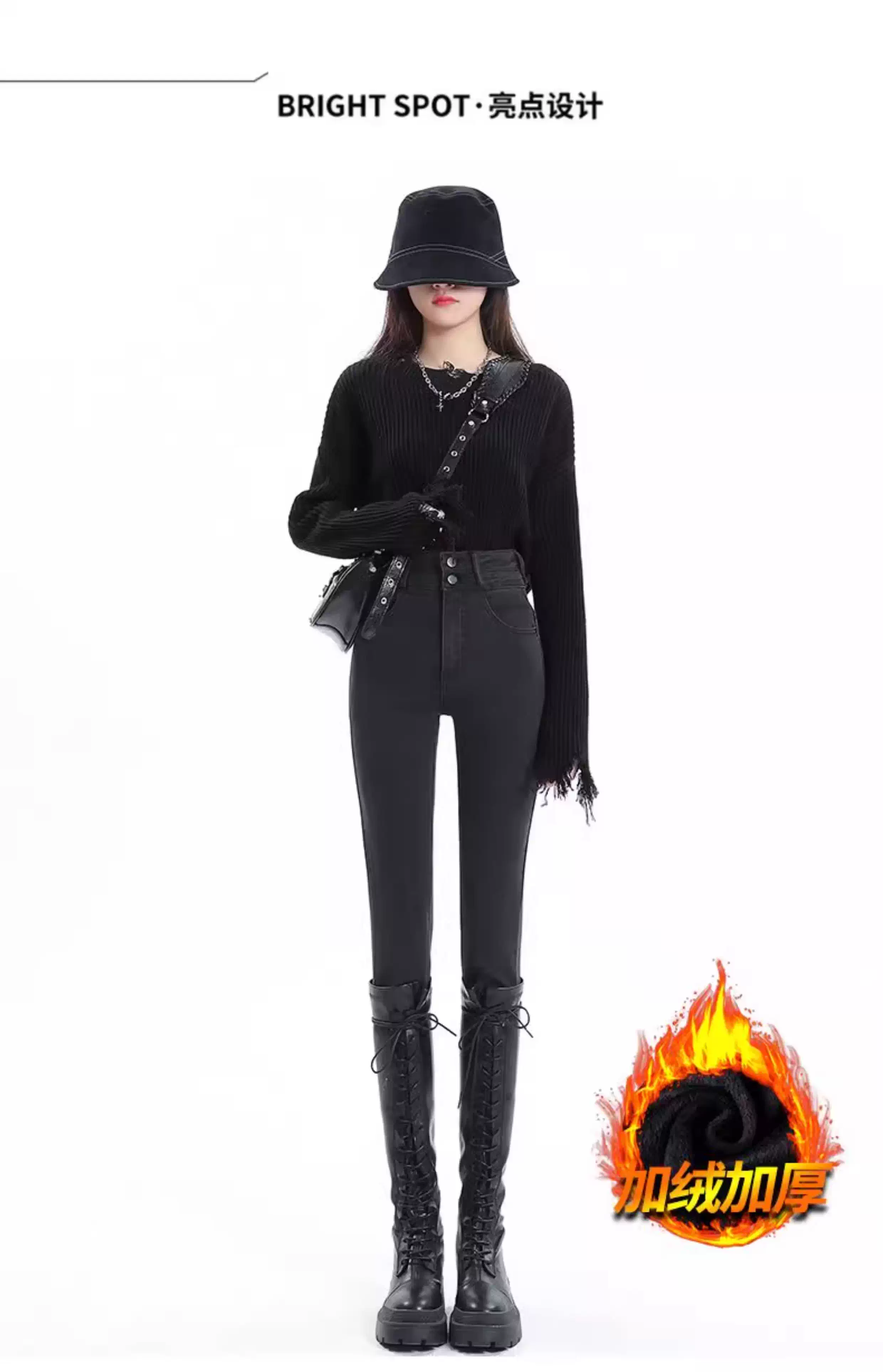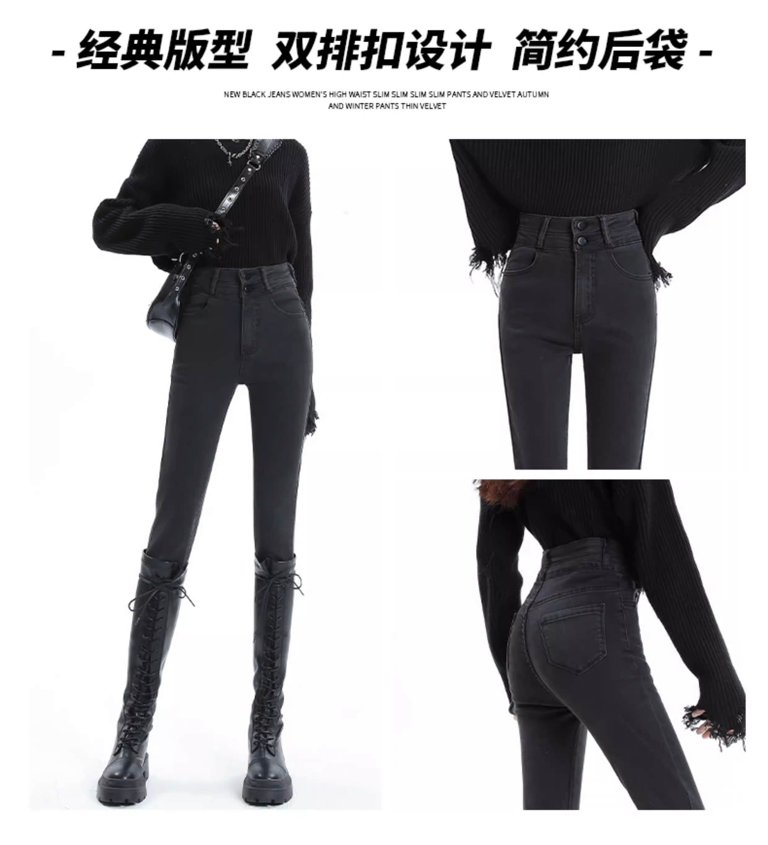 - Quần jean đen La Chapelle dáng ôm cho nữ, mẫu mới thu đông 2025, cạp cao, lót lông, kiểu dáng bút chì, size nhỏ nhắn