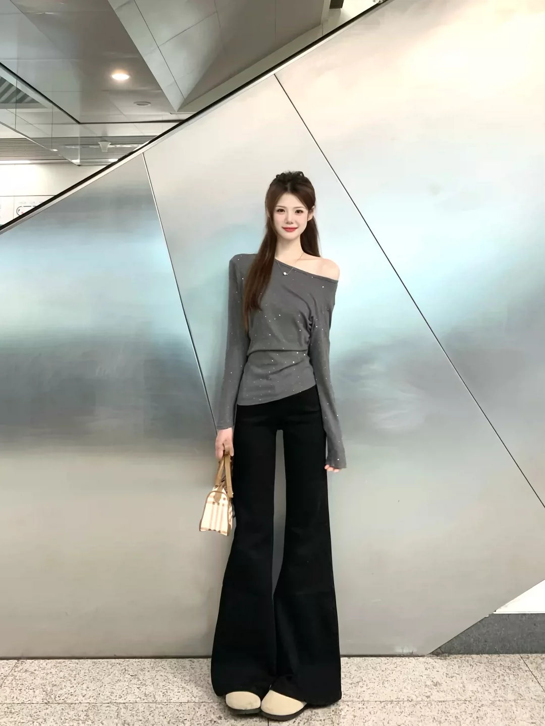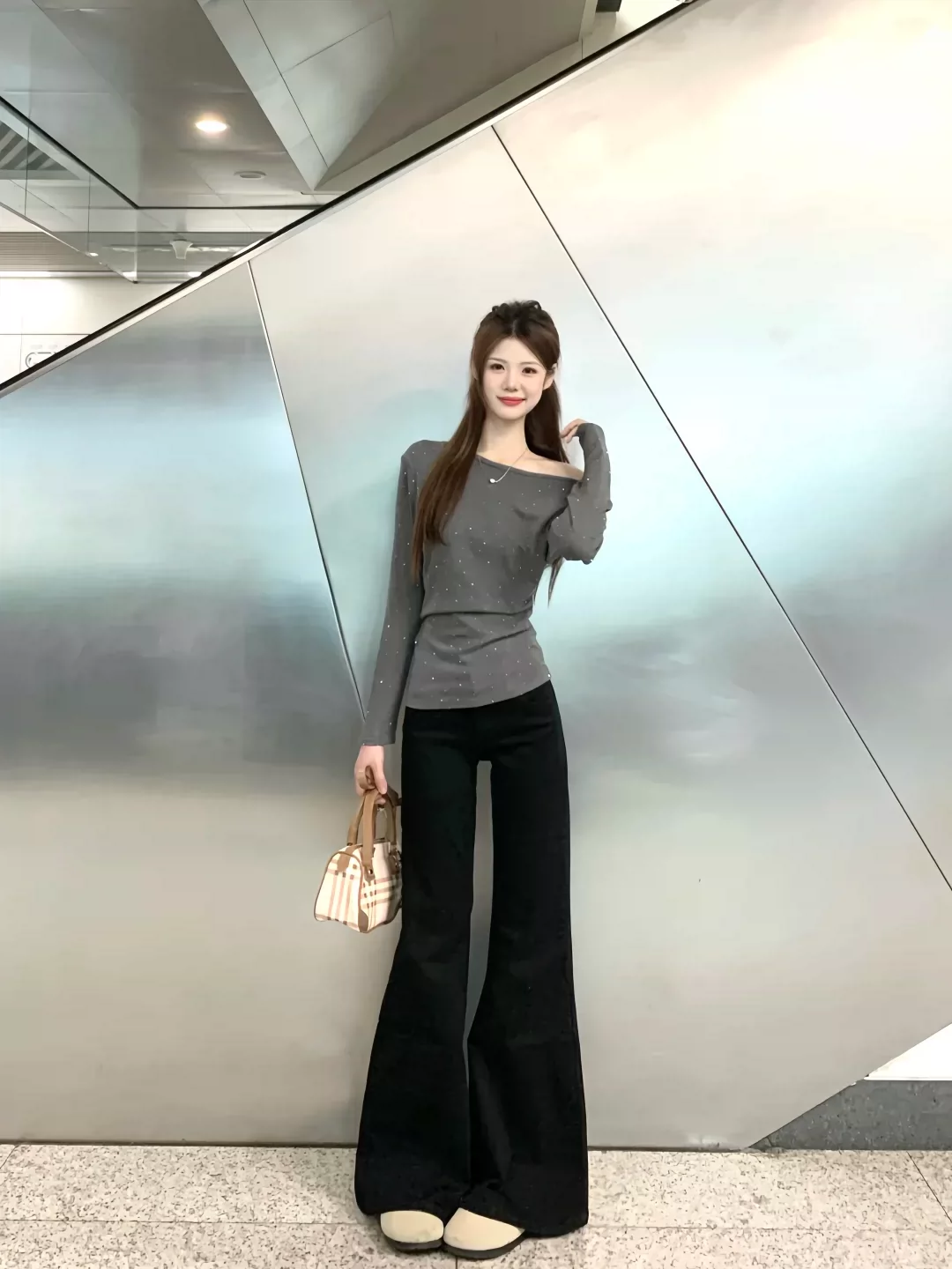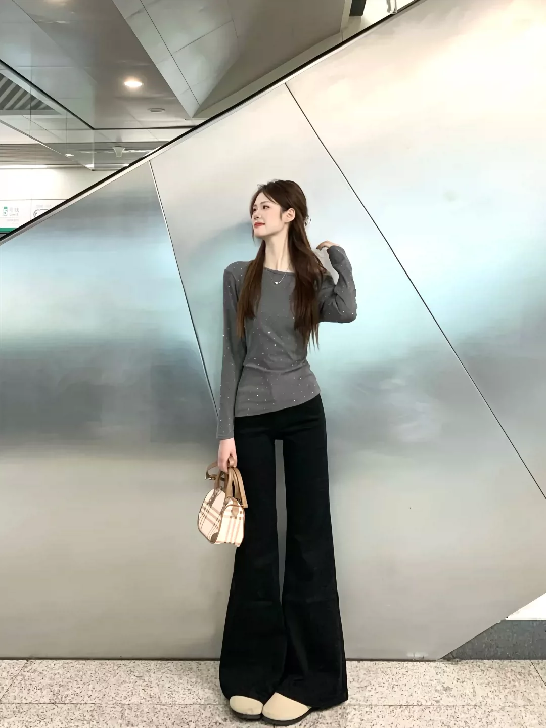 Quần jean đen loe dành cho nữ, kiểu dáng mùa thu mới, cỡ lớn, lưng cao, co giãn, thon gọn, dáng quả lê, quần ống chuông