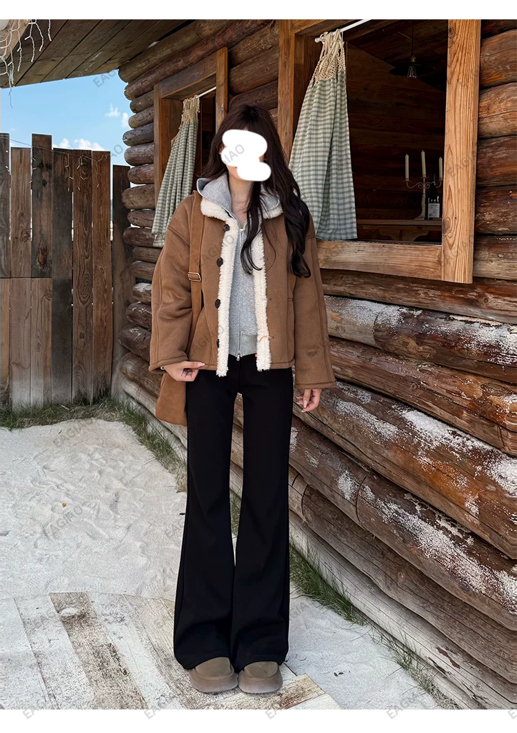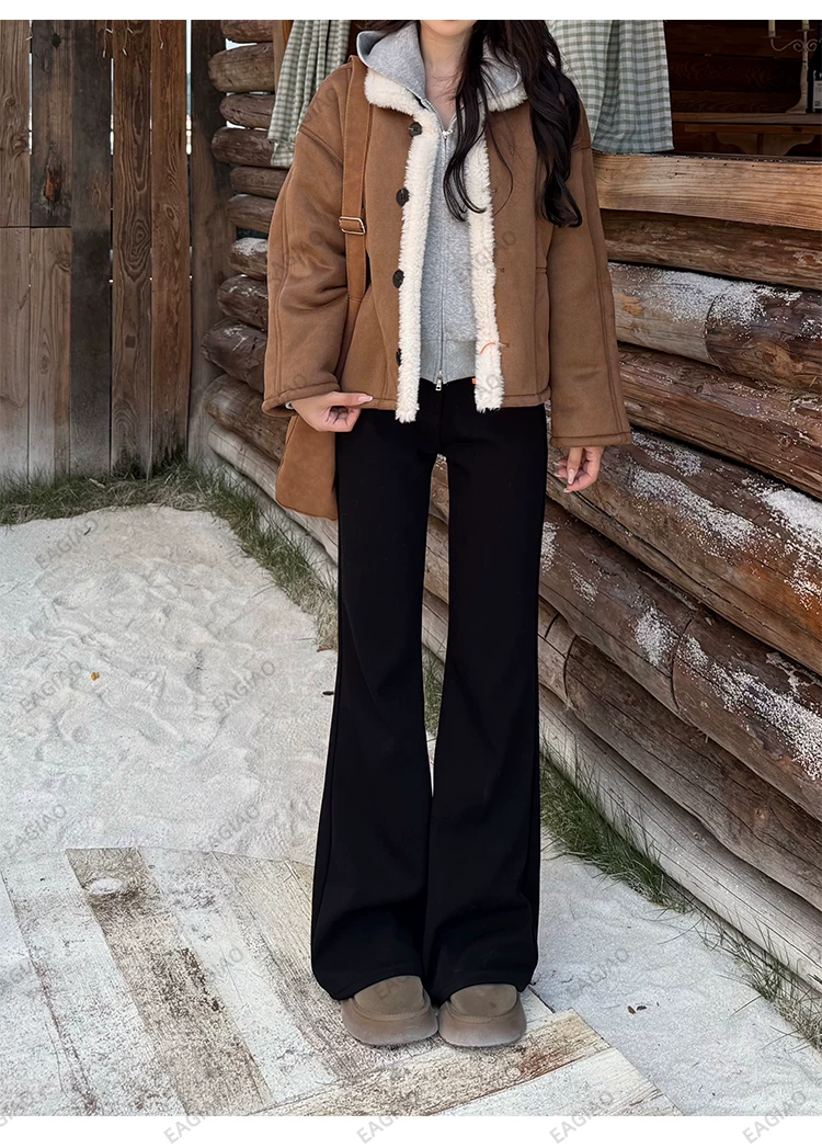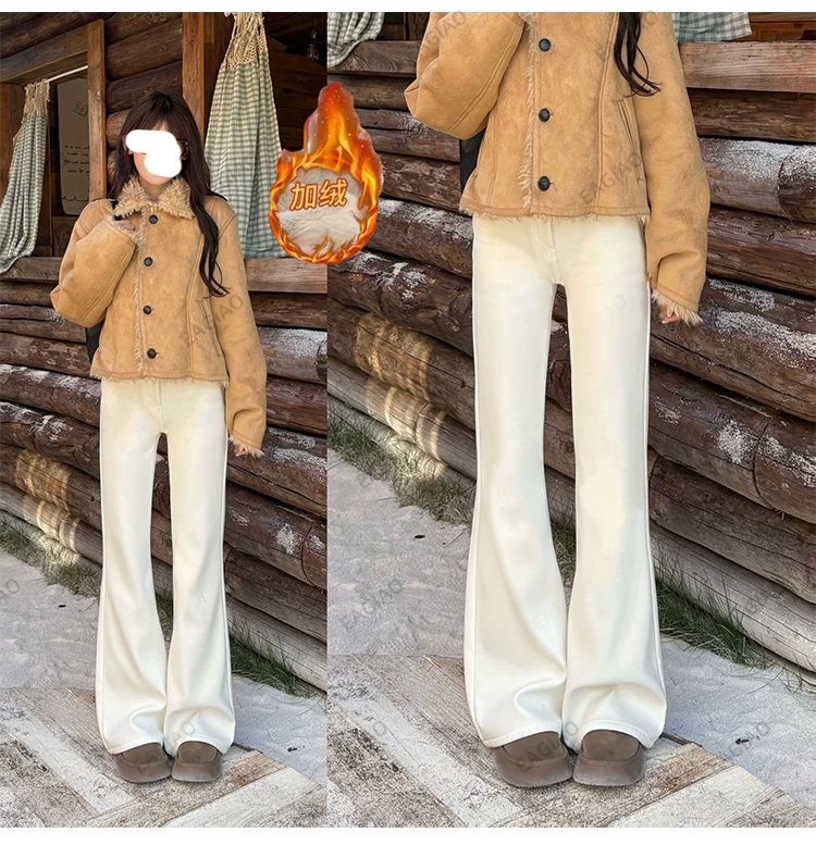 - Quần jean đen ống loe lót lông cừu dành cho nữ, mùa đông 2025, size lớn, cạp cao, co giãn, tôn dáng, dáng nhỏ nhắn, quần ống chuông