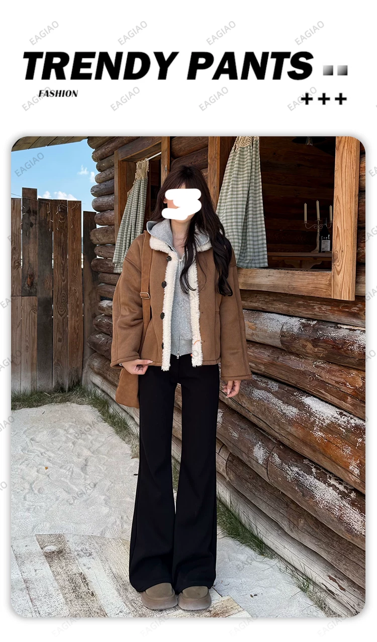 Quần jean đen ống loe lót lông cừu dành cho nữ, mùa đông 2025, size lớn, cạp cao, co giãn, tôn dáng, dáng nhỏ nhắn, quần ống chuông