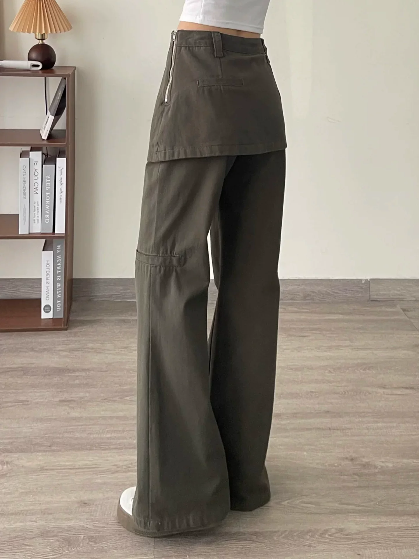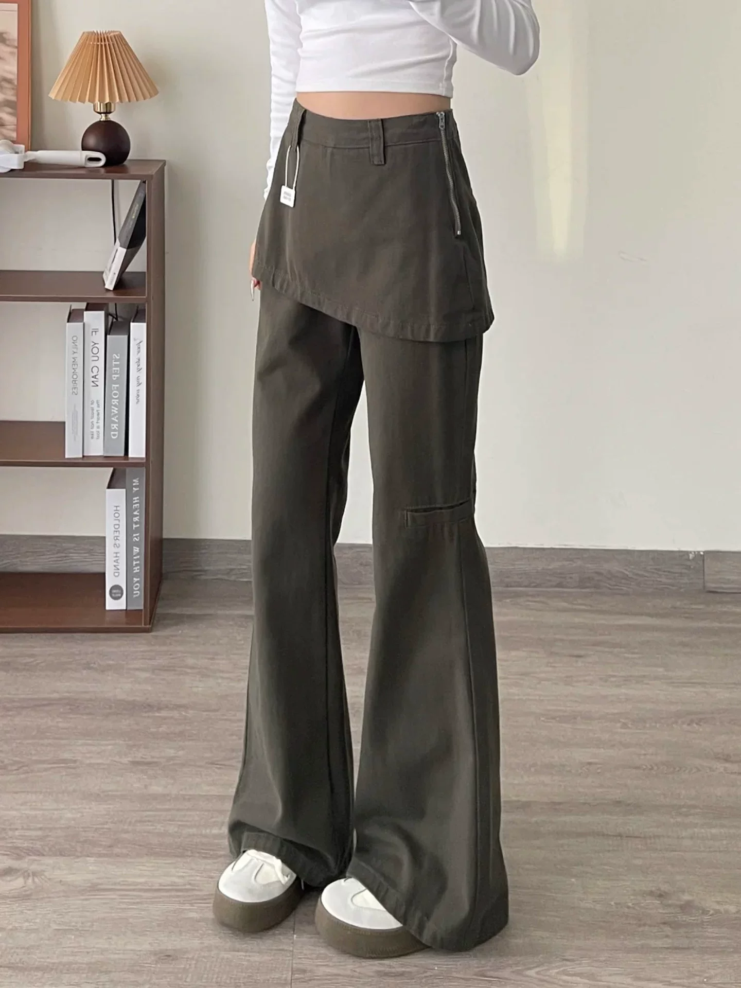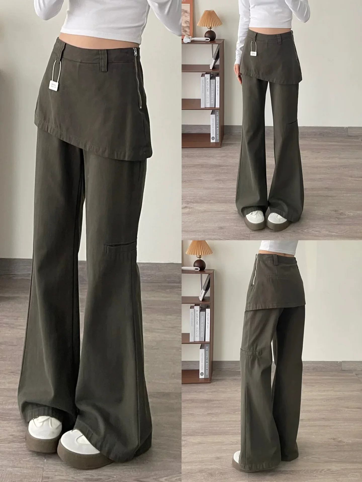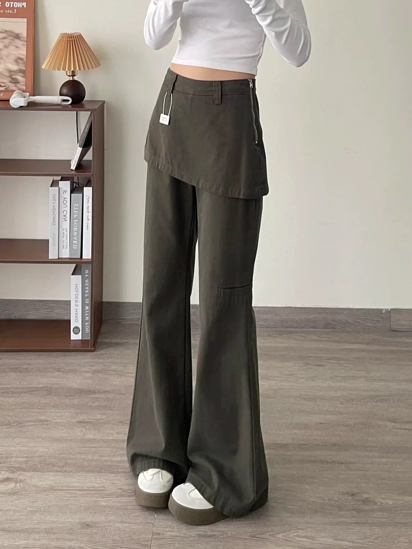 - Quần jean giả hai mảnh kiểu Mỹ dành cho nữ, mùa thu, cỡ lớn, lưng cao, che hông, giảm béo, không bó sát, quần ống rộng kiểu công sở
