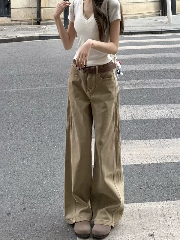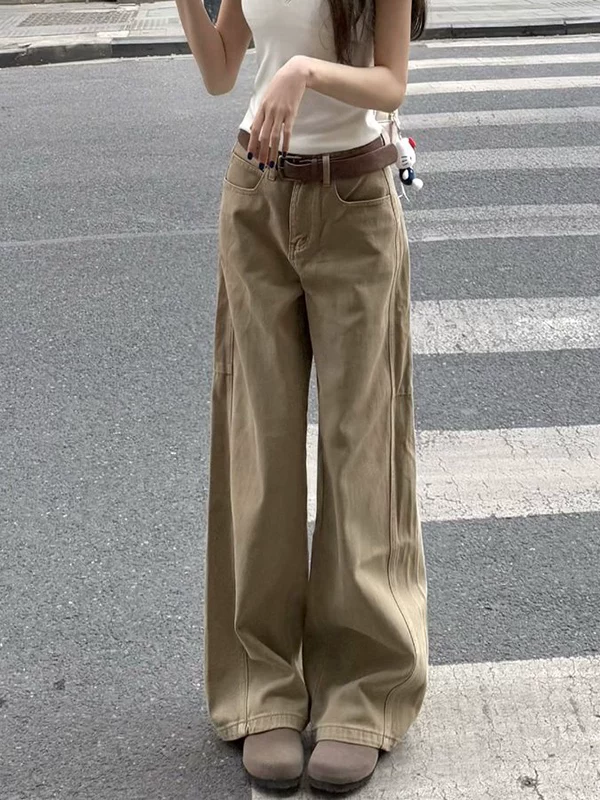 - Quần jean kaki ống thẳng cho nữ, kiểu dáng mùa thu mới, cỡ lớn, lưng cao, che hông, giảm béo, dáng quả lê, quần ống rộng