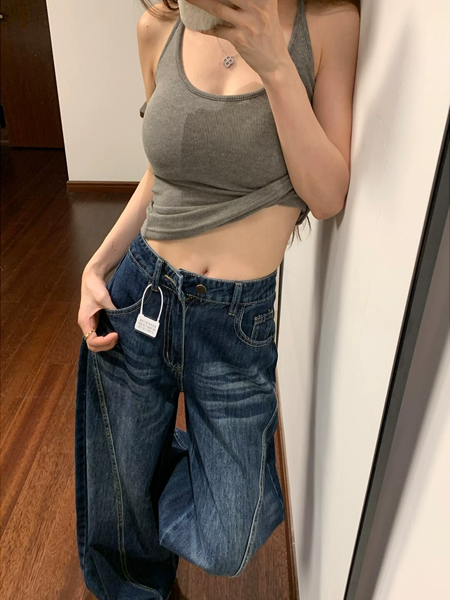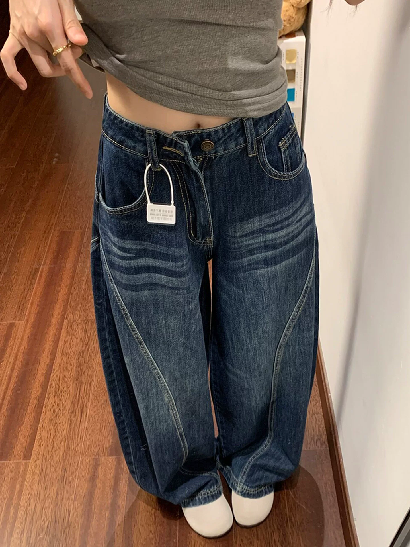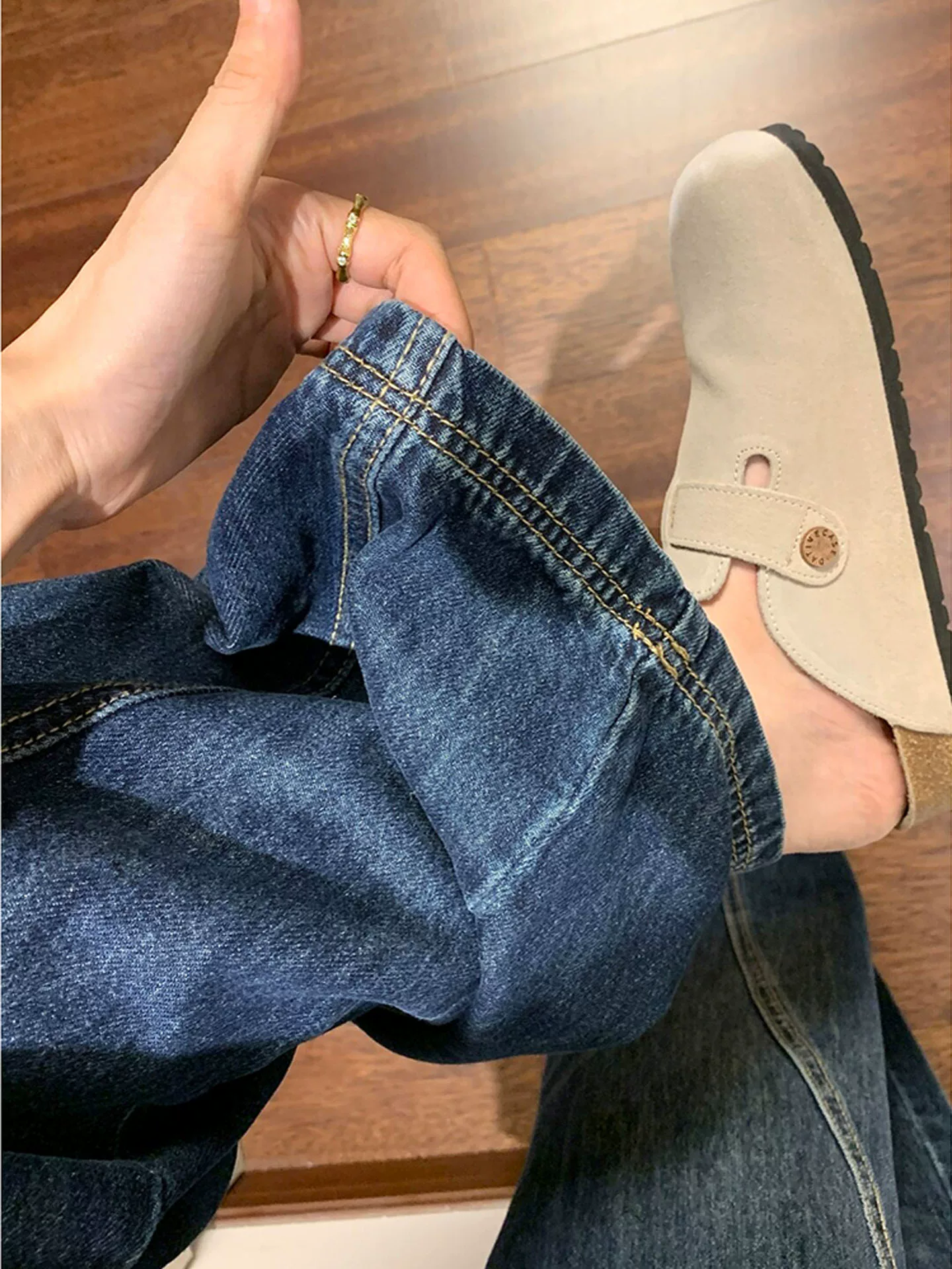 Quần jean kiểu cổ điển Mỹ dành cho nữ, phong cách đầu thu, cỡ lớn, lưng cao, dáng rộng, thon gọn, ống rộng, quần dài đến sàn