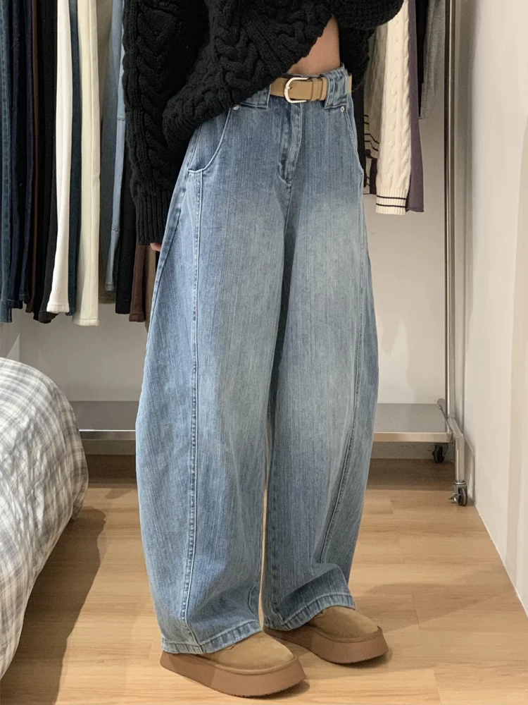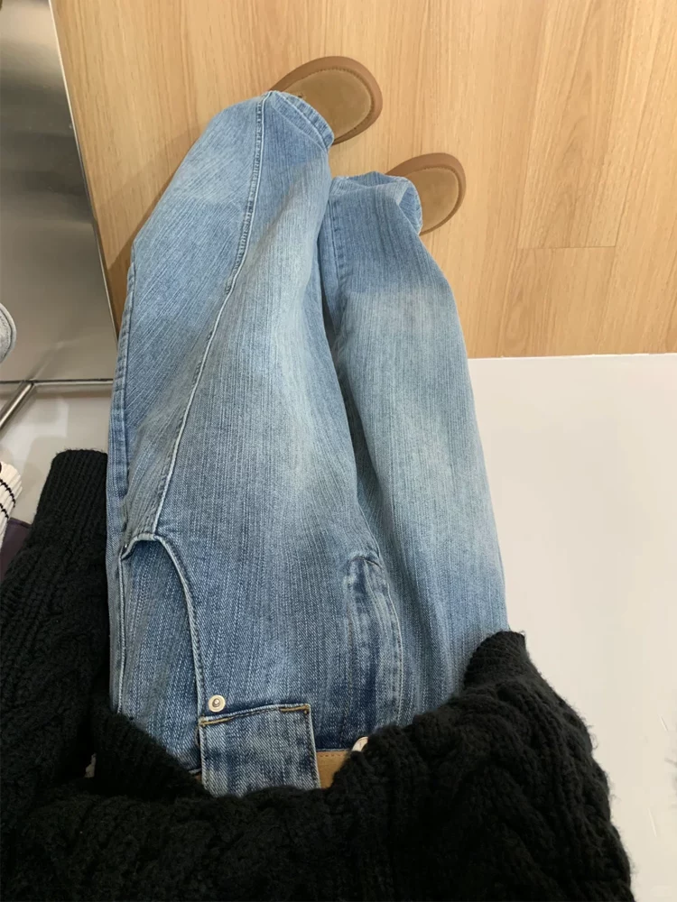 Quần jean kiểu cổ điển Mỹ dành cho nữ, phong cách thu đông mới, cỡ lớn, lưng cao, dáng rộng, che hông, giảm béo, quần ống rộng