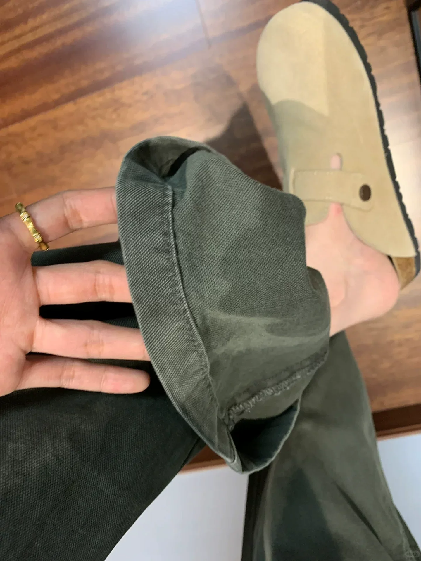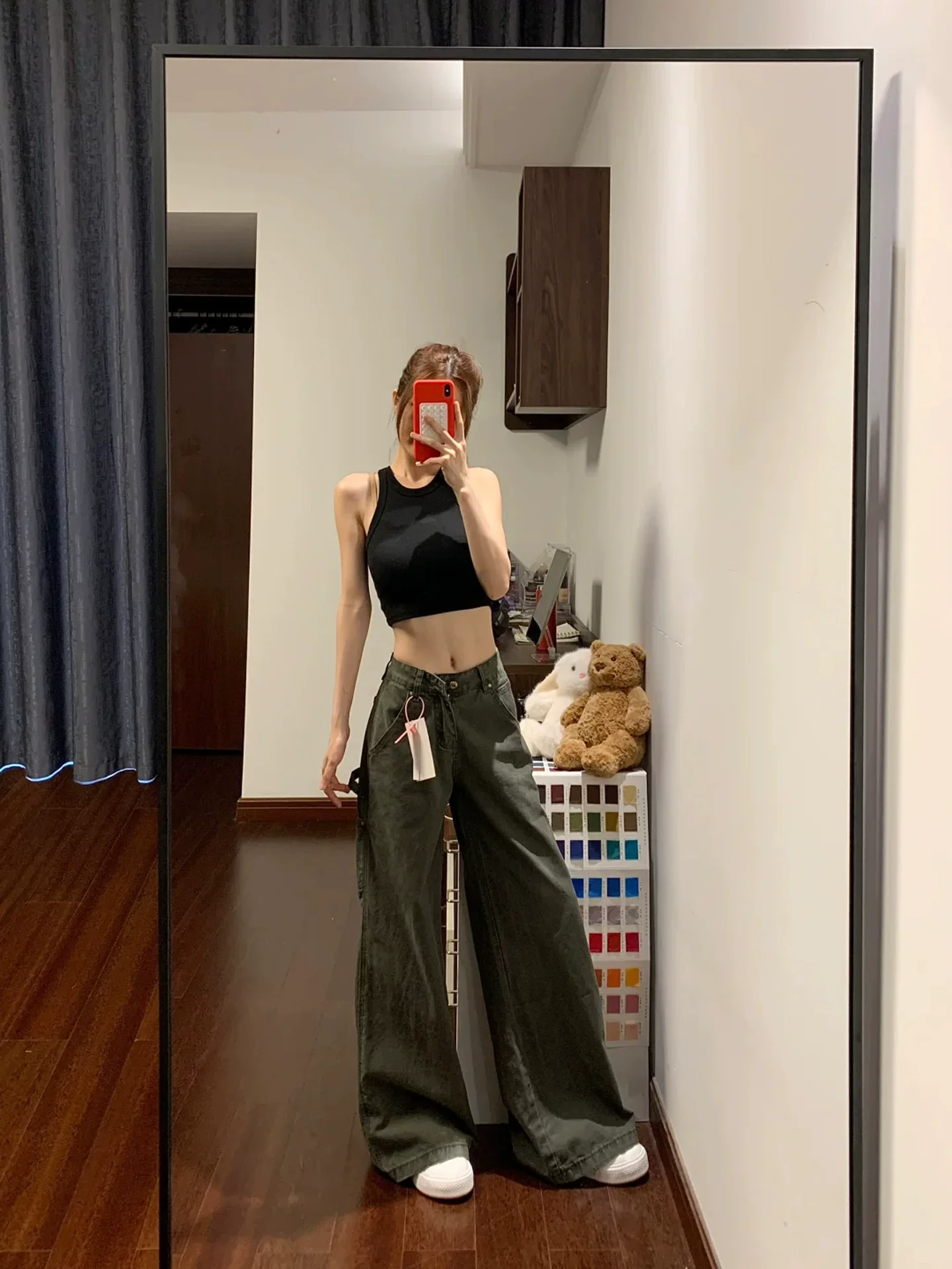 Quần jean kiểu retro Mỹ dành cho nữ, phong cách đầu thu, cỡ lớn, lưng cao, dáng rộng, tôn dáng, quần ống rộng màu xanh quân đội.