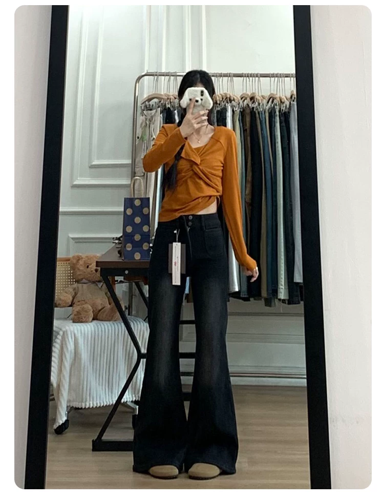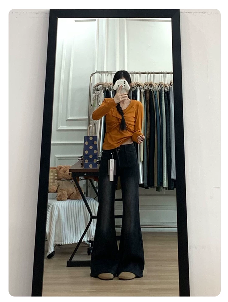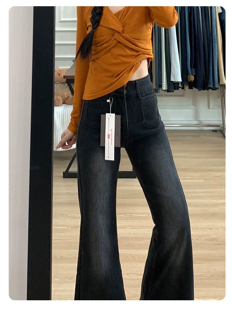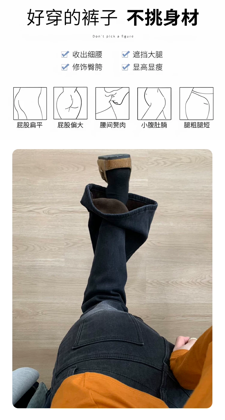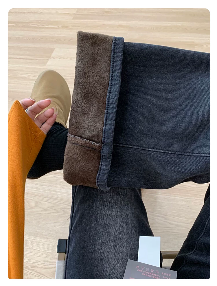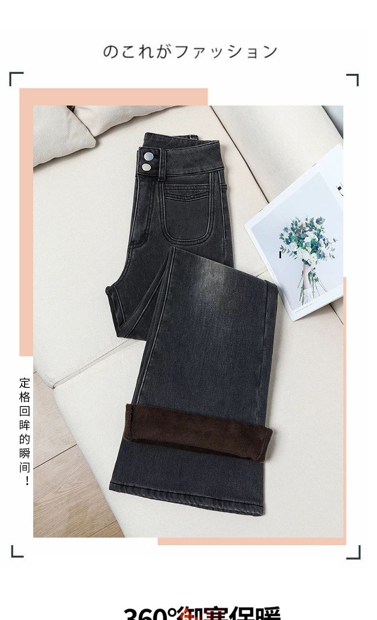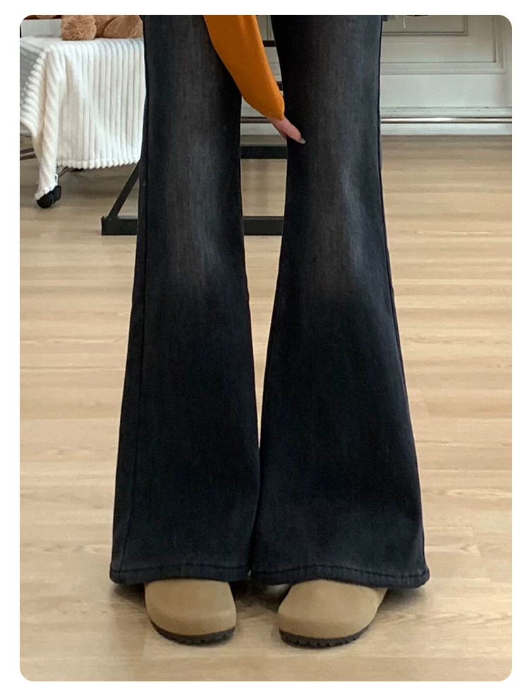 Quần jean loe dành cho nữ có lớp lót lông cừu, dày dặn, cạp cao, co giãn, thon gọn, cỡ lớn, kiểu dáng mới thu đông.