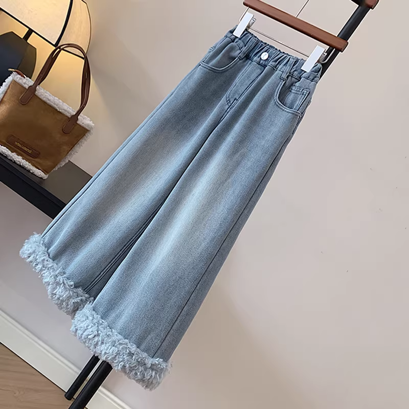 Quần jean lót lông cho bé gái, quần ống rộng màu xanh nhạt cho trẻ em, quần ống rộng ống đứng dày dặn viền lông cho trẻ em cỡ vừa và lớn