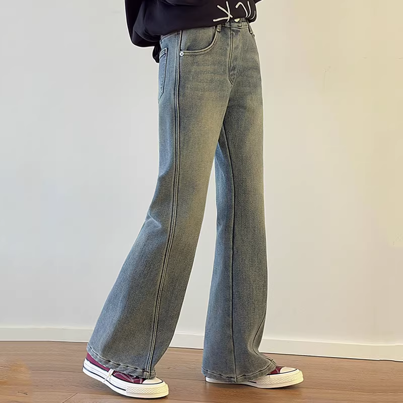 Quần jean lót lông cừu dáng loe cho bé gái, kiểu thu đông 2025, quần dài cho trẻ lớn, cạp cao, tôn dáng, lót lông tích hợp, quần hơi loe