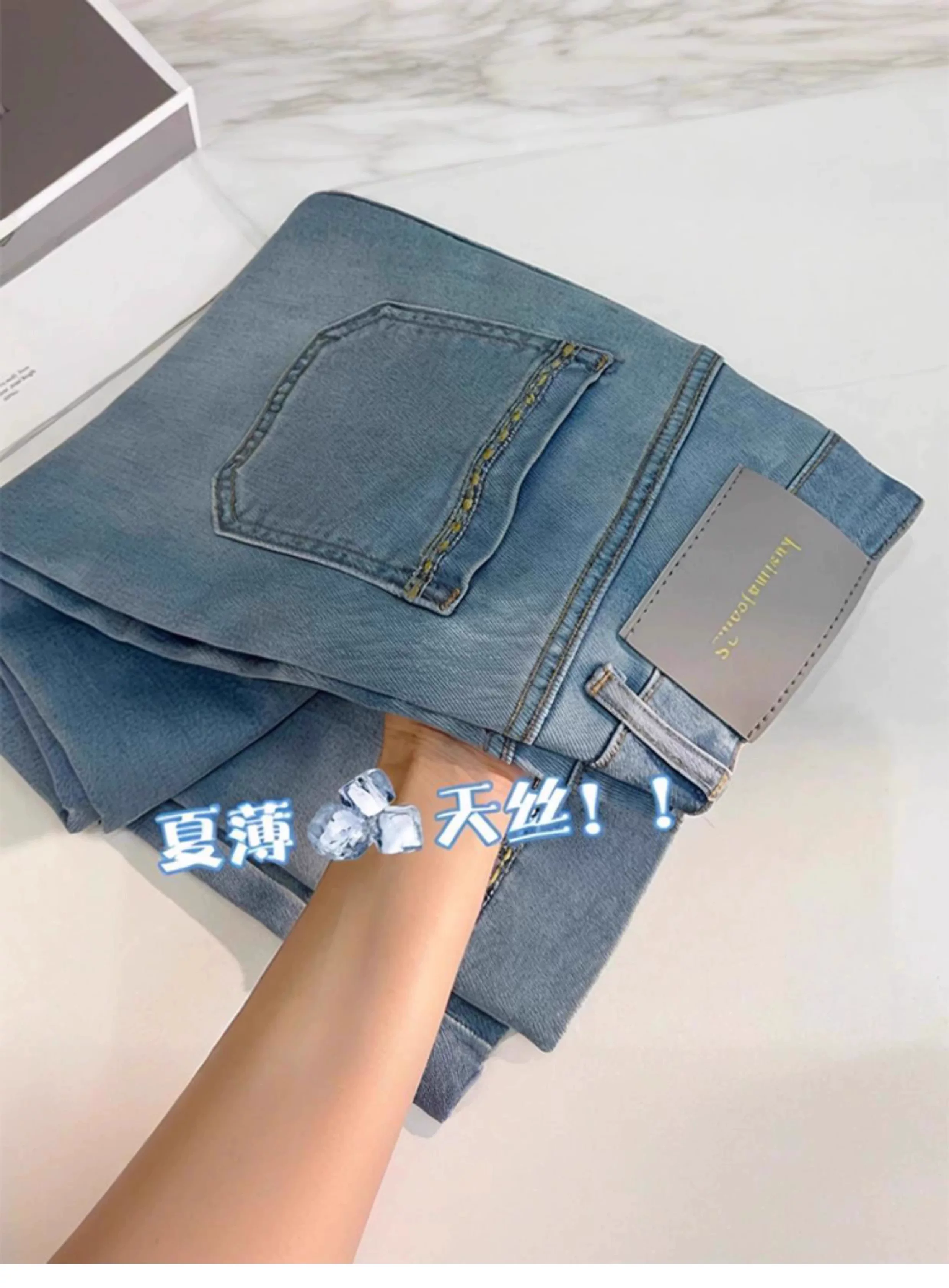 Quần jean lụa băng cho nữ, kiểu dáng mùa hè, cỡ lớn, lưng cao, giảm béo, dáng quả lê, quần ống thẳng Tencel chín phần