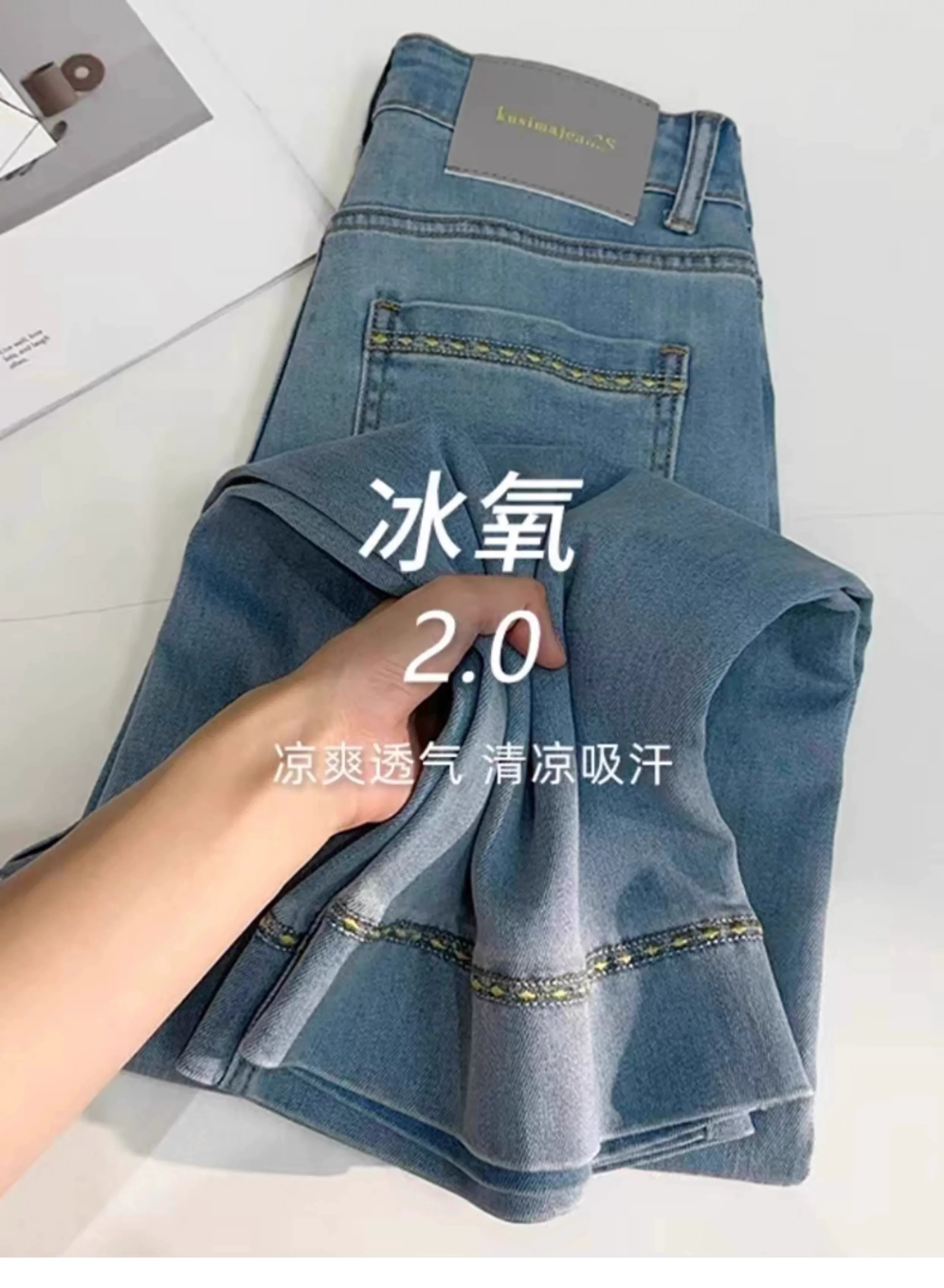 - Quần jean lụa băng cho nữ, kiểu dáng mùa hè, cỡ lớn, lưng cao, giảm béo, dáng quả lê, quần ống thẳng Tencel chín phần
