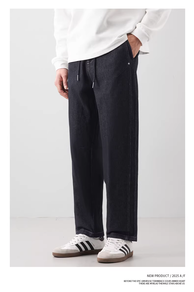 Quần jean màu nguyên bản hạng nặng OMZM dành cho nam, quần ống rộng dáng rộng theo phong cách cổ điển Mỹ mùa thu đông, quần ống rộng màu trơn thông thường