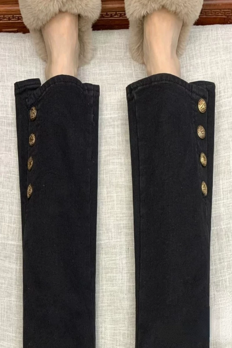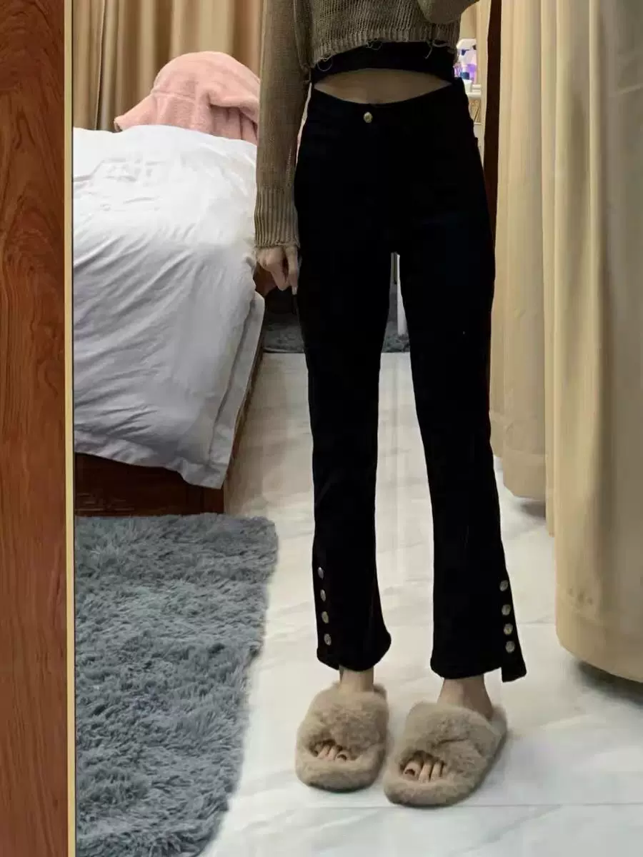 - Quần jean nữ dáng chuông, lót lông cừu, dày dặn, ống thẳng hơi loe, size lớn, cạp cao, co giãn, che hông.