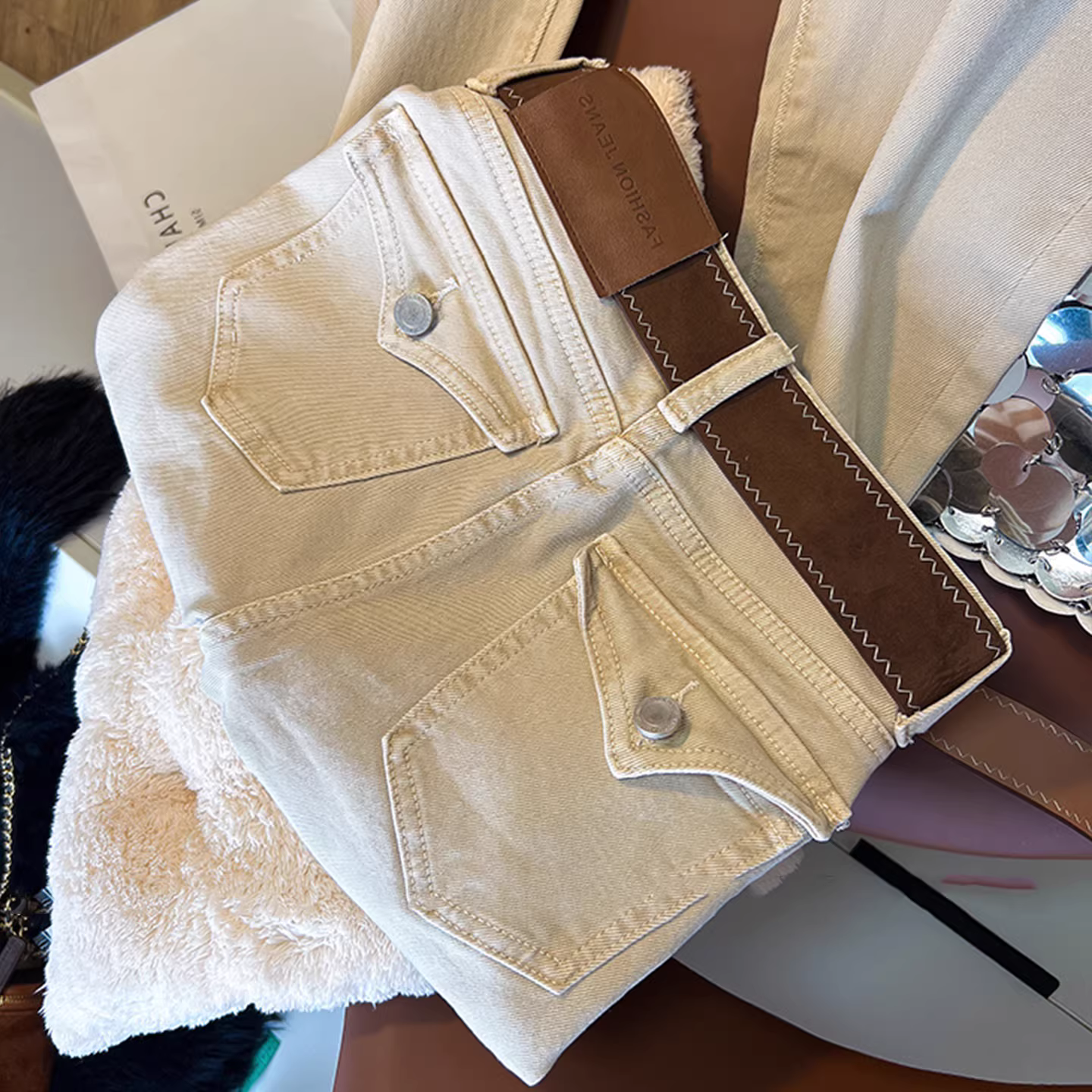 Quần jean nữ dáng ôm, chất liệu nỉ, kiểu dáng retro cao cấp, ống loe, mùa thu đông, cạp cao, chất liệu co giãn.