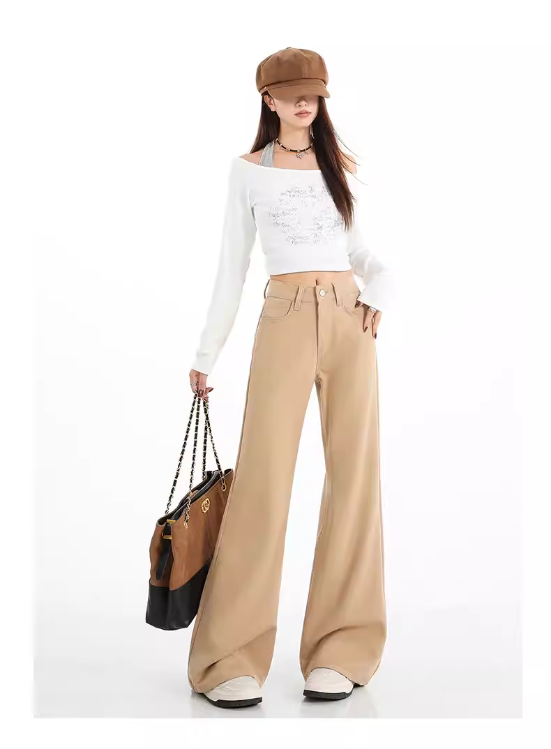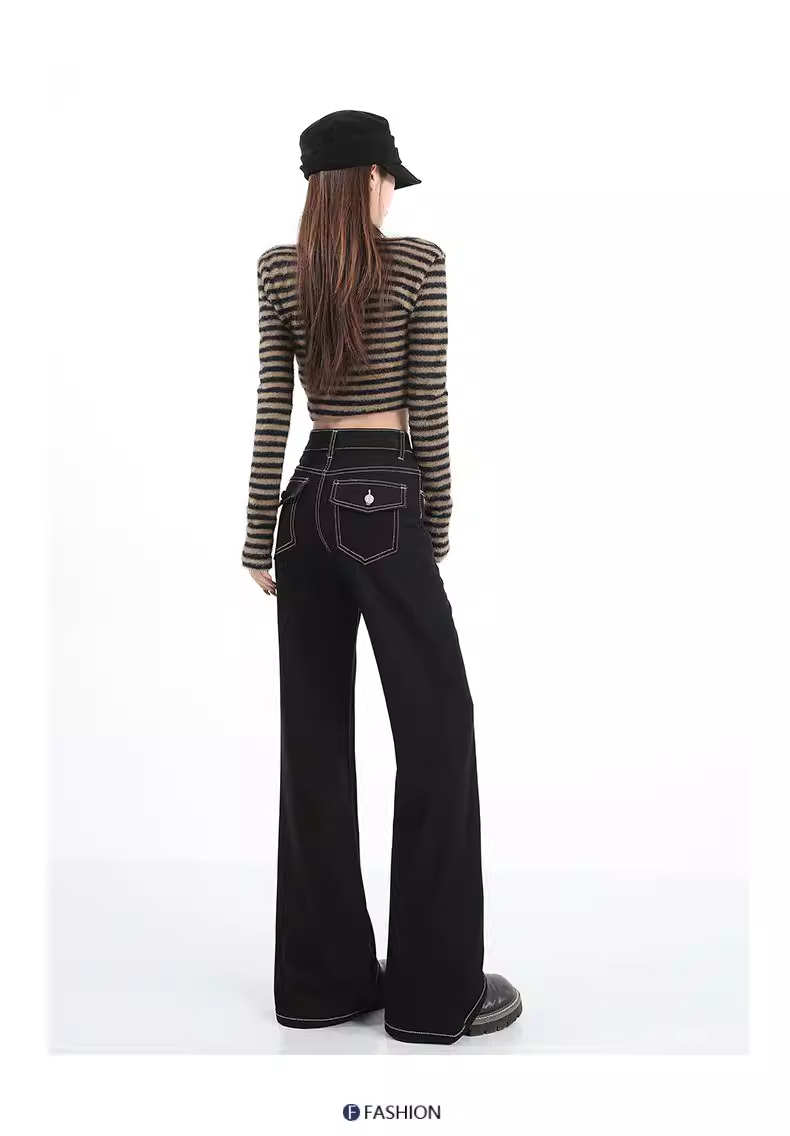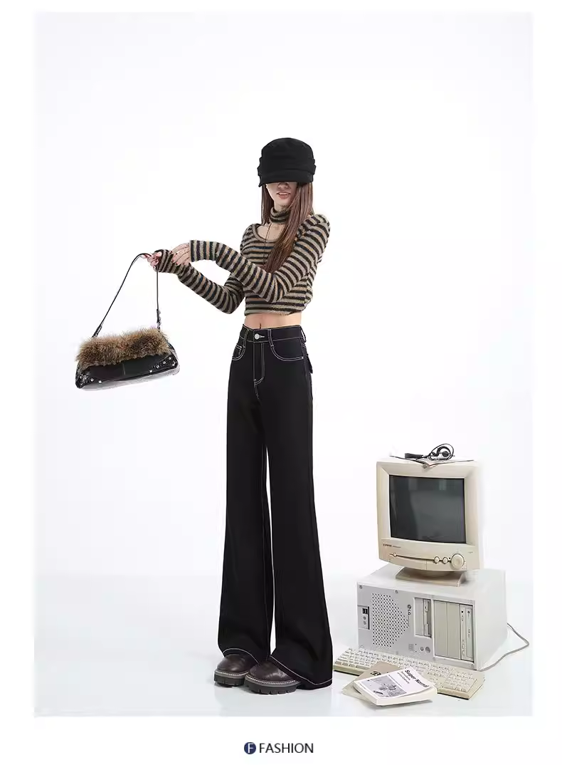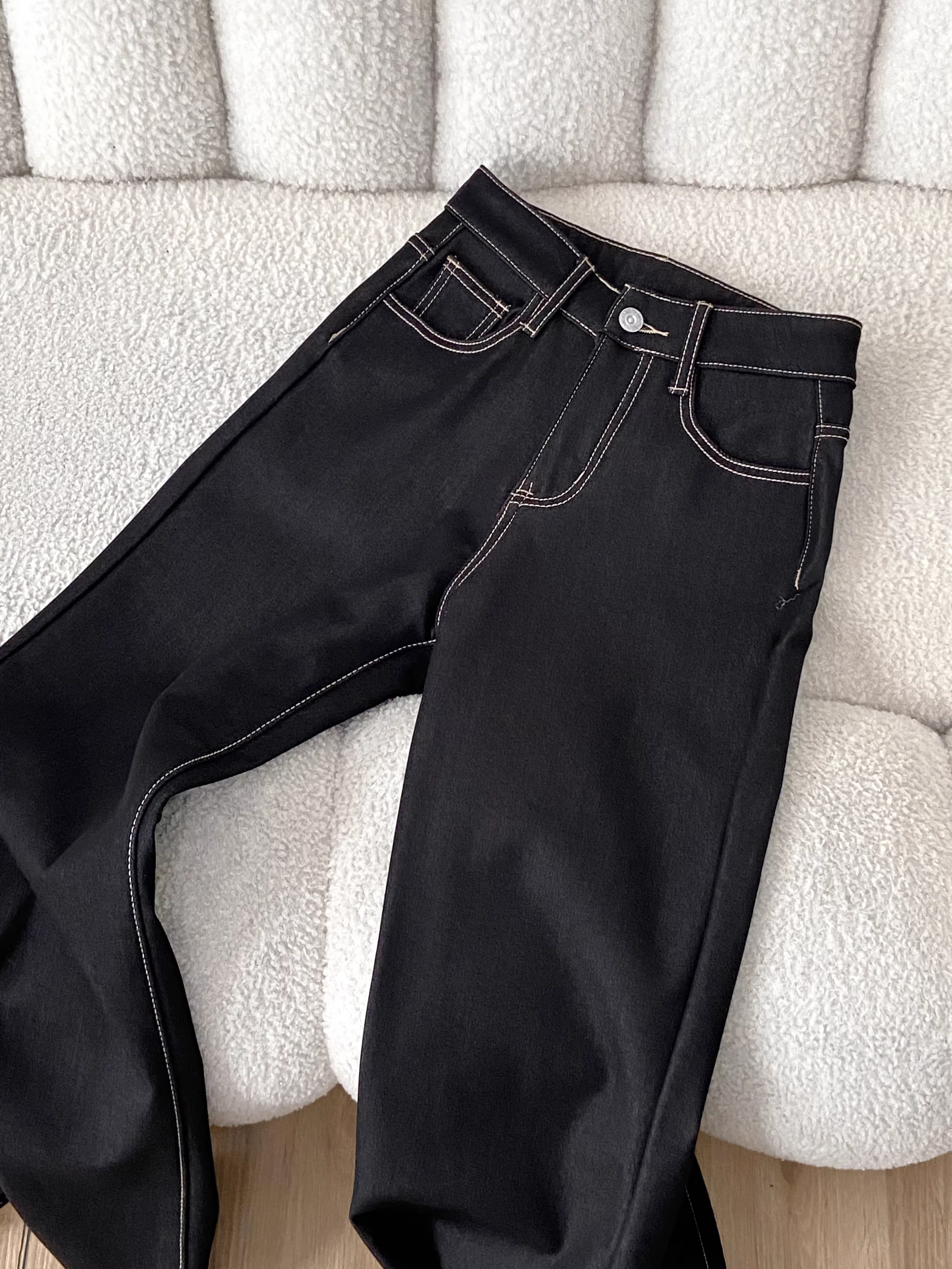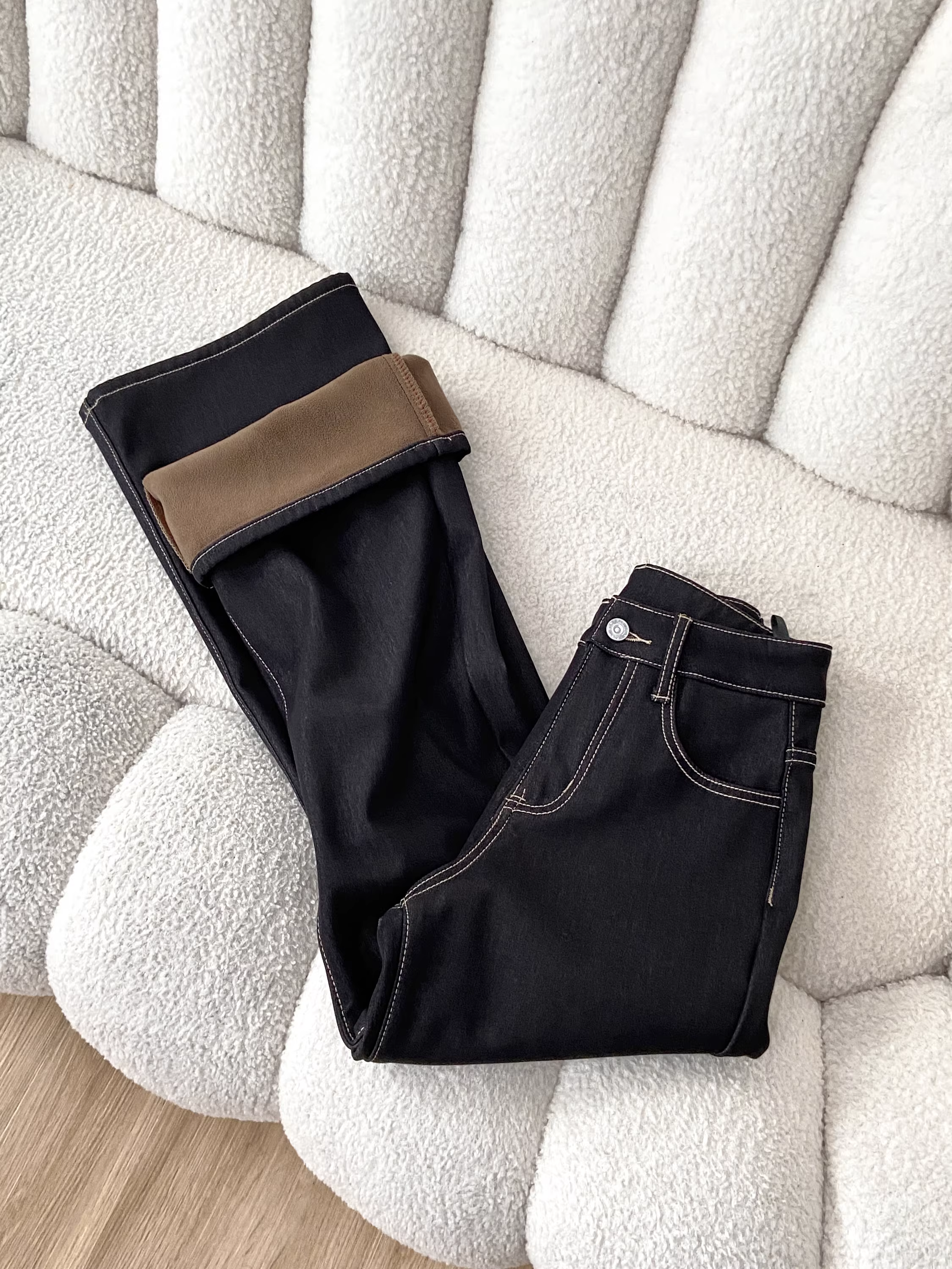- Quần jean nữ La Chapelle chất liệu kaki lót lông dày, dáng loe, cao cấp, mùa thu đông 2025, cạp cao, dài chấm đất, kiểu chuông.