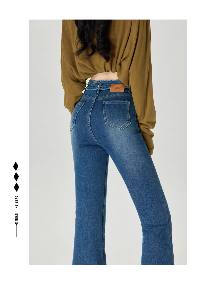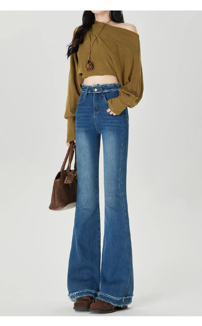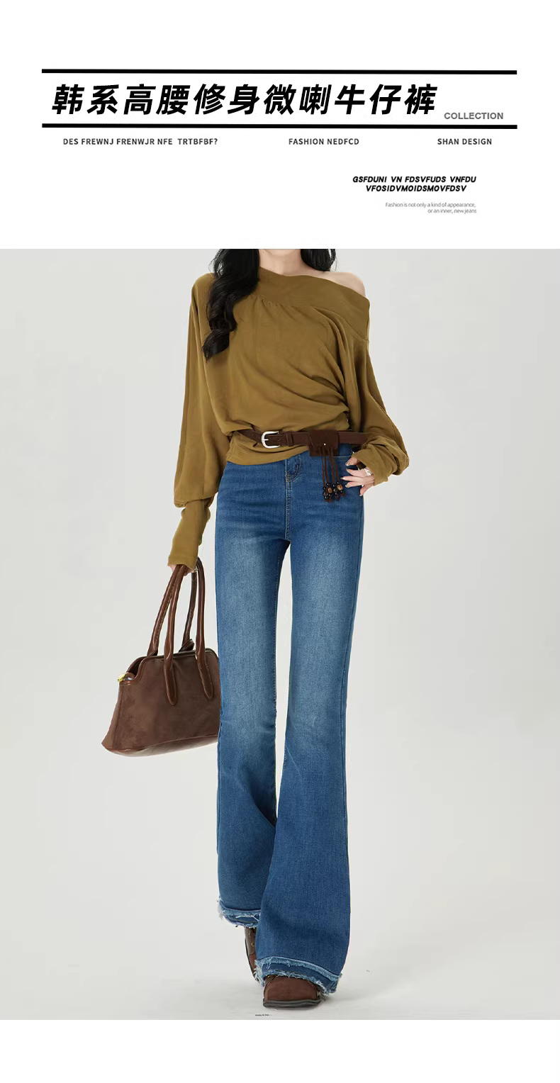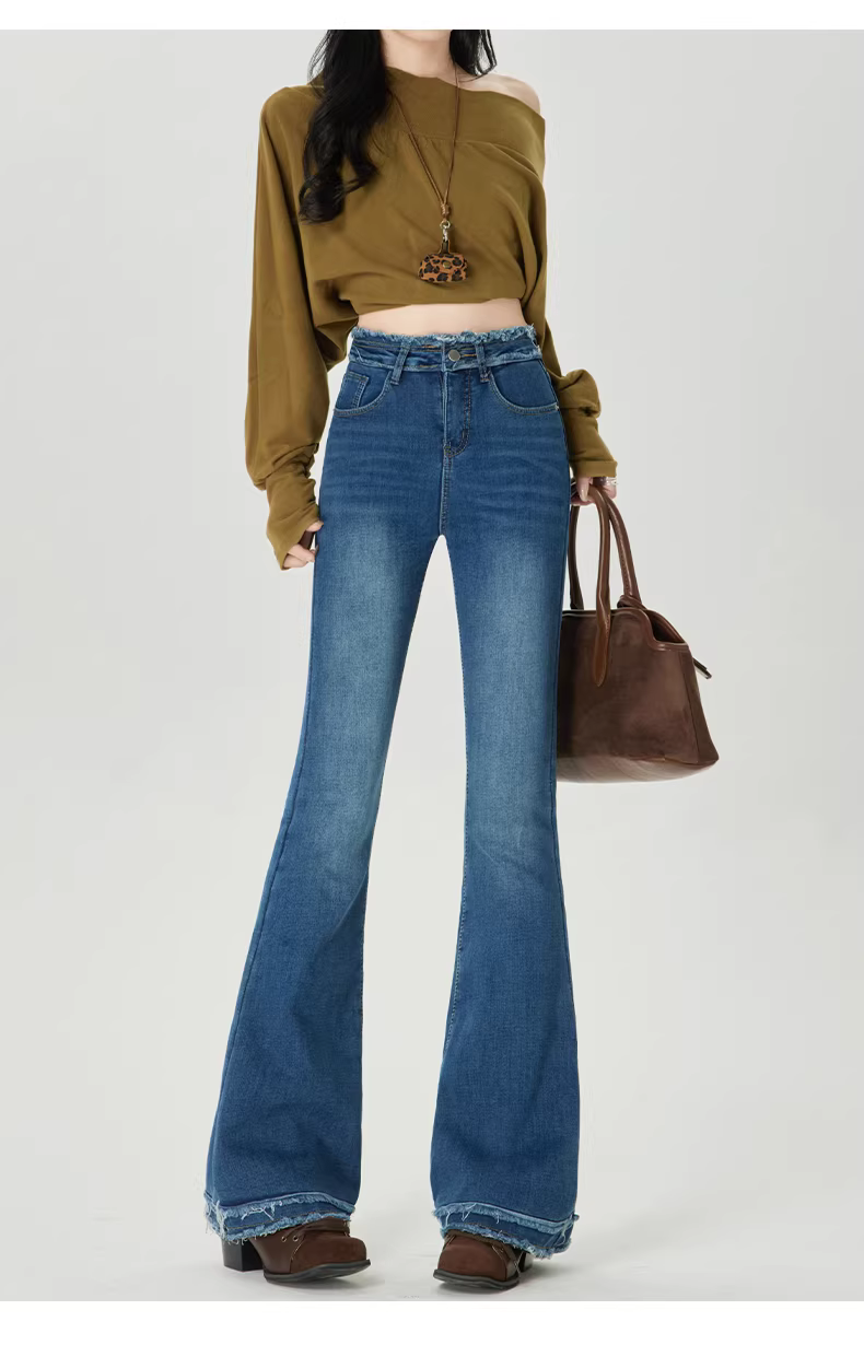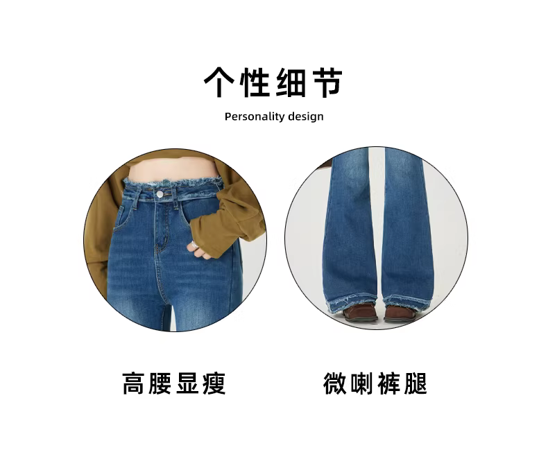 - Quần jean nữ La Chapelle lót lông cừu đen dày dặn, dáng loe, mùa thu đông 2025, cạp cao, viền xù, kiểu chuông