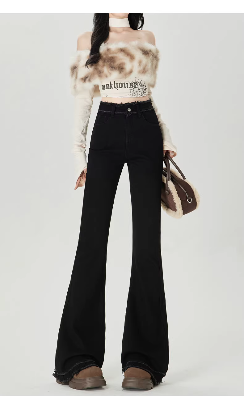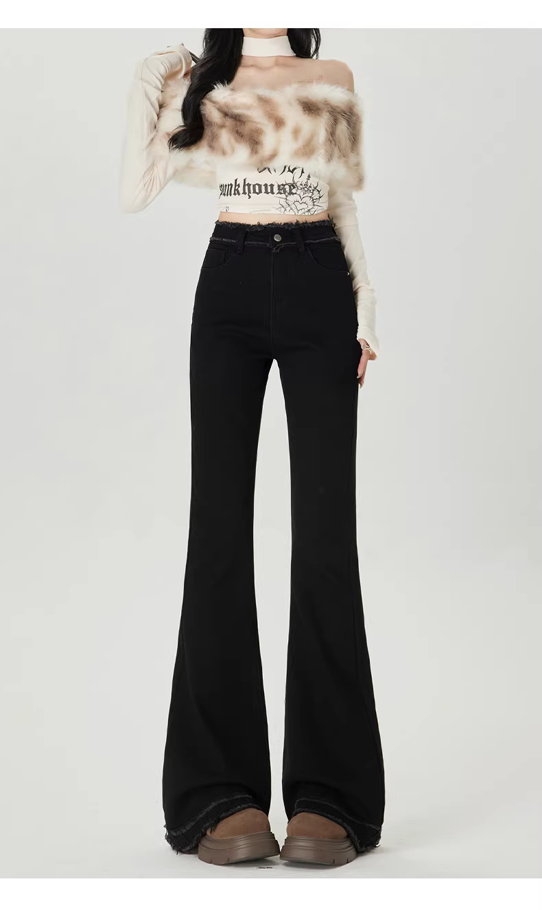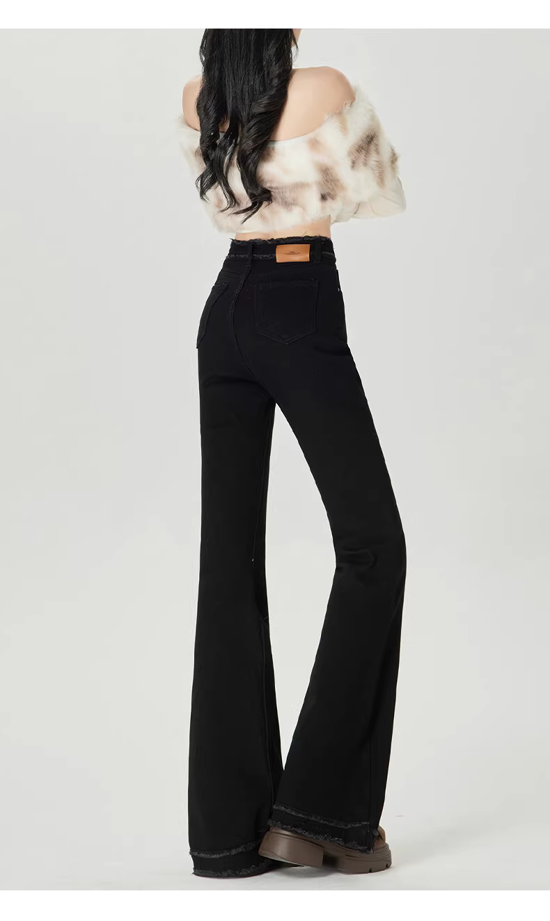 Quần jean nữ La Chapelle lót lông cừu đen dày dặn, dáng loe, mùa thu đông 2025, cạp cao, viền xù, kiểu chuông