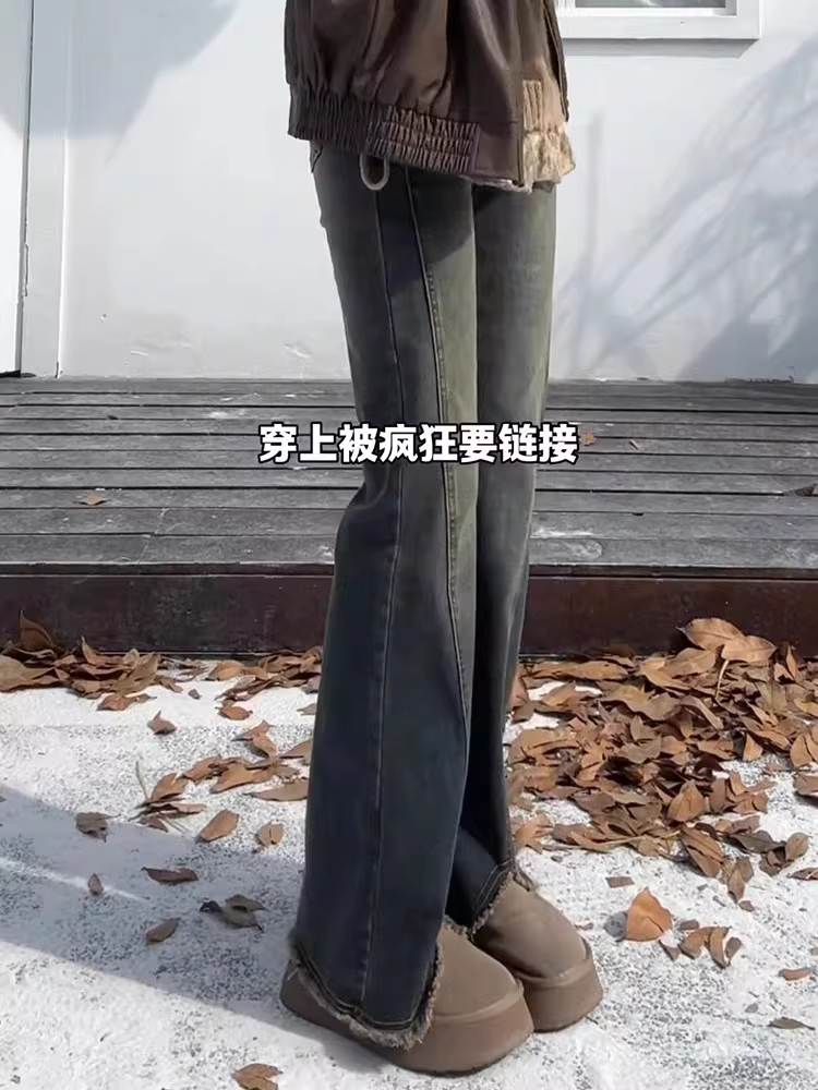 Quần jean nữ La Chapelle lót lông, kiểu dáng loe, mùa thu đông 2025, cạp cao, dáng nhỏ nhắn, ống chuông