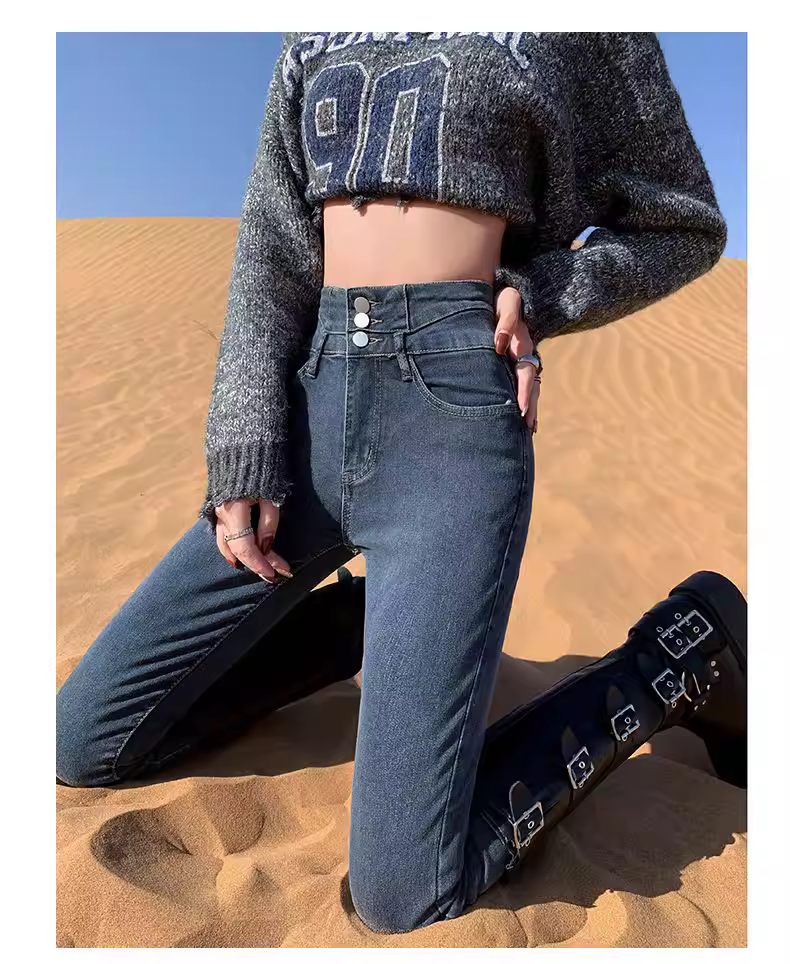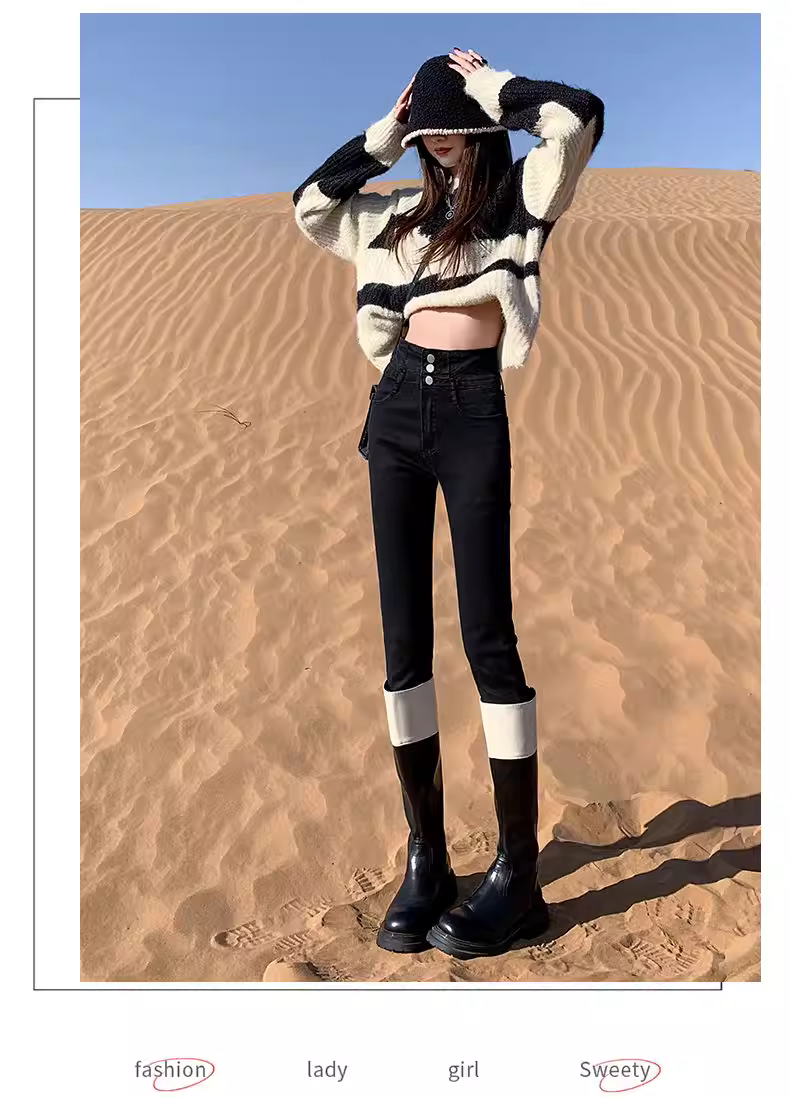 Quần jean nữ La Chapelle màu đen, lót lông cừu, dày dặn, ôm dáng, kiểu dáng bút chì, cạp cao, tôn dáng, mới thu đông 2025