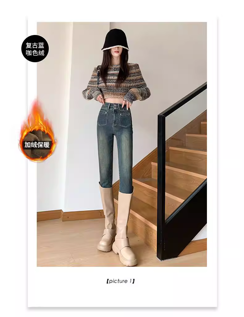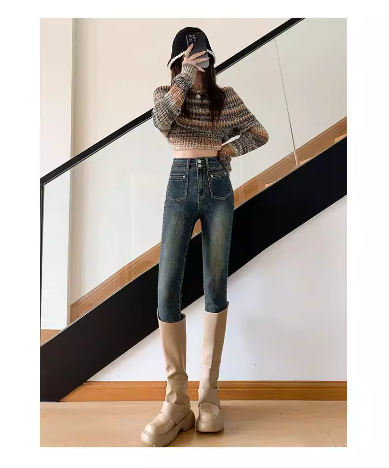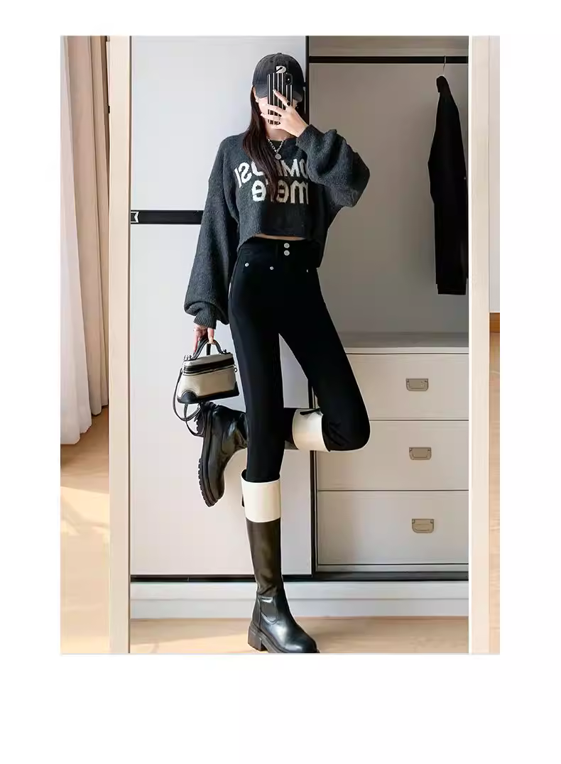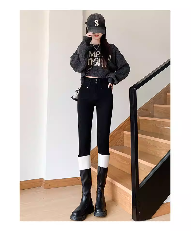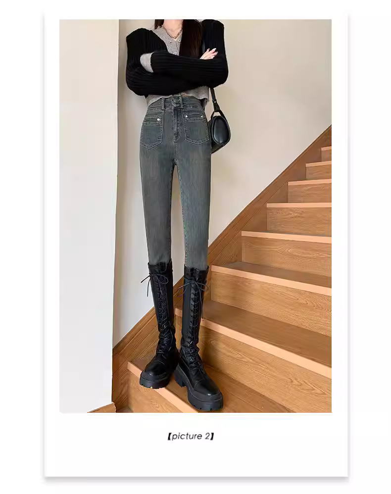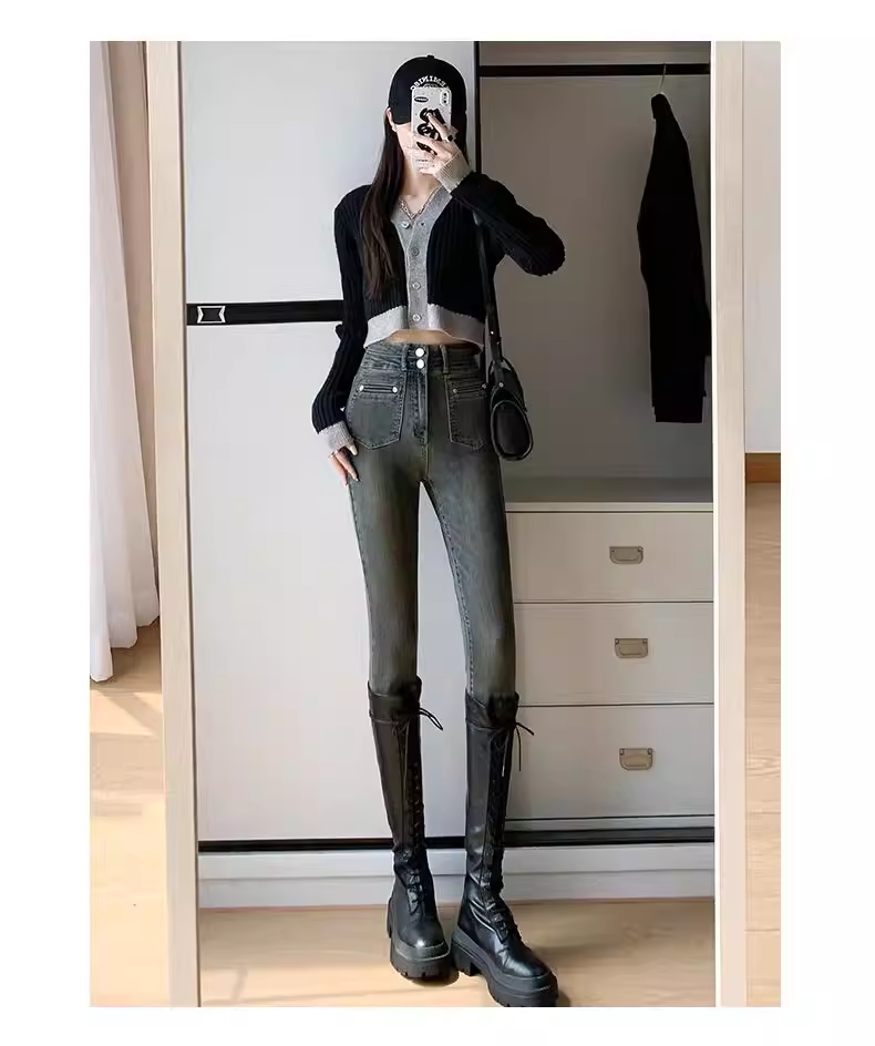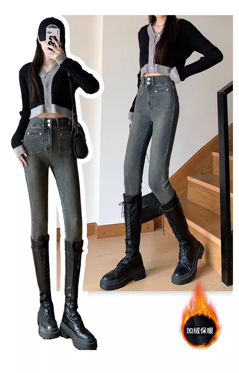 Quần jean nữ La Chapelle màu xám, lót lông cừu, dày, ôm sát, kiểu dáng mới thu đông 2025, cạp cao, co giãn, dáng ôm.