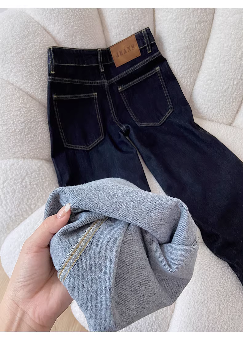 Quần jean nữ La Chapelle màu xanh đậm, lót lông, dáng loe, mùa thu đông 2025, kiểu dáng mới, cạp cao, tôn dáng.