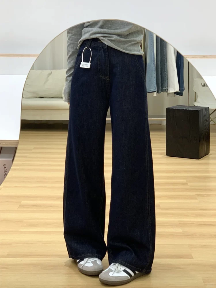 Quần jean nữ màu xanh đậm, dáng thẳng ôm dáng, kiểu mới thu đông 2025, size lớn, cạp cao, che hông, quần ống rộng tôn dáng.
