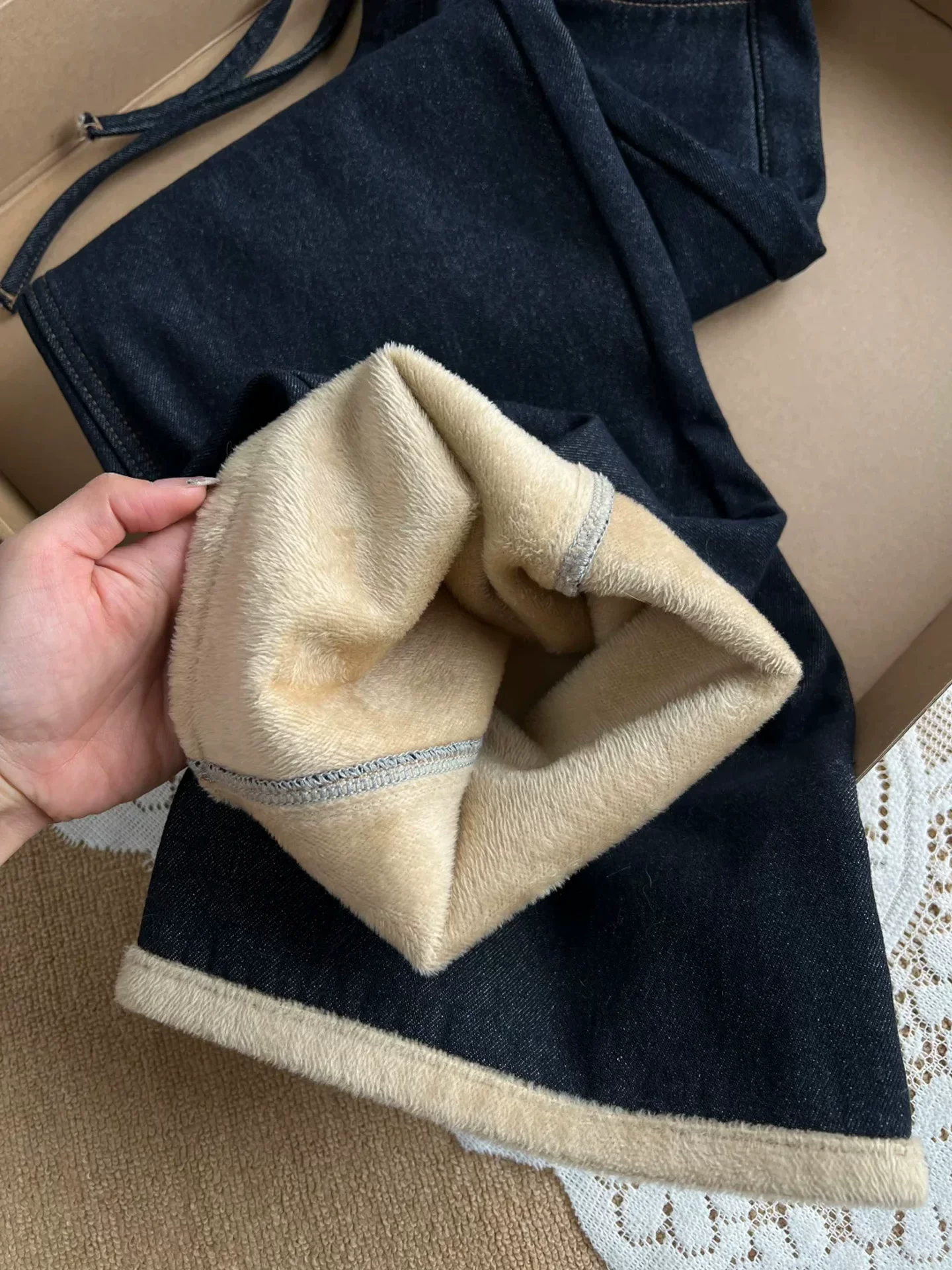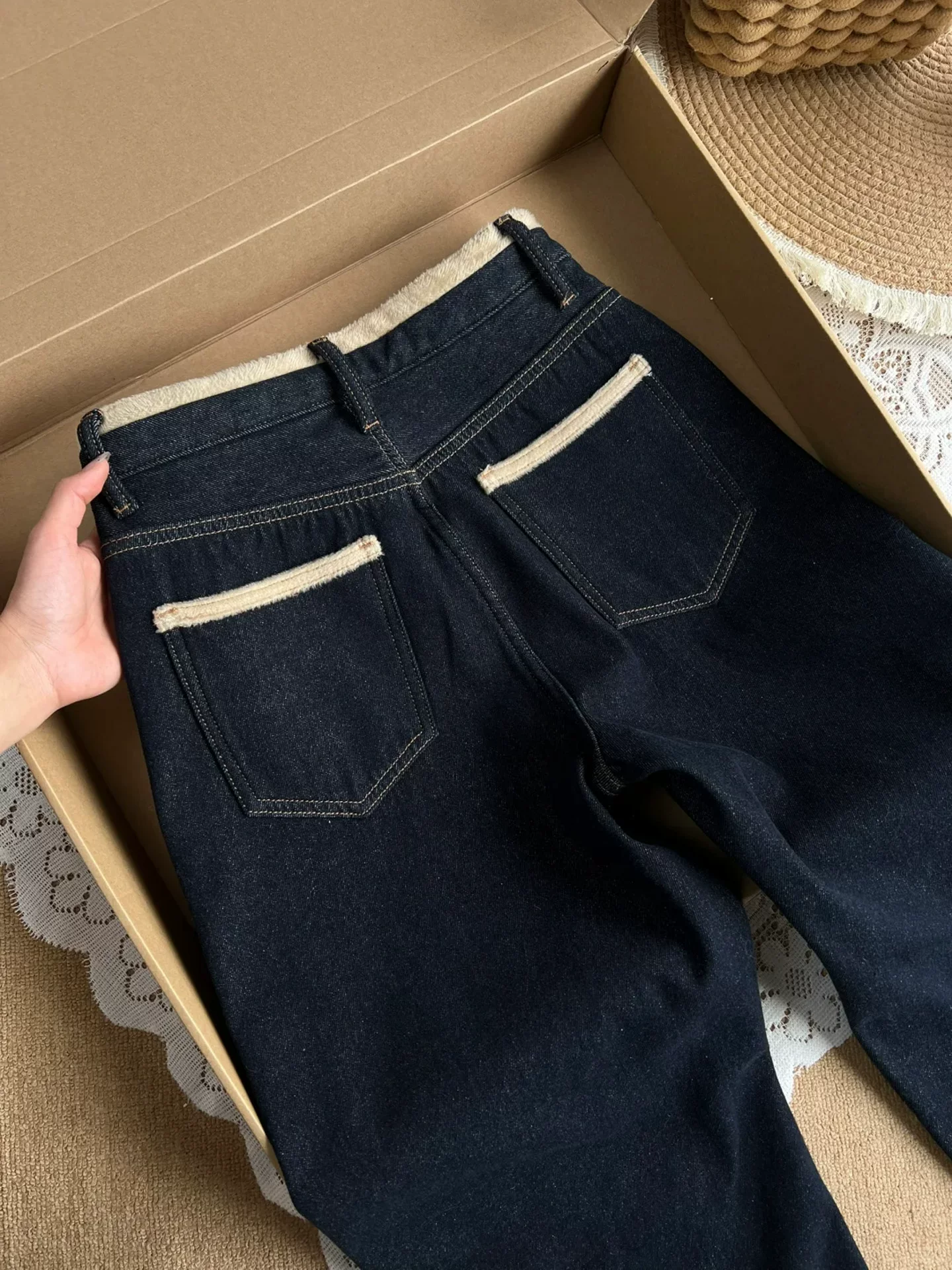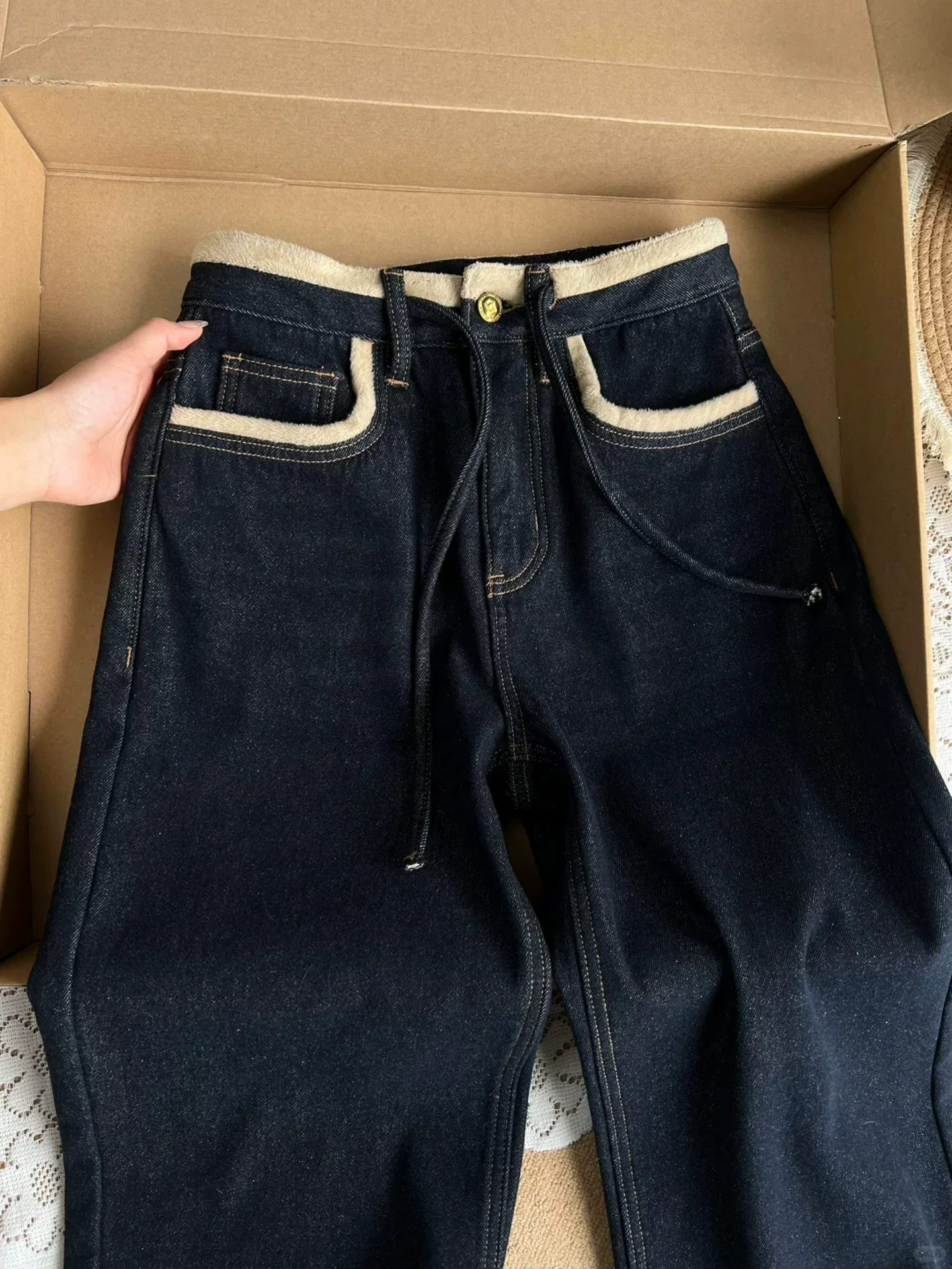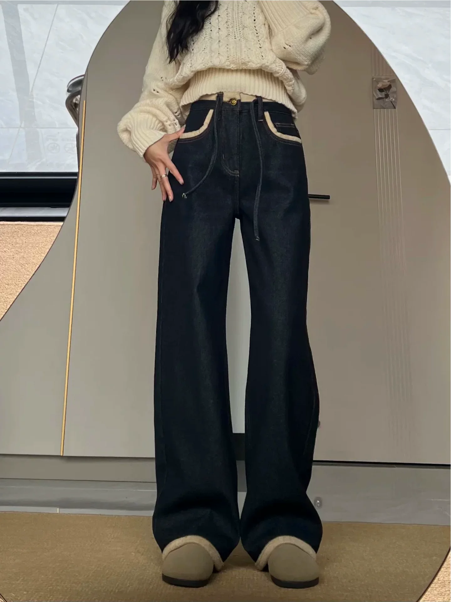 - Quần jean nữ ống đứng dày, lót lông cừu màu xanh đậm, mùa đông 2025, size lớn, cạp cao, dáng rộng, tôn dáng, quần ống rộng.