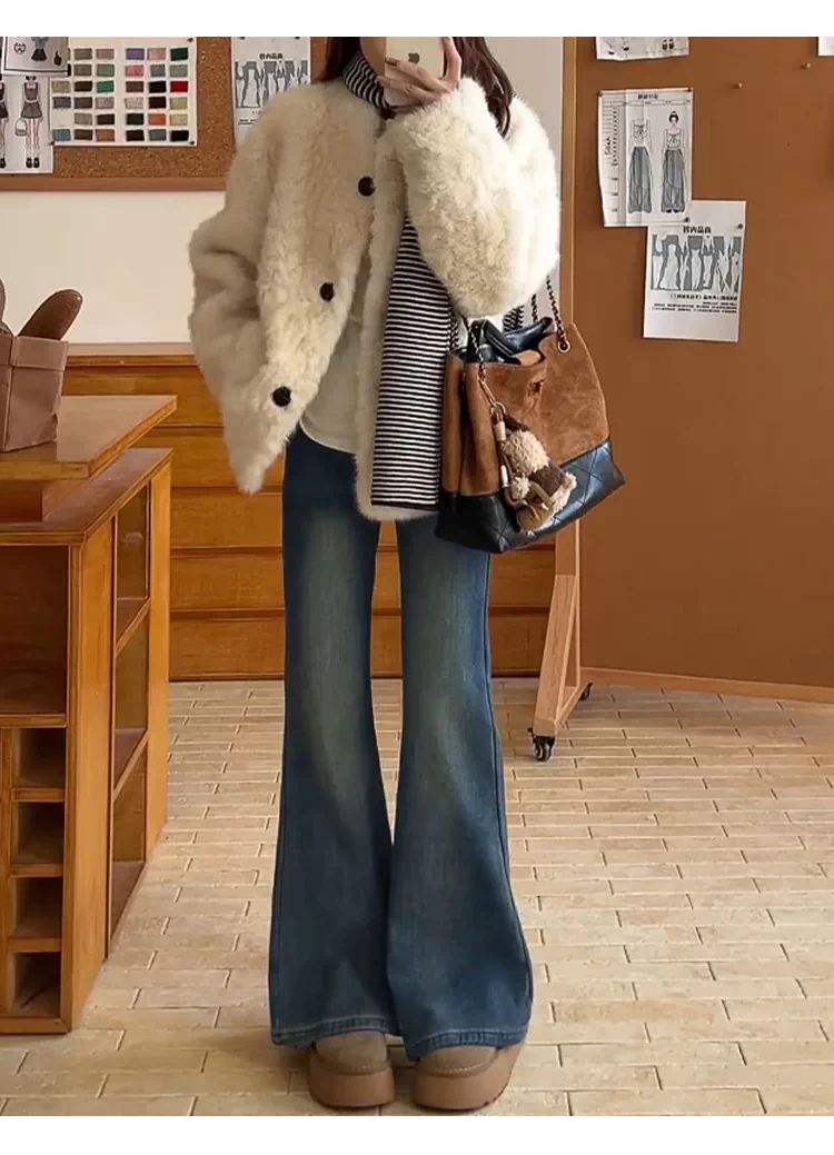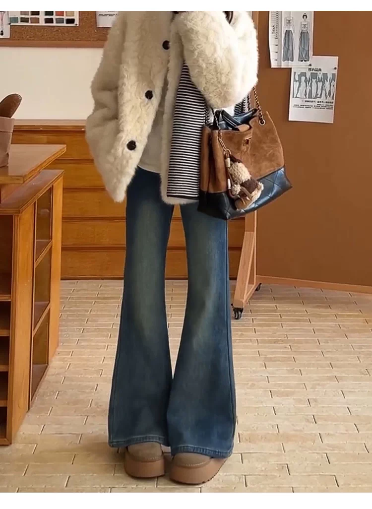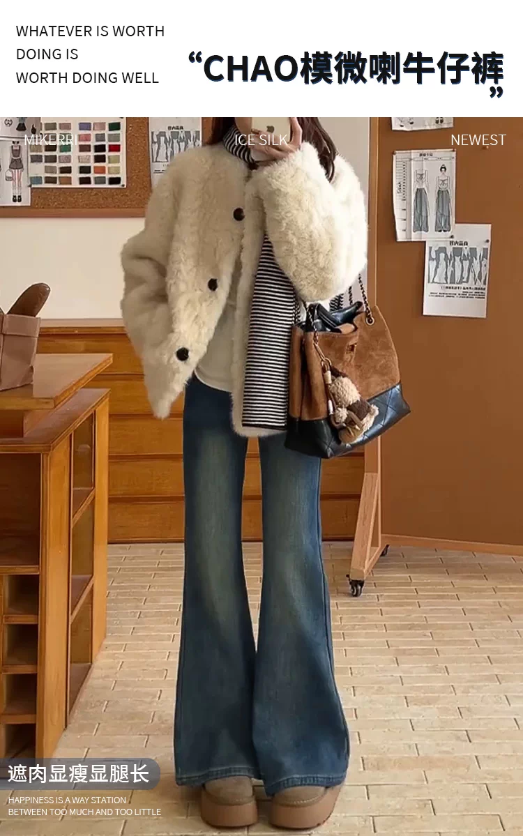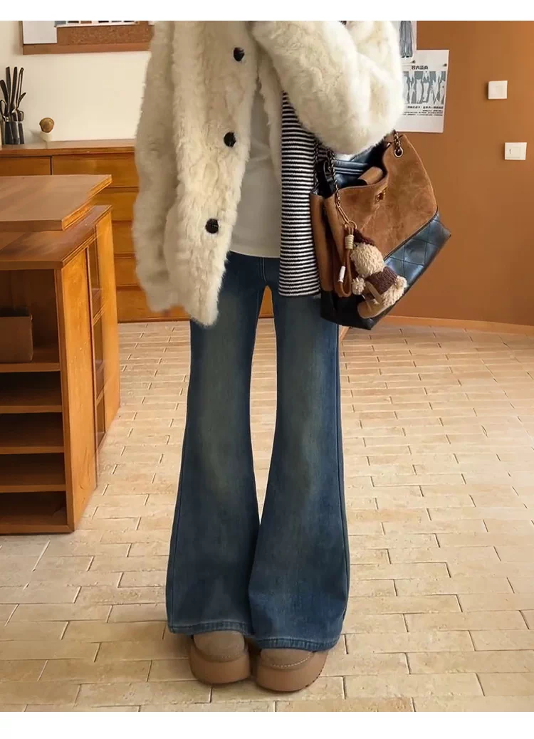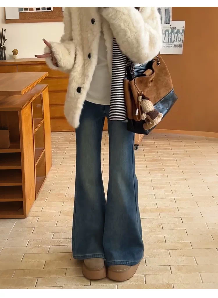 - Quần jean nữ ống loe cạp cao cổ điển, size lớn, lót lông cừu, co giãn, tôn dáng, quần ống chuông, quần ống loe giữ ấm mùa đông.