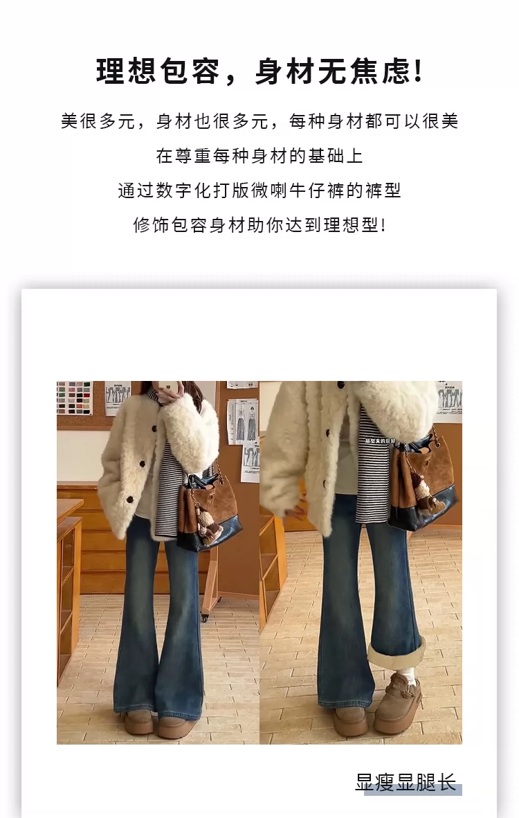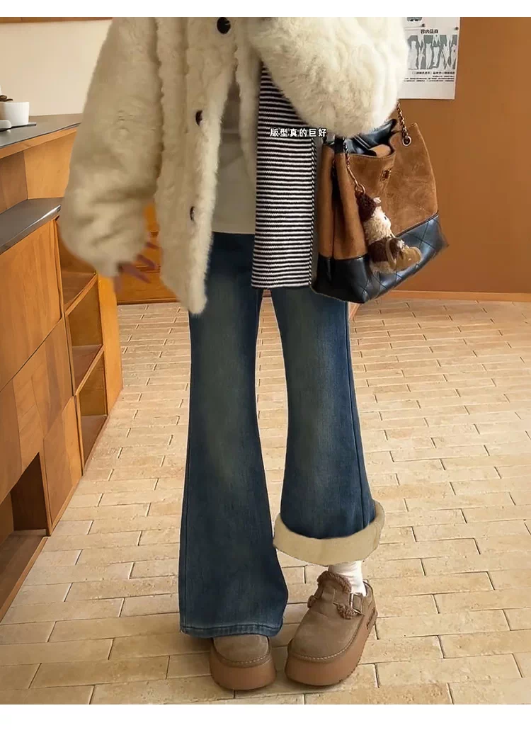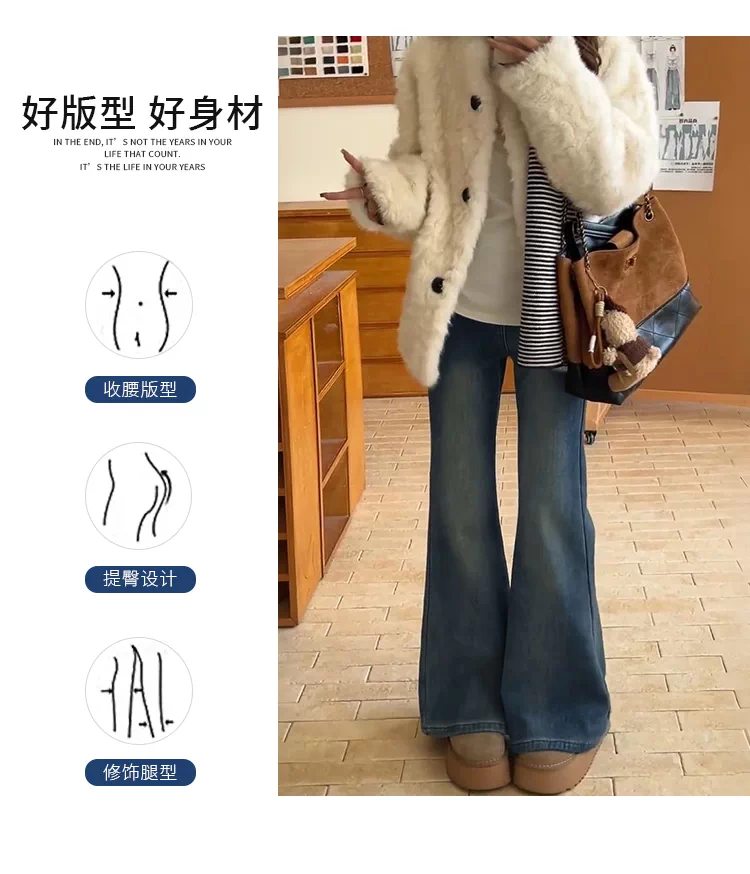 Quần jean nữ ống loe cạp cao cổ điển, size lớn, lót lông cừu, co giãn, tôn dáng, quần ống chuông, quần ống loe giữ ấm mùa đông.