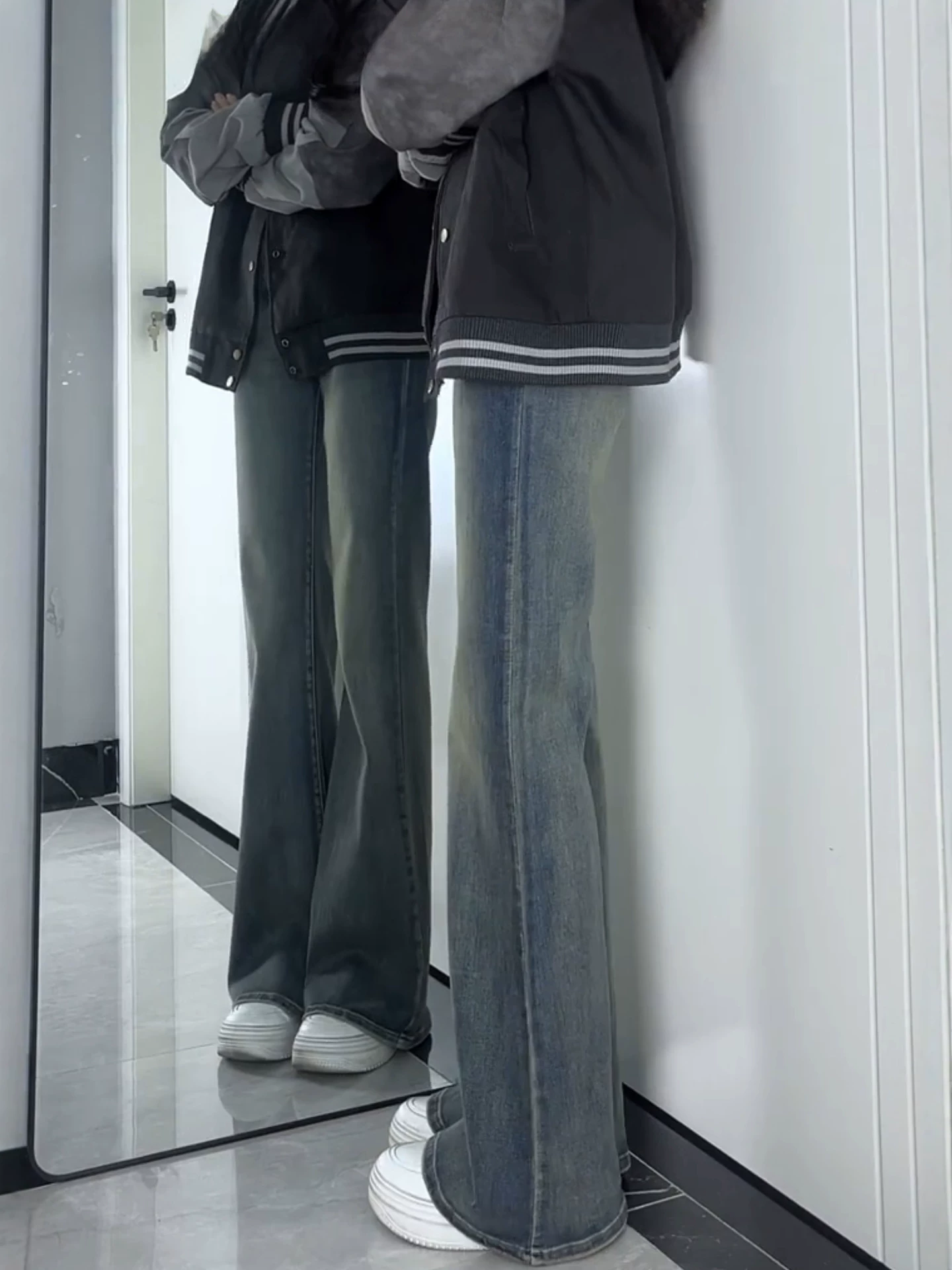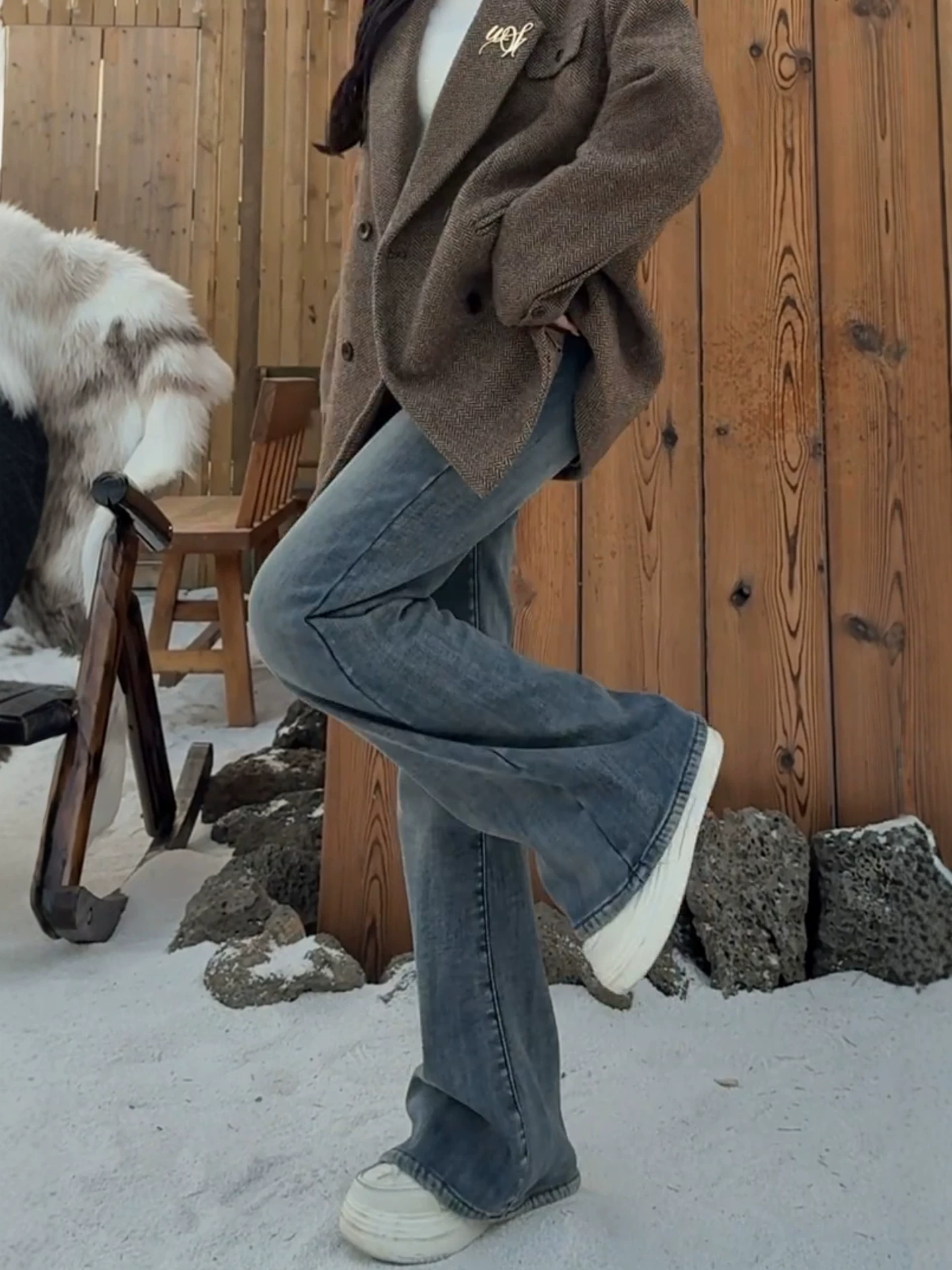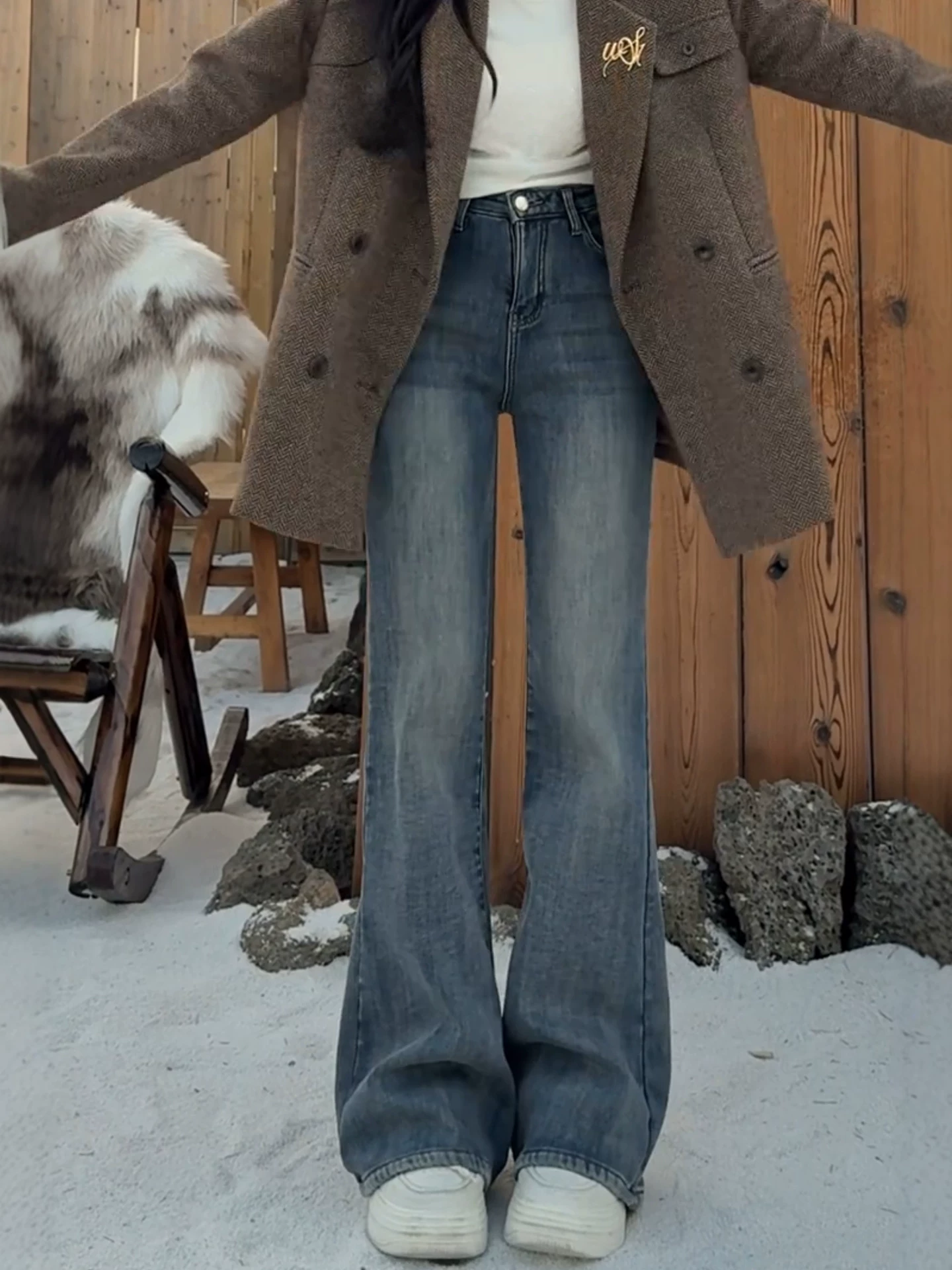 - Quần jean nữ ống loe cạp cao cổ điển, thu đông, size lớn, lót lông cừu, dày dặn, tôn dáng, che hông, quần dài ống loe
