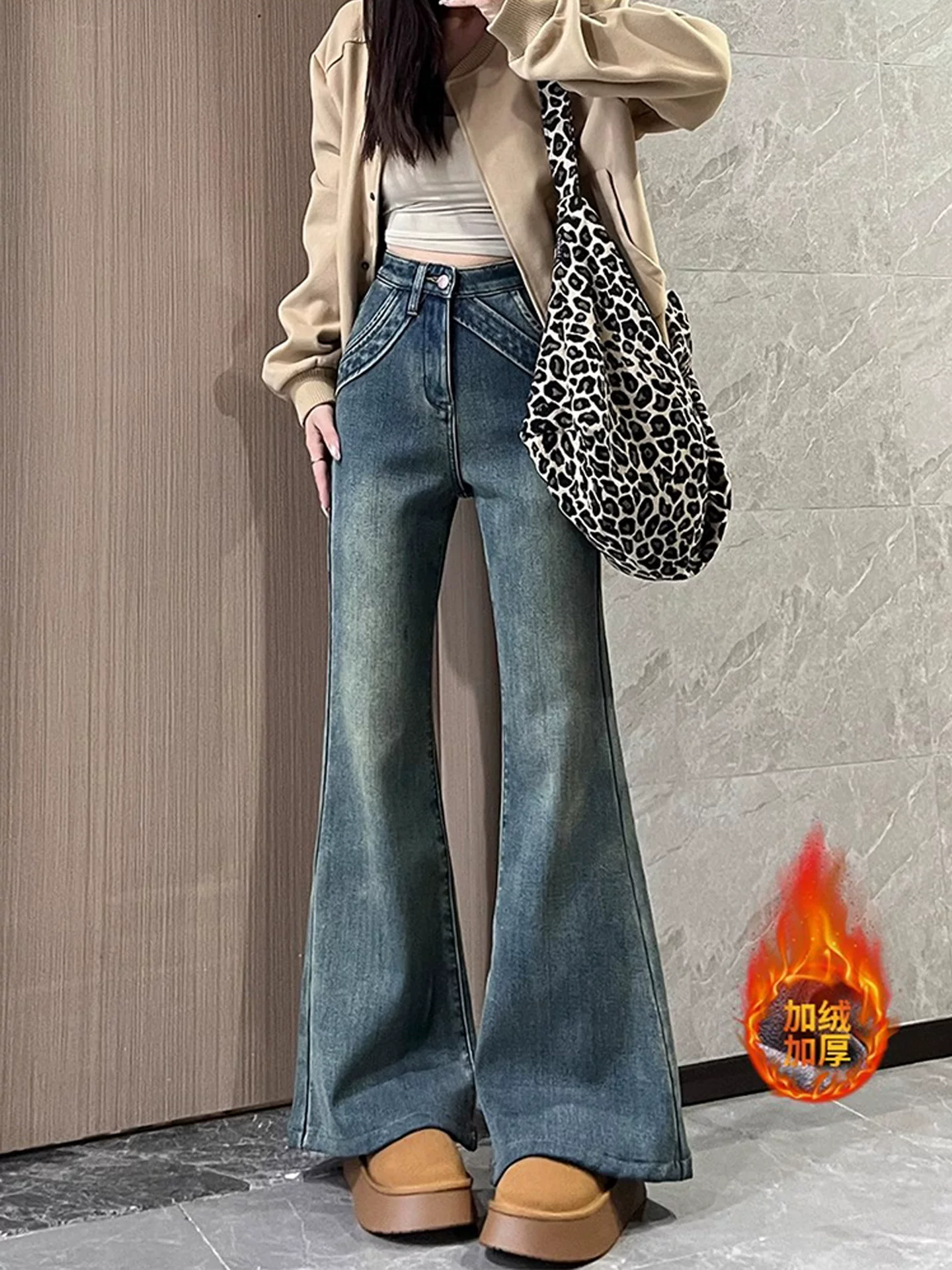 Quần jean nữ ống loe cạp cao dày dặn lót lông cừu, thu đông 2025, size lớn, co giãn, tôn dáng, kiểu bootcut